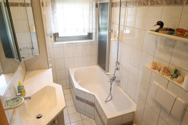Die Wohnung im Erdgeschoss besitzt eine Küche mit Einbaumöbel, die am holzverzierten Esszimmer anliegt. Verbunden mit dem Esszimmer ist auch das gemütliche Wohnzimmer. In unmittelbarer Entfernung des Eingangs zur Erdgeschoss Wohnung befindet sich ein modernes Bad mit Toilette. Gegenüber vom Badezimmer befindet sich zudem ein geräumiges Schlafzimmer. Über das Wohnzimmer gelangt man auf die besonders schöne, überdachte und windgeschützte Terrasse mit einer Treppe in den Garten.