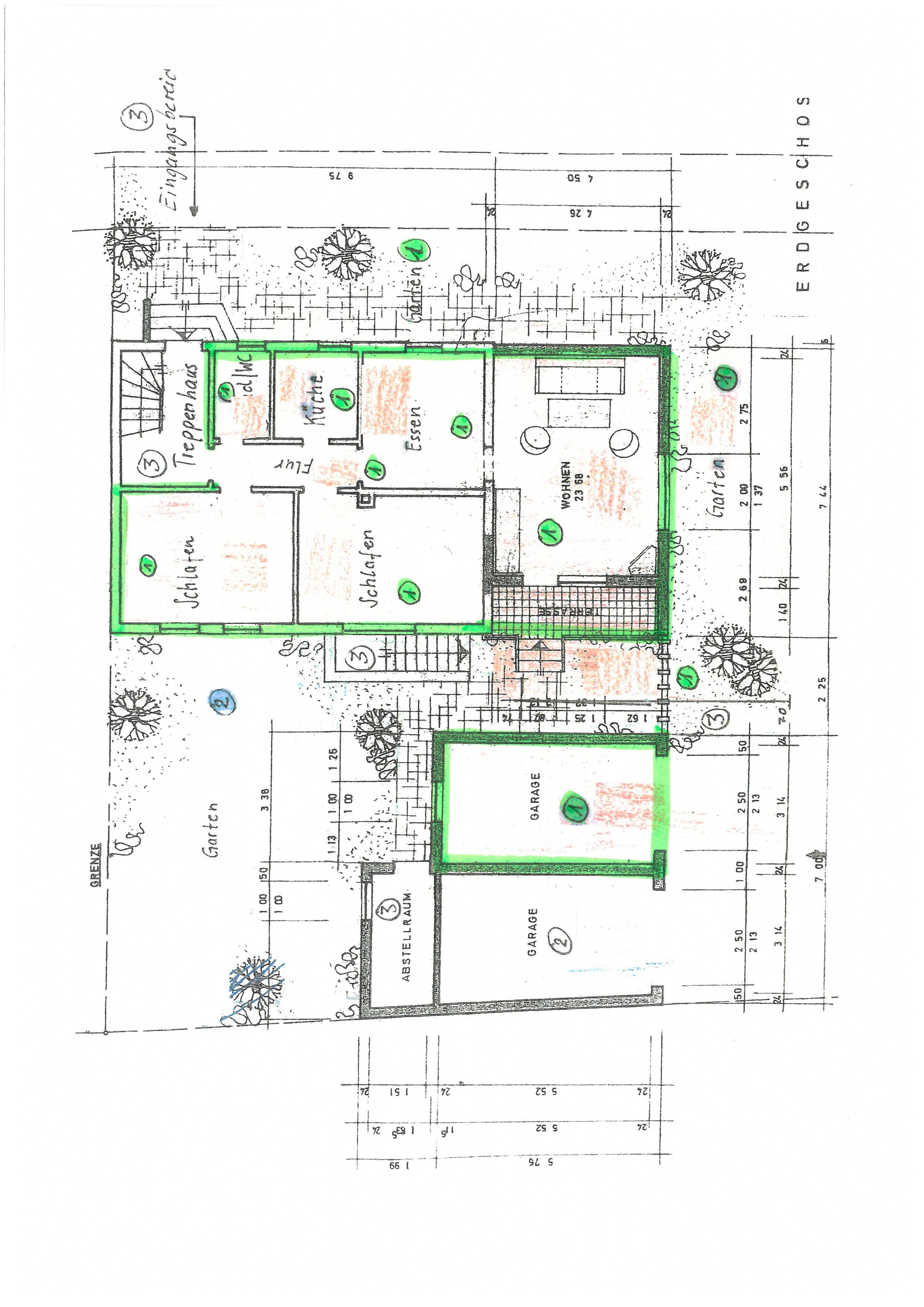 Vor dem Haus ist eine Garage und ein Stellplatz davor, hinter dem Haus ist ein eigener Gartenanteil.