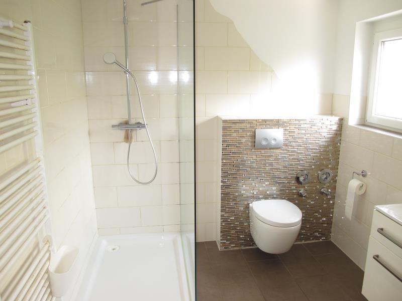 Im 1. Obergeschoss ist der Eingangsbereich der Maisonettewohnung. Vom Flur gelangt man in das moderne Tageslichtbad mit Badewanne, Dusche, Waschtisch, Toilette, beheiztem Handtuchhalter, hier bleiben keine Wünsche offen!