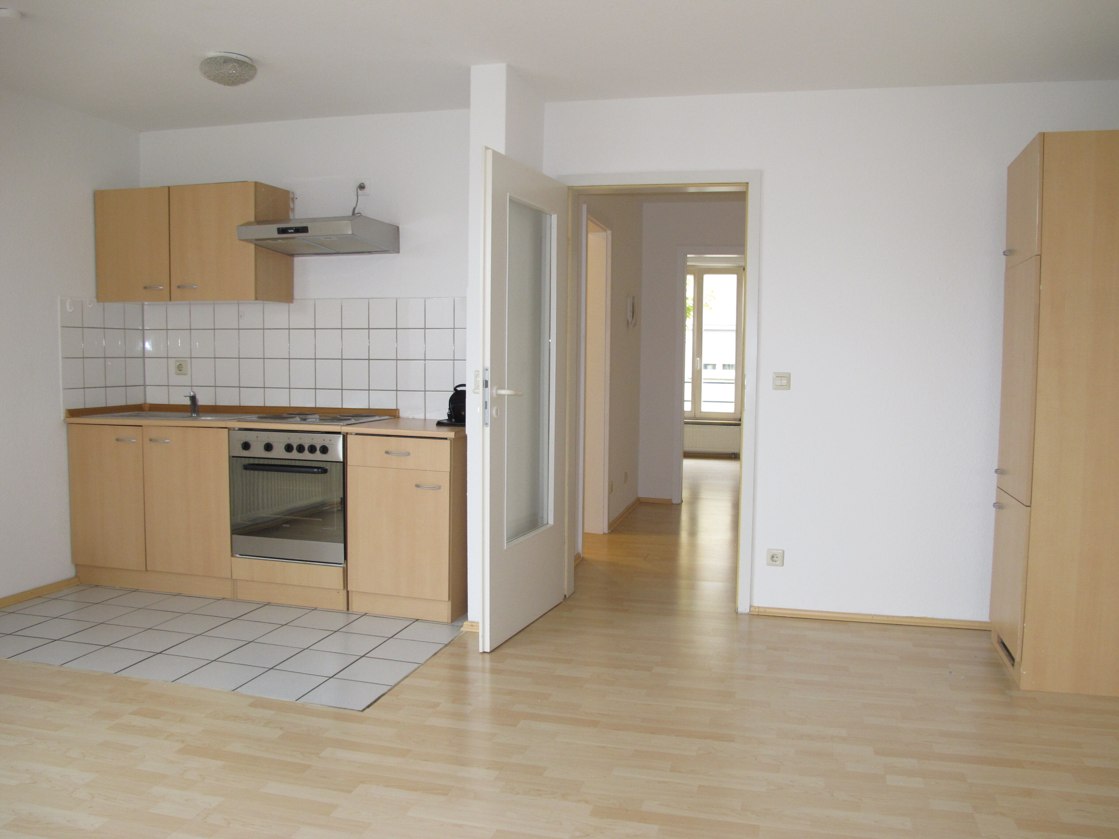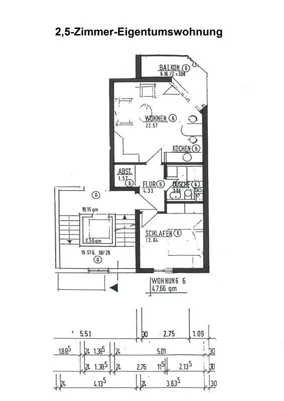 Über das helle und großzügige Treppenhaus erreicht man die Wohnung. Direkt im Flur ist ein Abstellbereich für Ihre Garderobe und vieles mehr. Daneben ist der helle und großzügige Wohnraum mit Küchenzeile. Über die große Verglasung gelangt man auf den Balkon mit einer Größe von ca. 6m²
