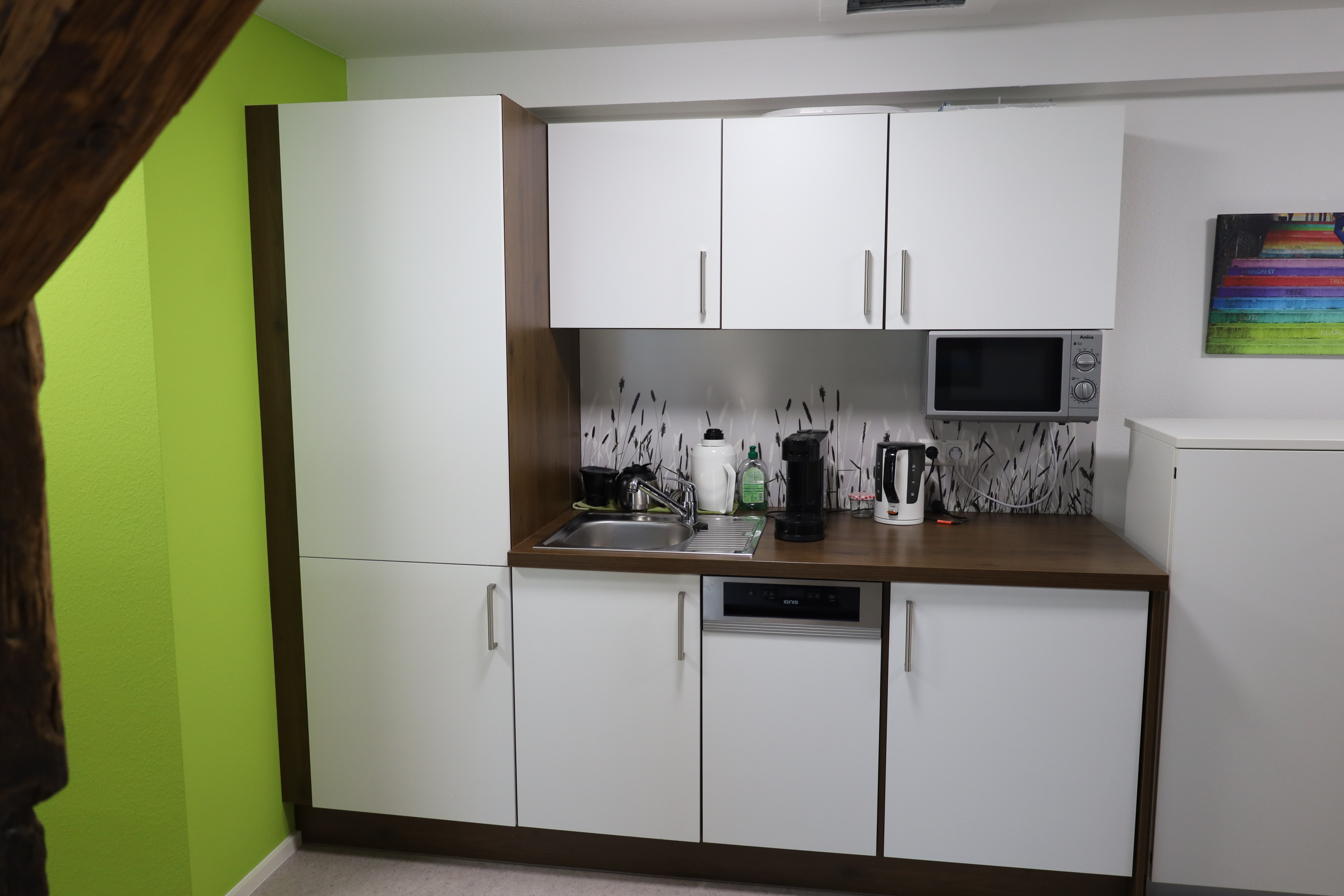Die Teeküche ist perfekt ausgestattet, um eine schnelle Tasse Kaffee oder Tee zu genießen, während die Kunden und Gäste das besondere Ambiente bestaunen.