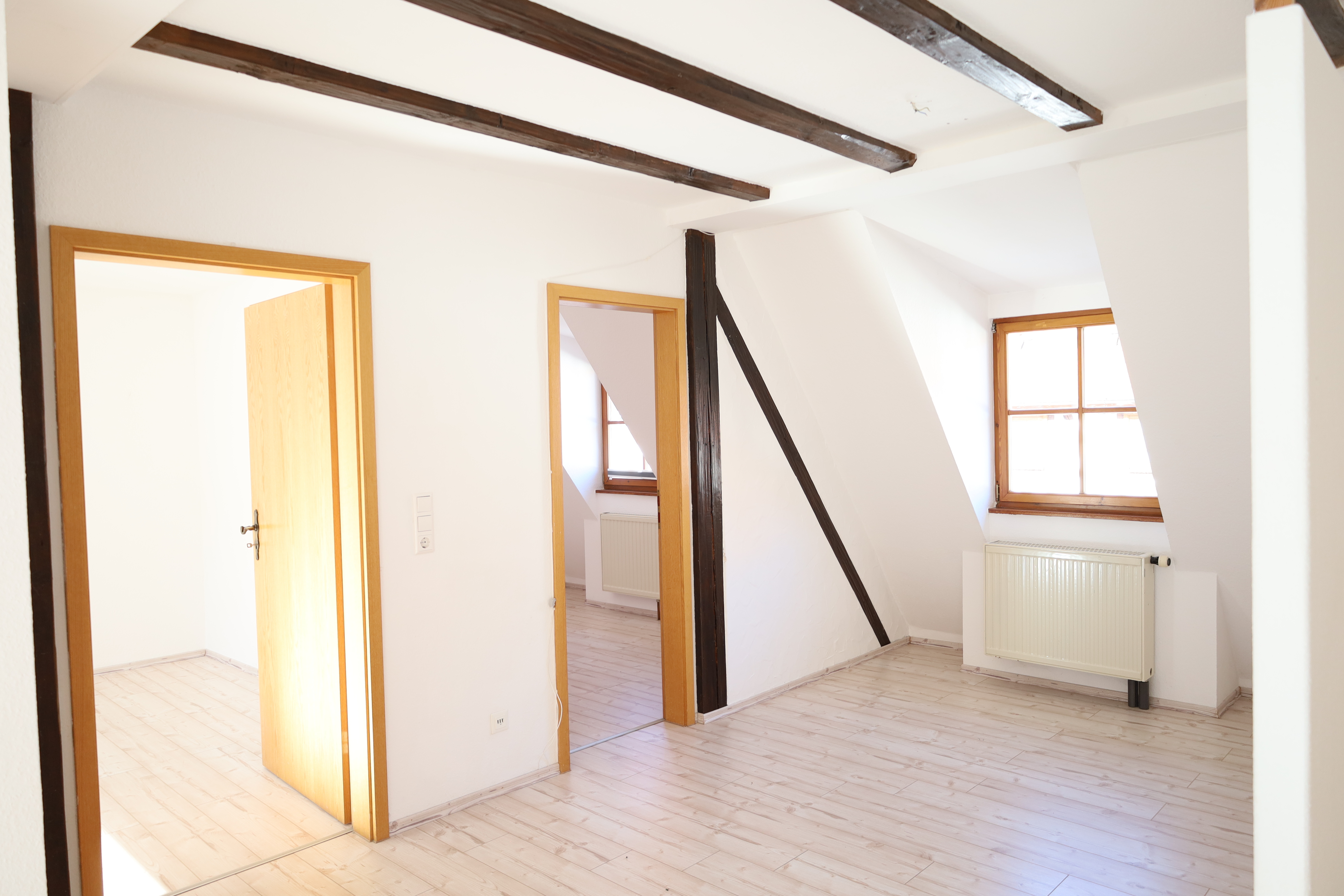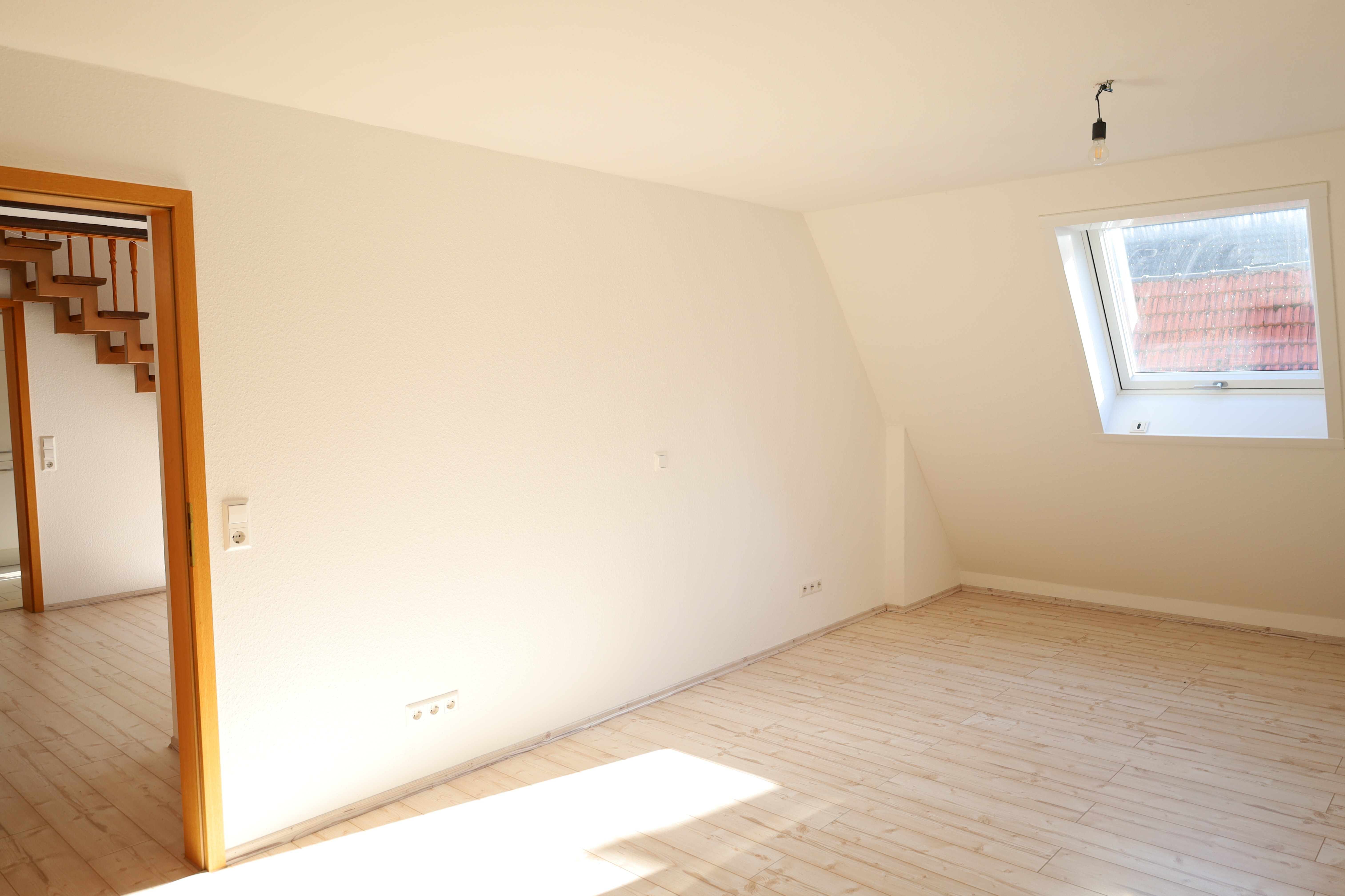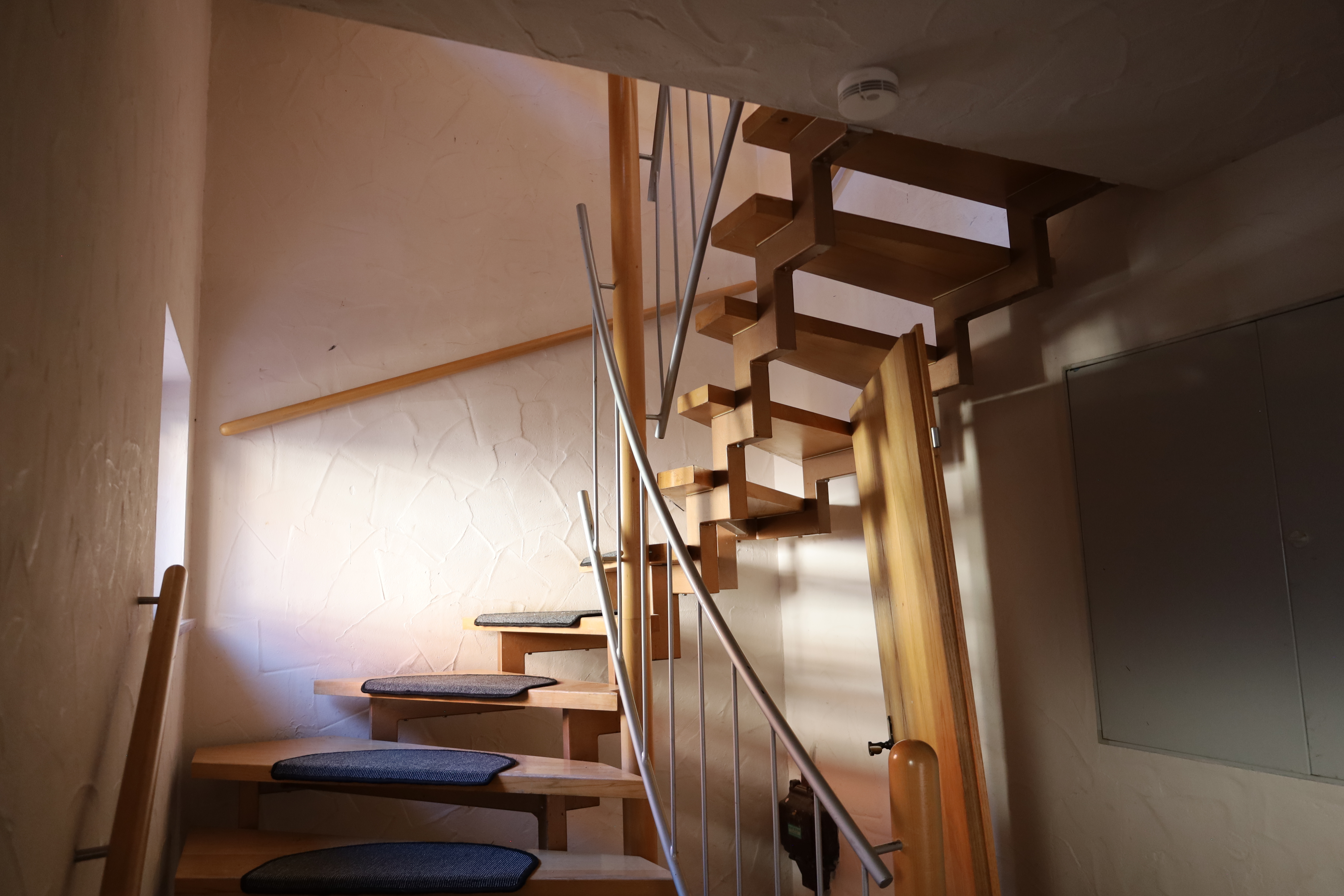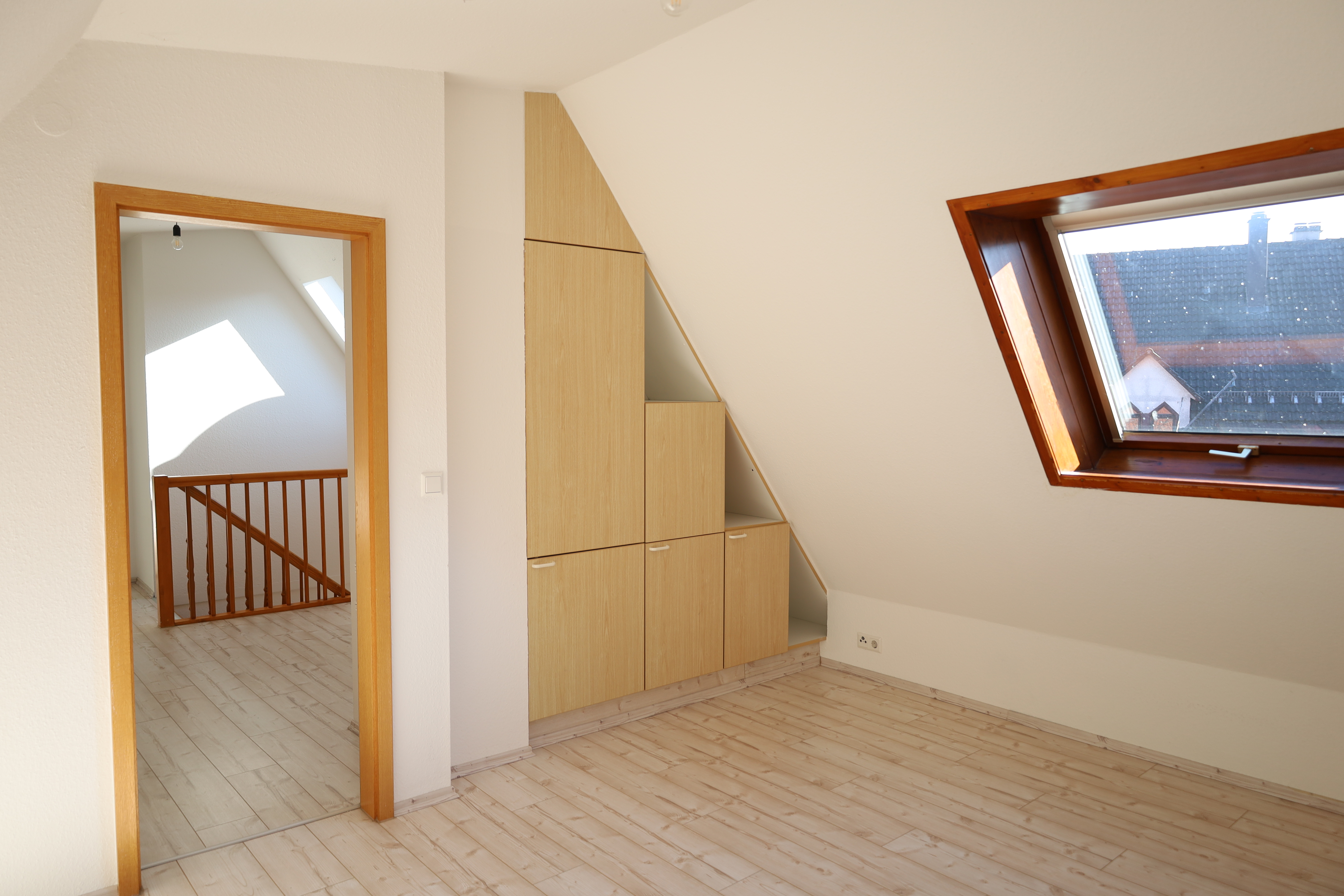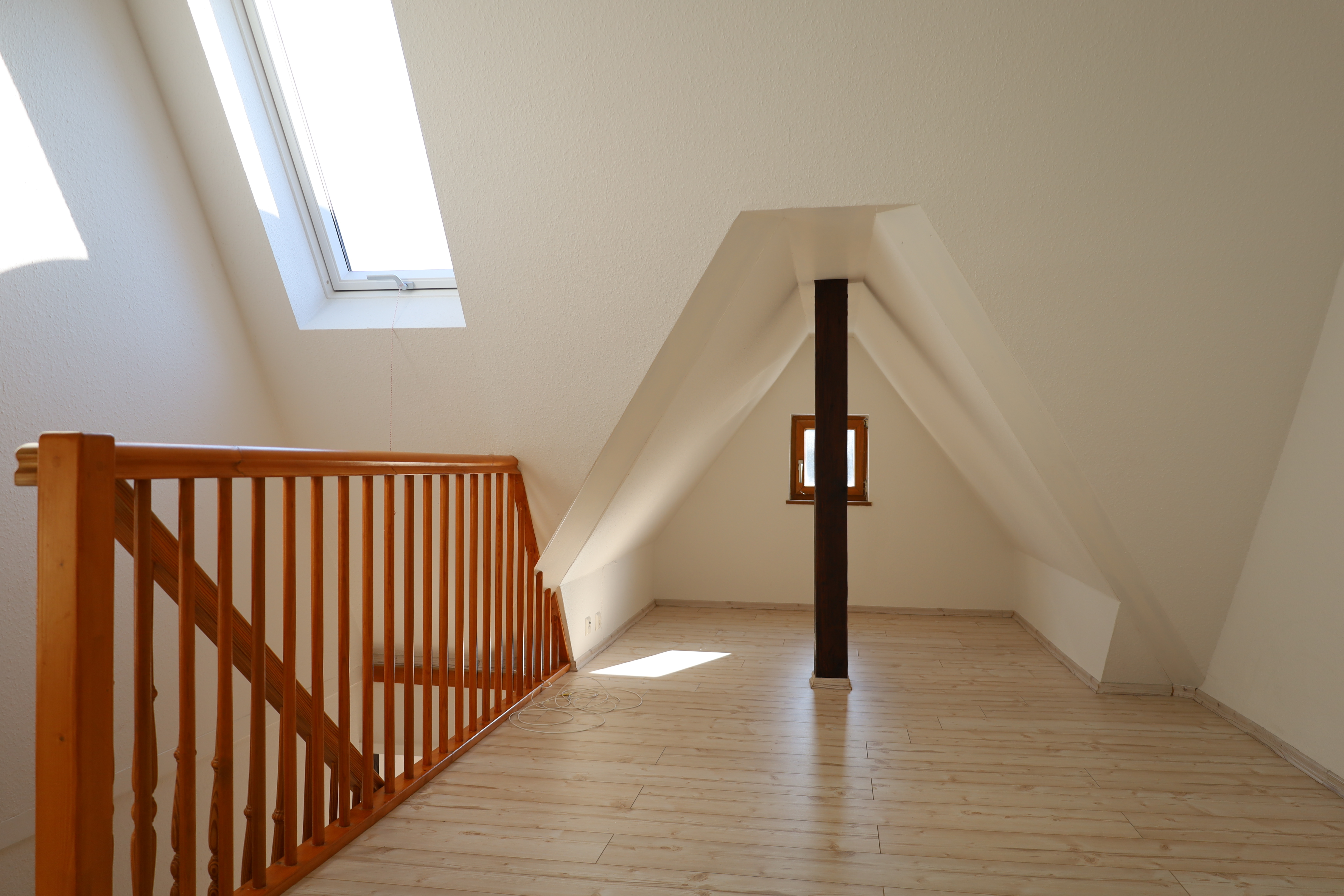 Über eine stilvolle Holztreppe gelangen Sie vom Wohnbereich ins zweite Dachgeschoss. Dort erwarten Sie zwei weitere Zimmer – eines davon ist ein Durchgangszimmer, das flexibel genutzt werden kann, beispielsweise als Ankleidezimmer, Gästezimmer oder Büro. Auch hier erwartet Sie ein weiteres Badezimmer mit Badewanne und großem Dachfenster das für Tageslicht sorgt.