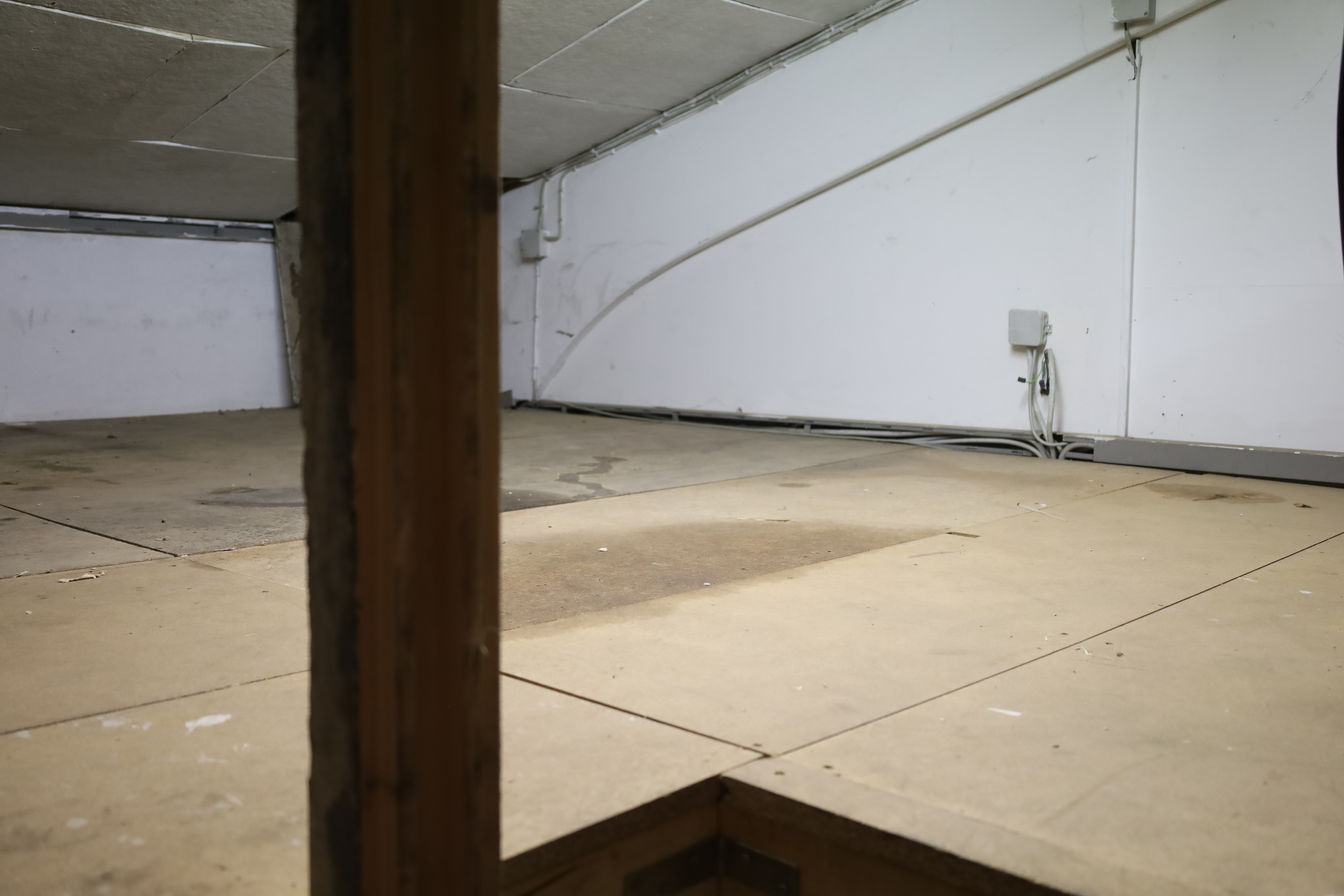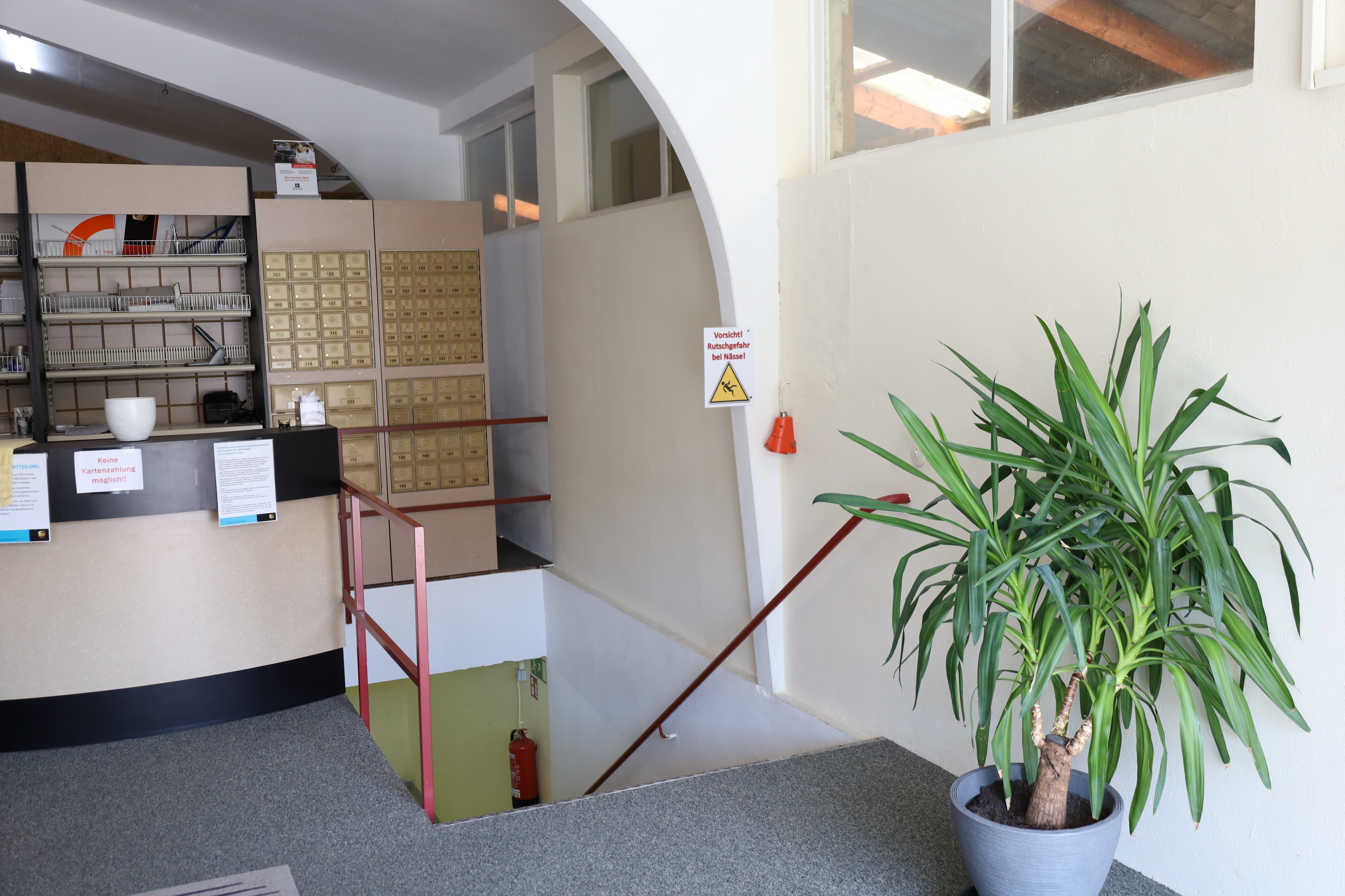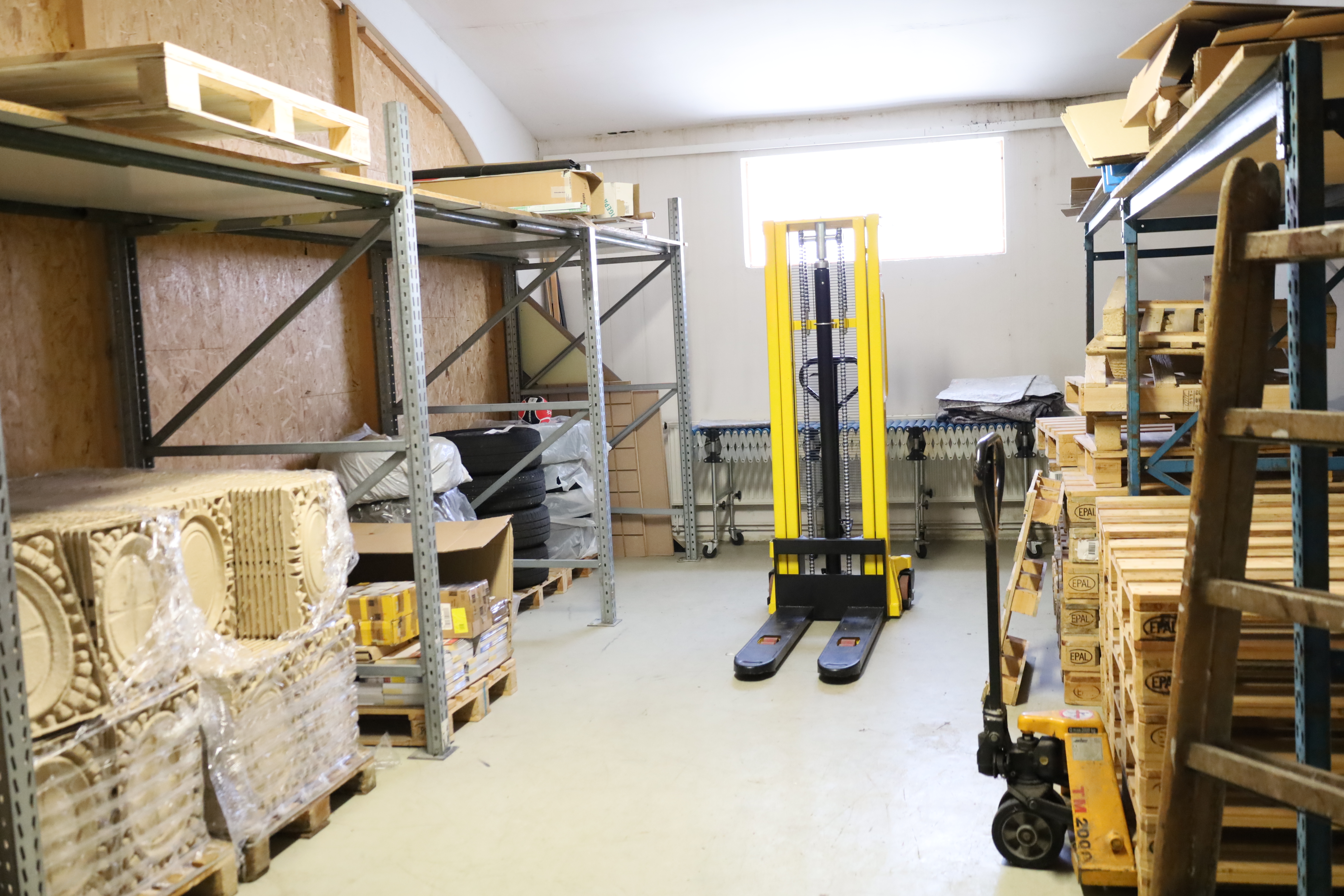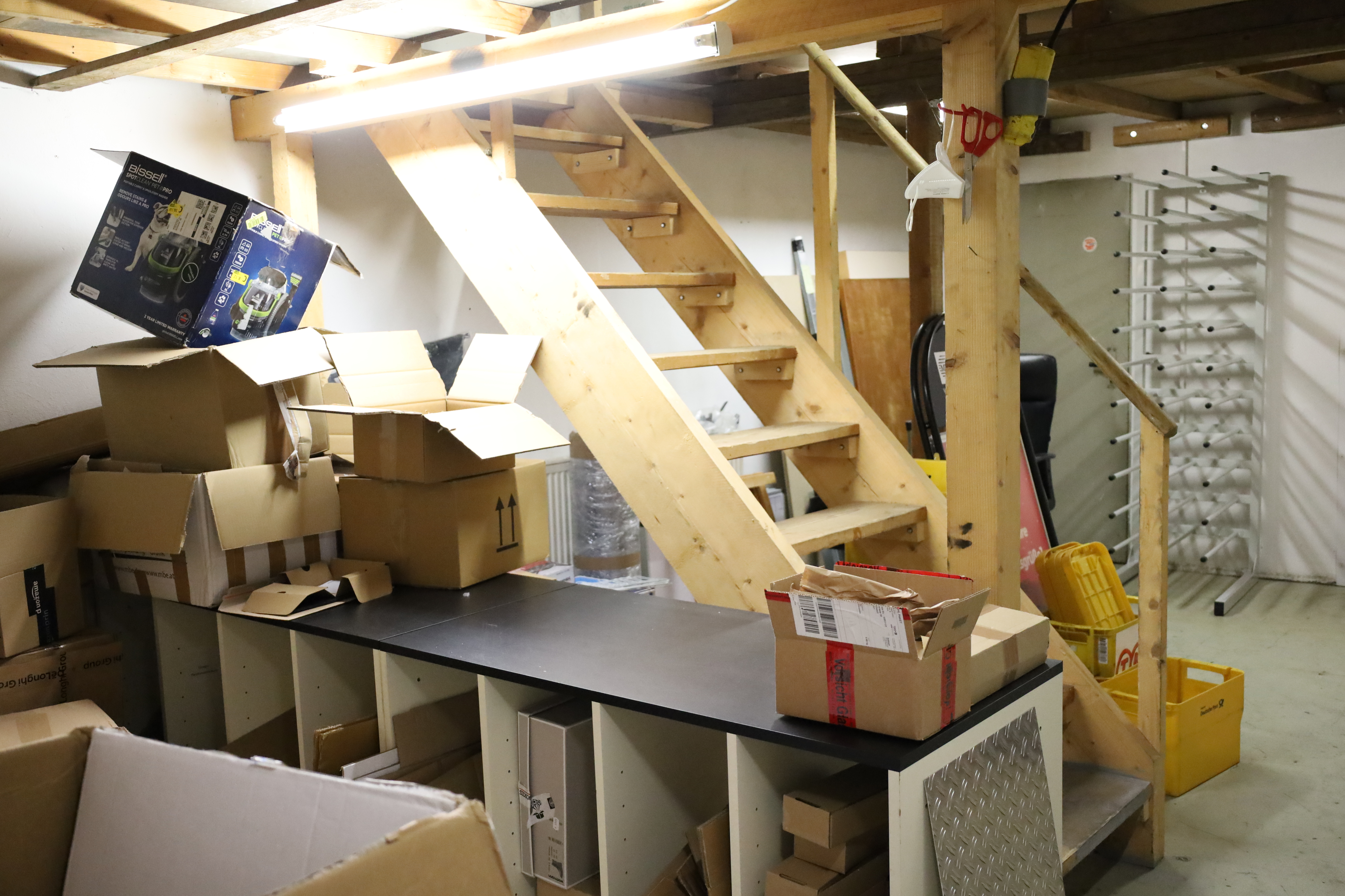 Über eine Holztreppe erreicht man im hinteren Bereich des Gebäudes einen weitere Lagerfläche, hier ist ein Zwischenboden eingezogen.
