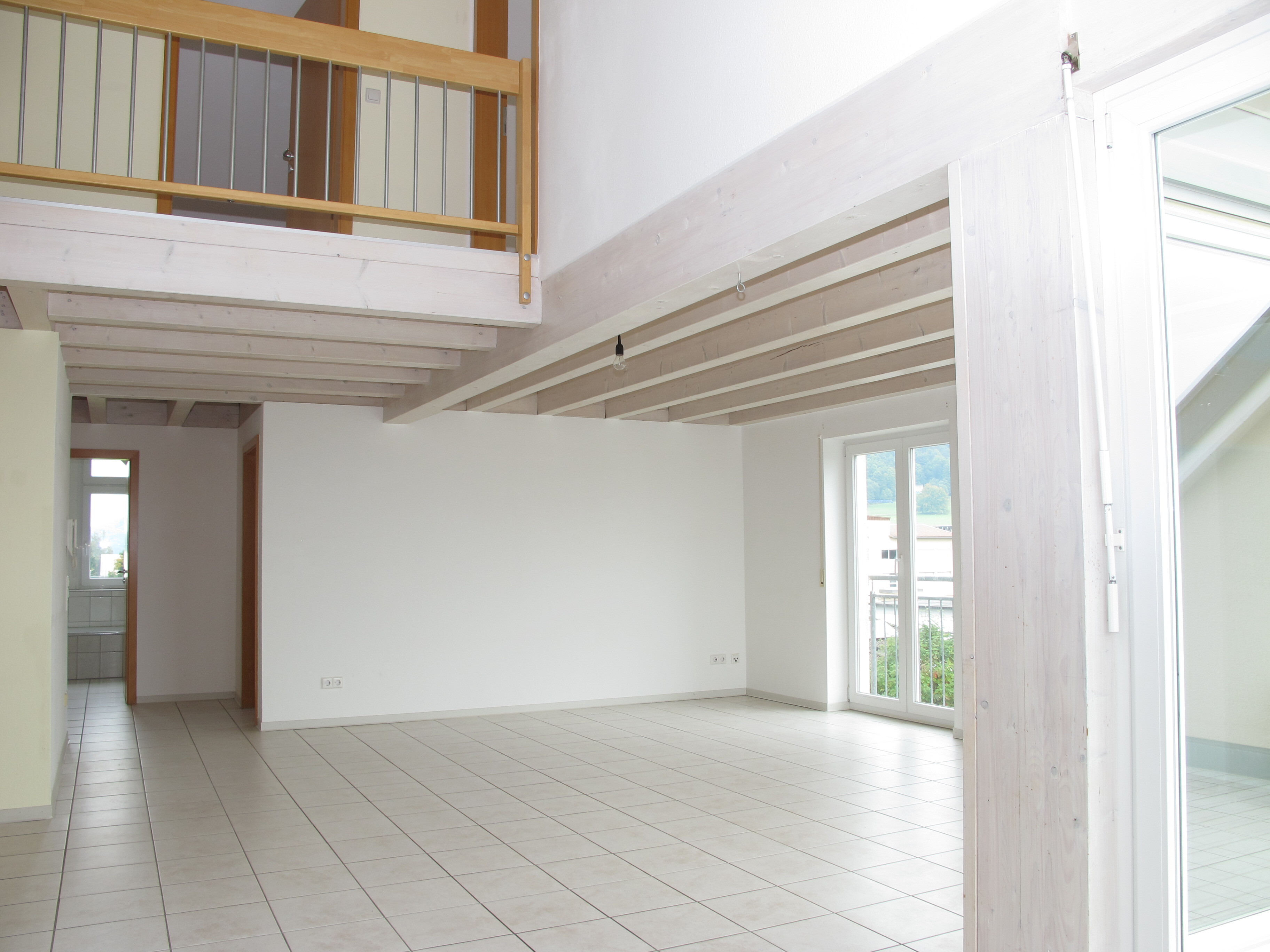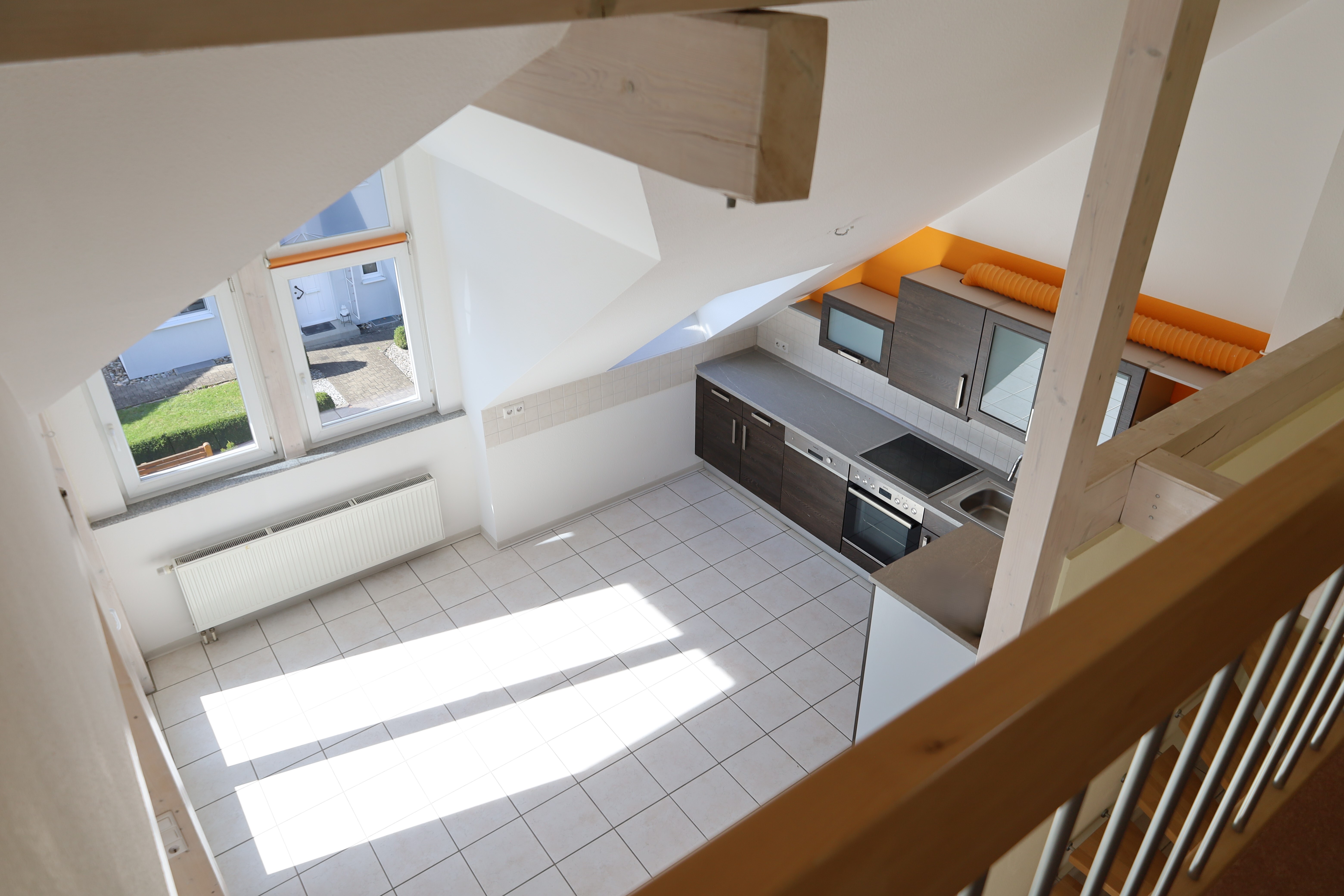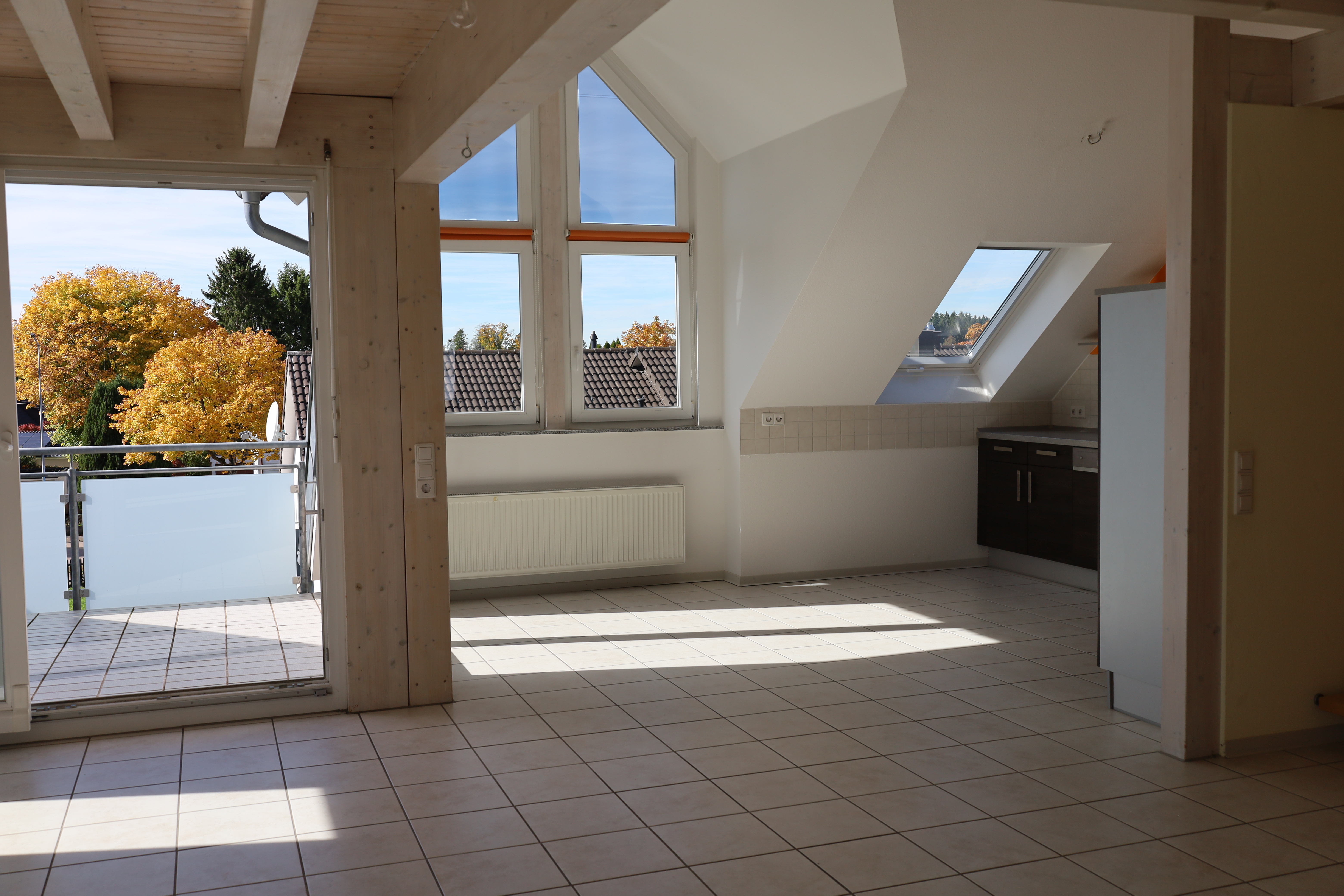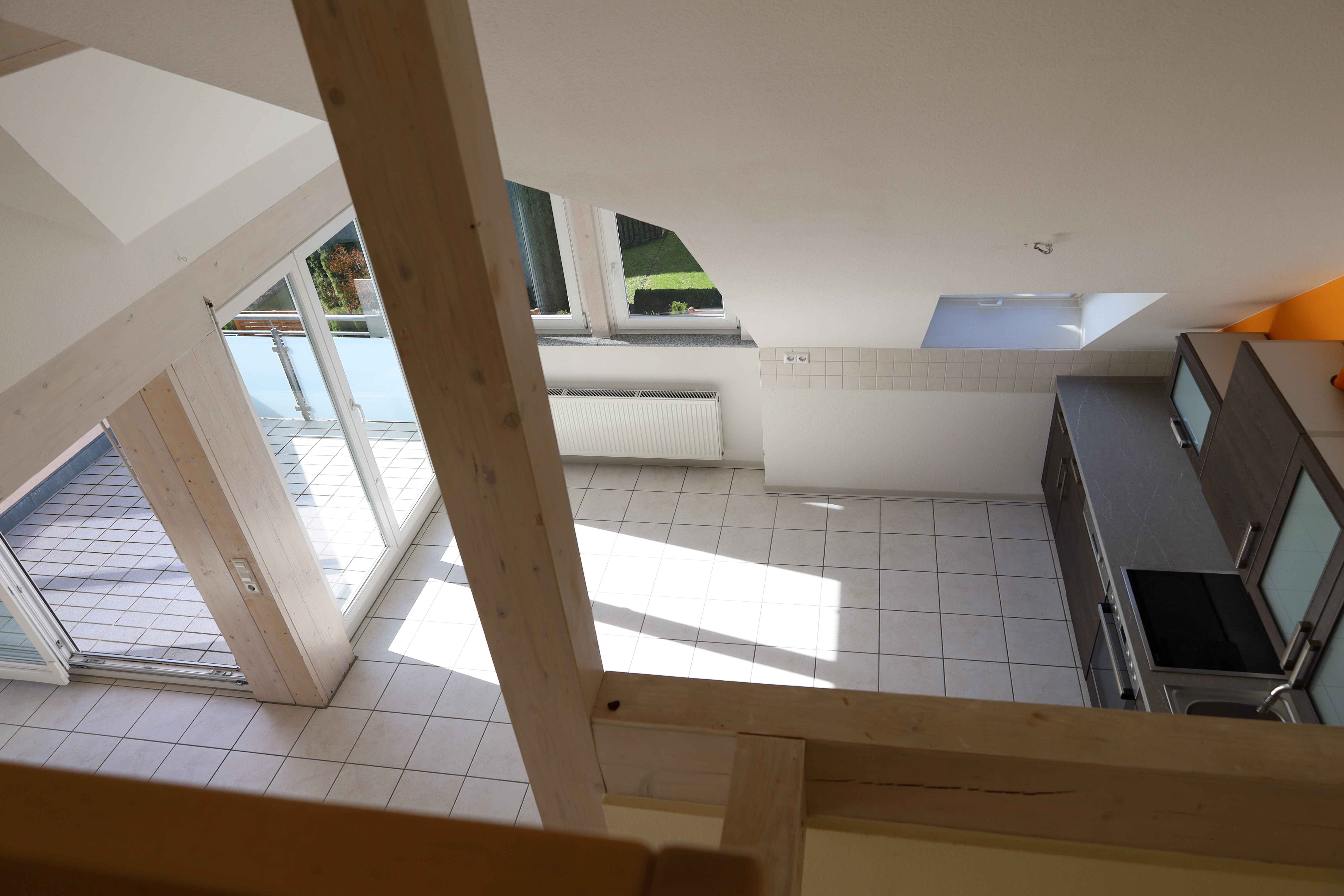 Der großzügige Wohn- und Essbereich mit offener Küche bildet das Herzstück der Wohnung. Große Fensterflächen, sichtbare Holzbalken und hohe Decken schaffen ein helles und gemütliches Ambiente. Von hier aus gelangen Sie direkt auf die sonnige Dachloggia mit Süd-West-Ausrichtung.