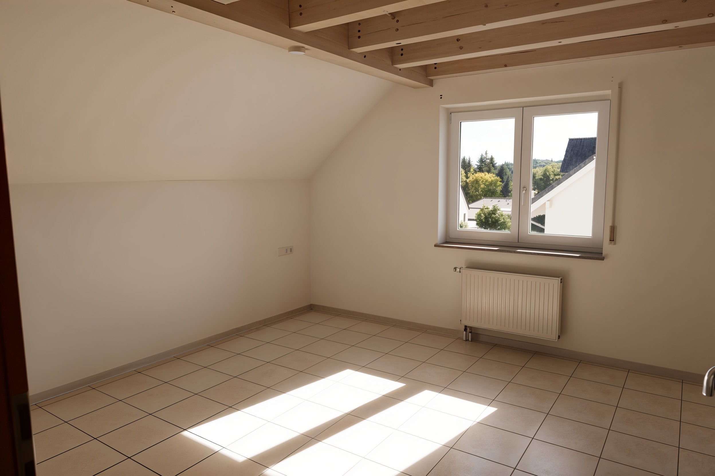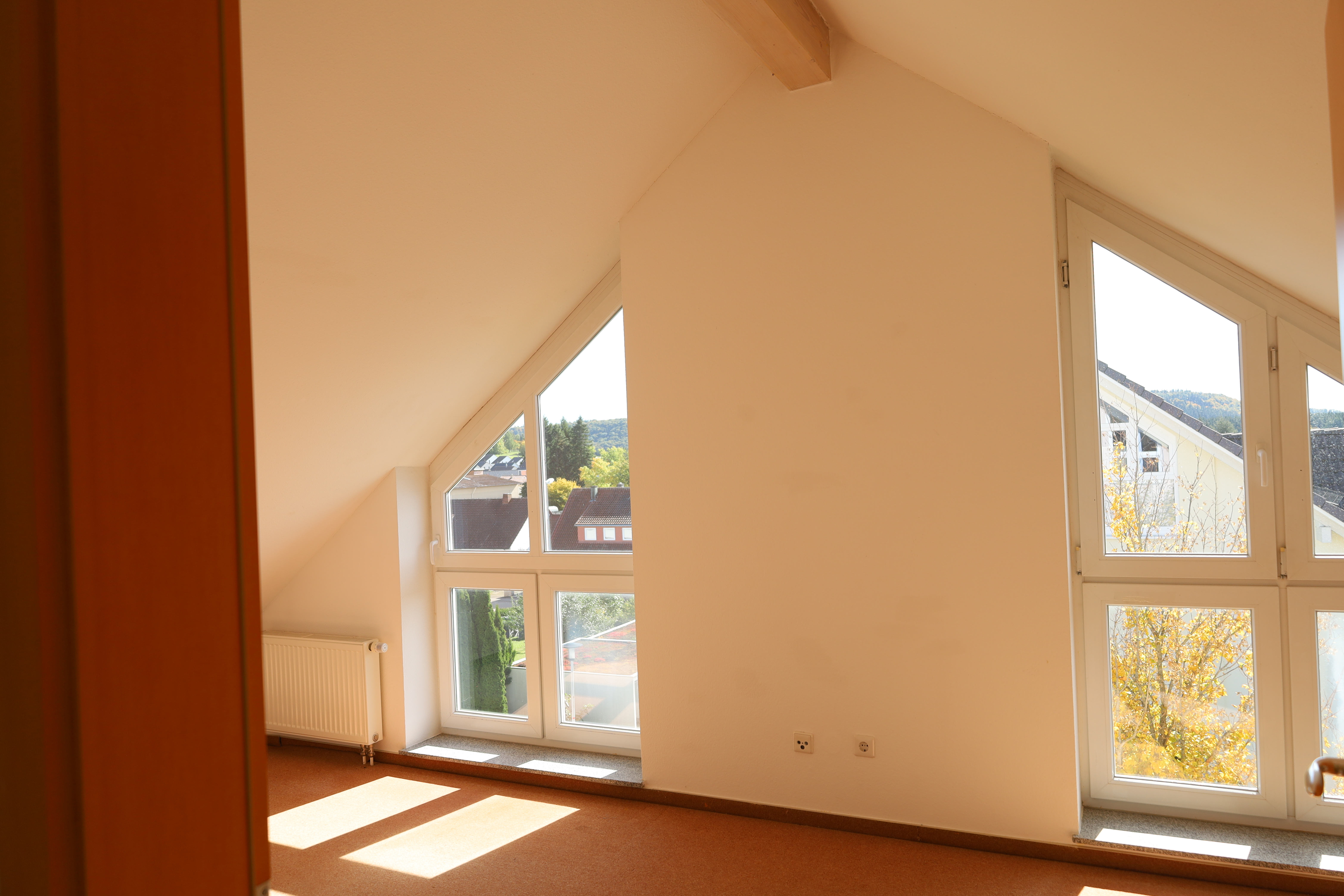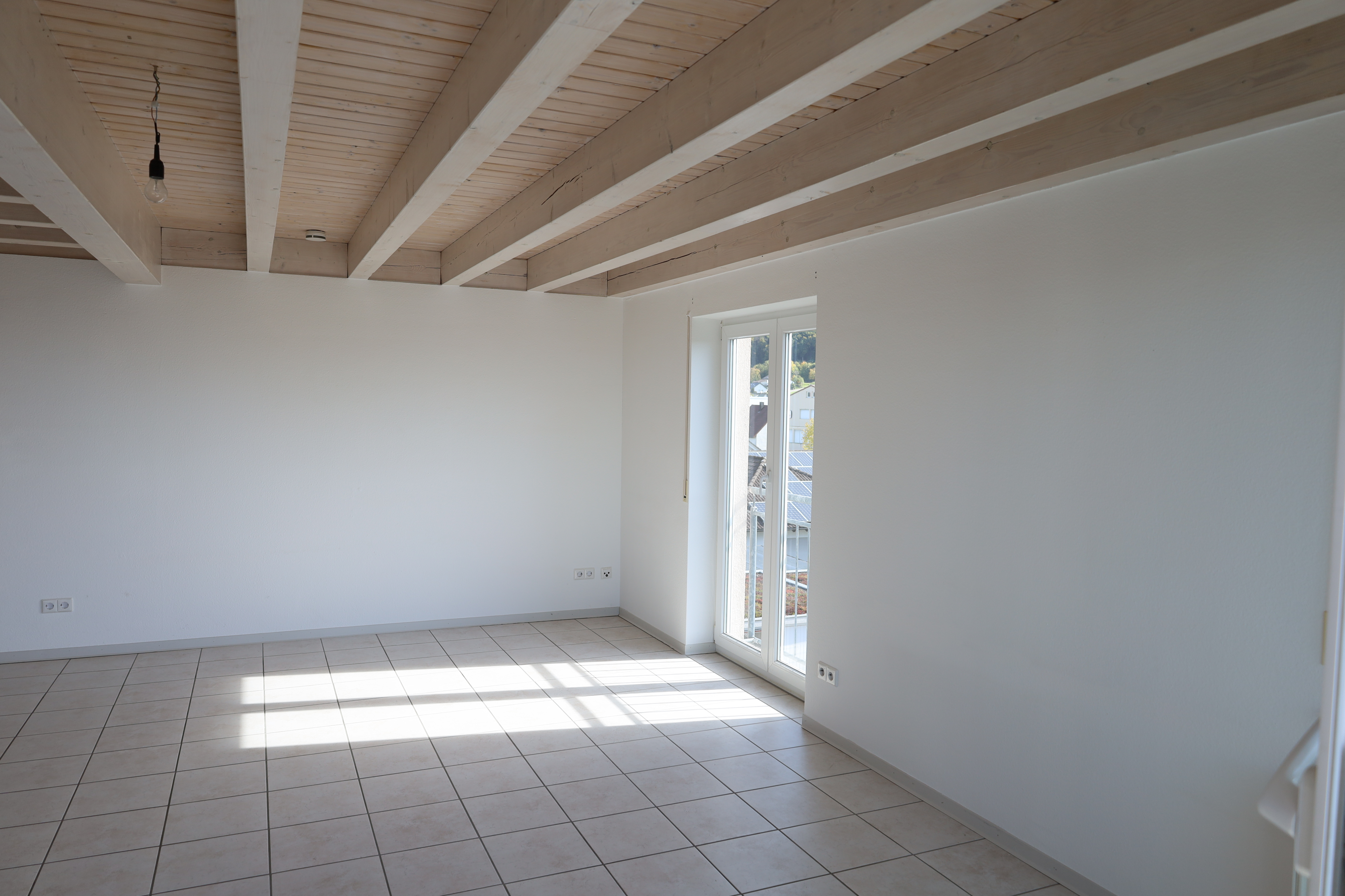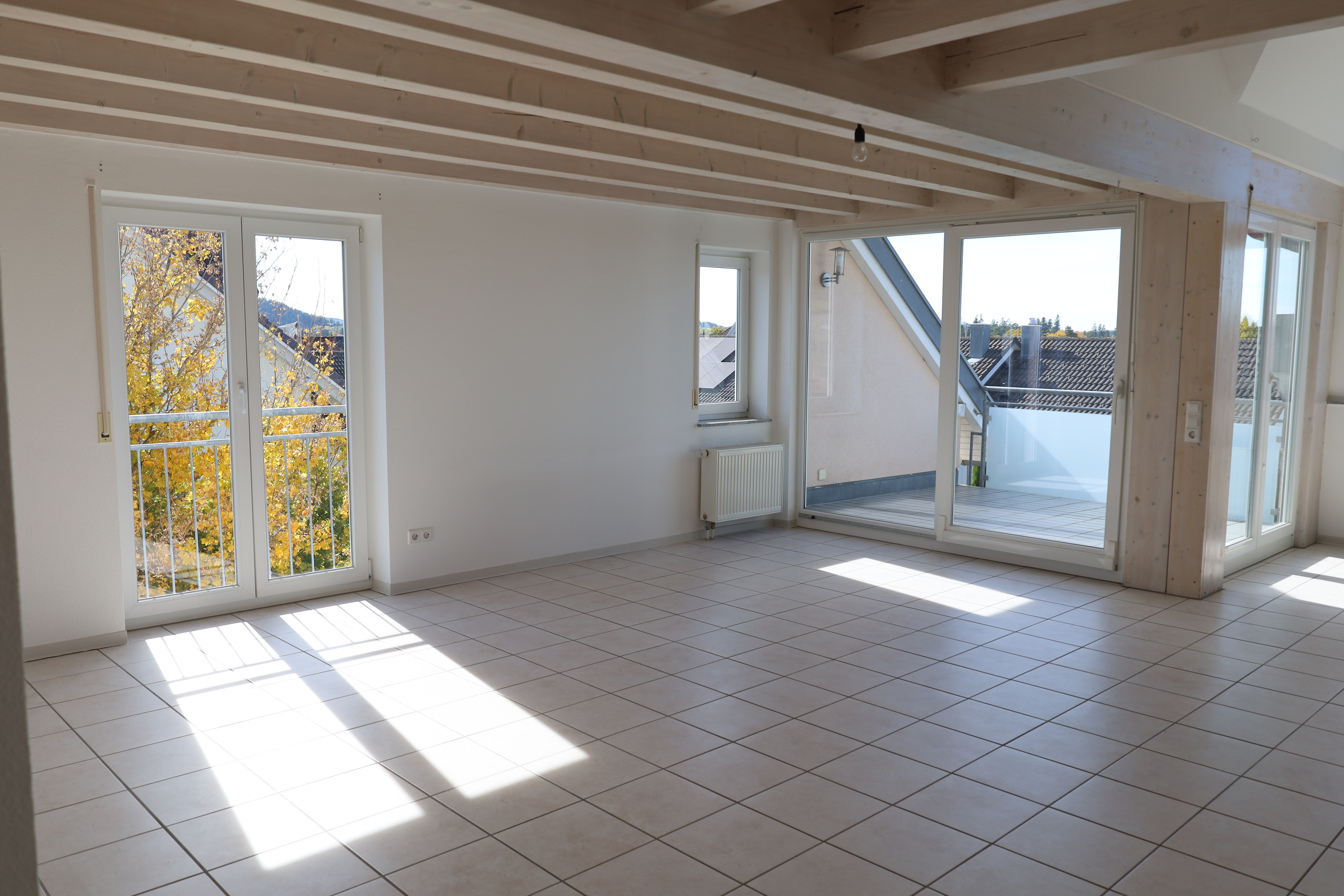 Der großzügige Wohn- und Essbereich mit offener Küche bildet das Herzstück der Wohnung. Große Fensterflächen, sichtbare Holzbalken und hohe Decken schaffen ein helles und gemütliches Ambiente. Von hier aus gelangen Sie direkt auf die sonnige Dachloggia mit Süd-West-Ausrichtung.