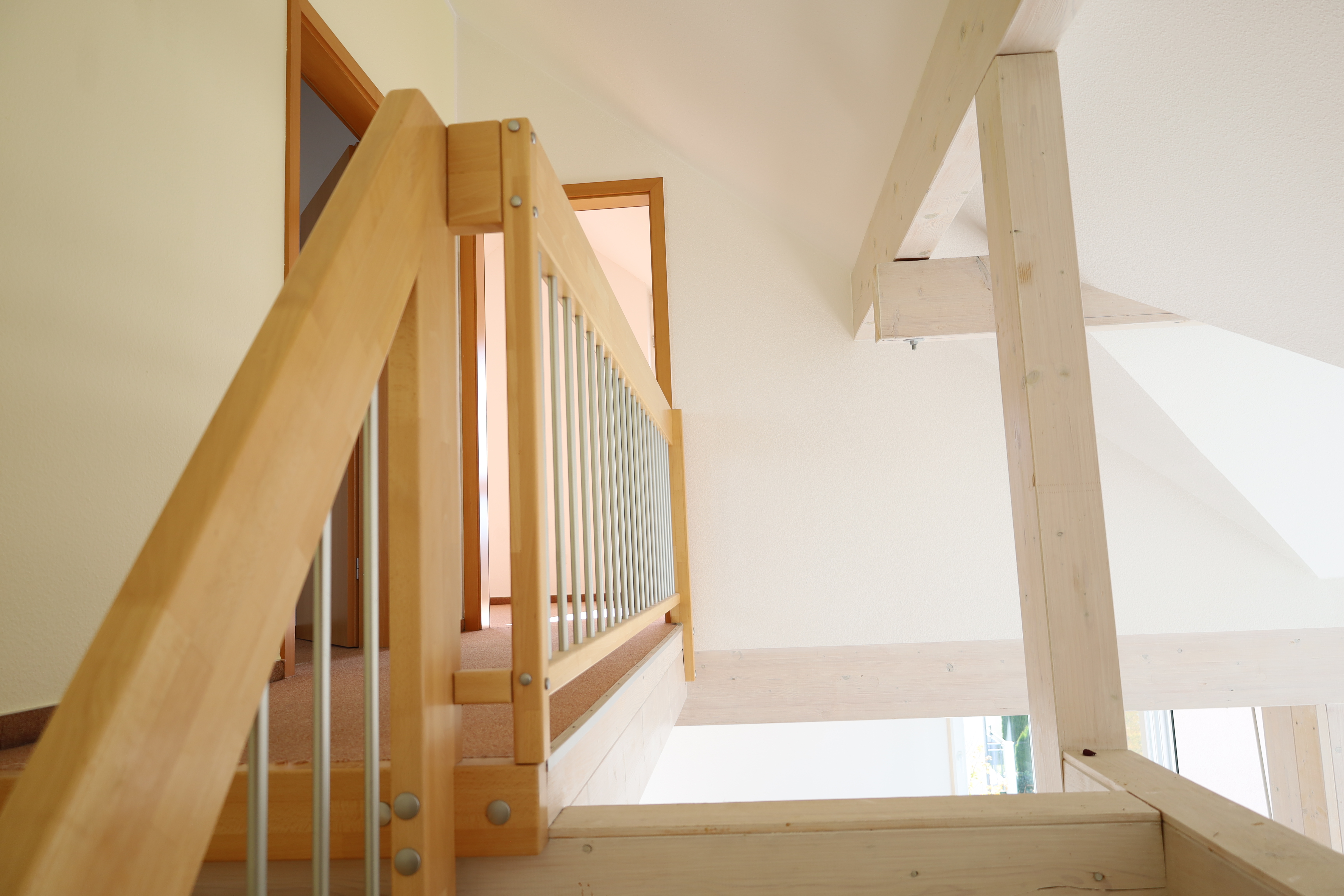 Über eine elegante Holztreppe führt eine offene Galerie in das Obergeschoss. Dort erwarten Sie zwei weitere Zimmer, ein Schlafzimmer mit imposanten Giebelfenstern und Dachschrägen, sowie ein weiteres Zimmer, dass sich vielseitig nutzen lässt.