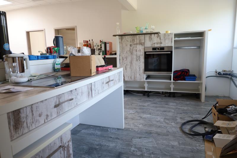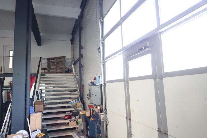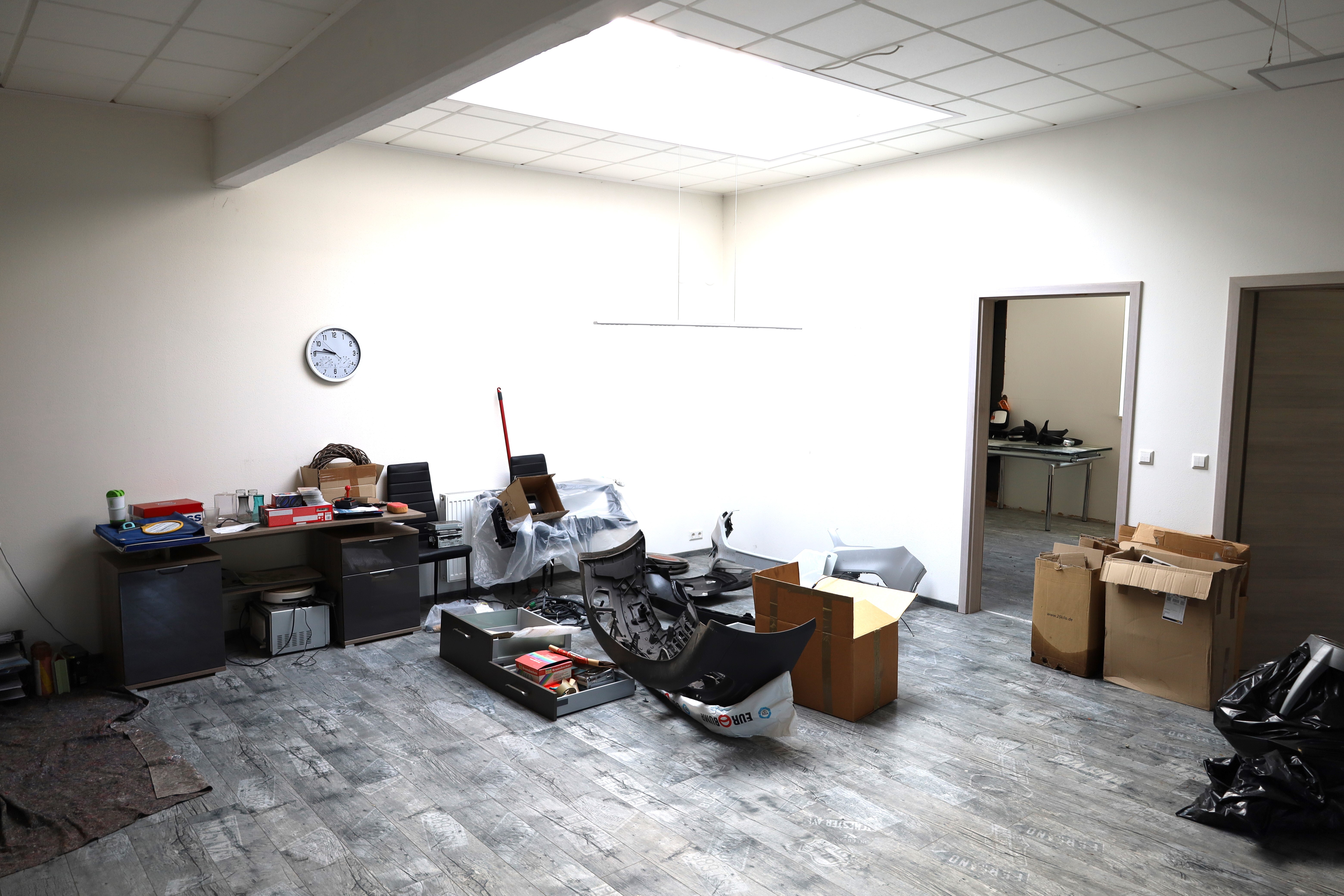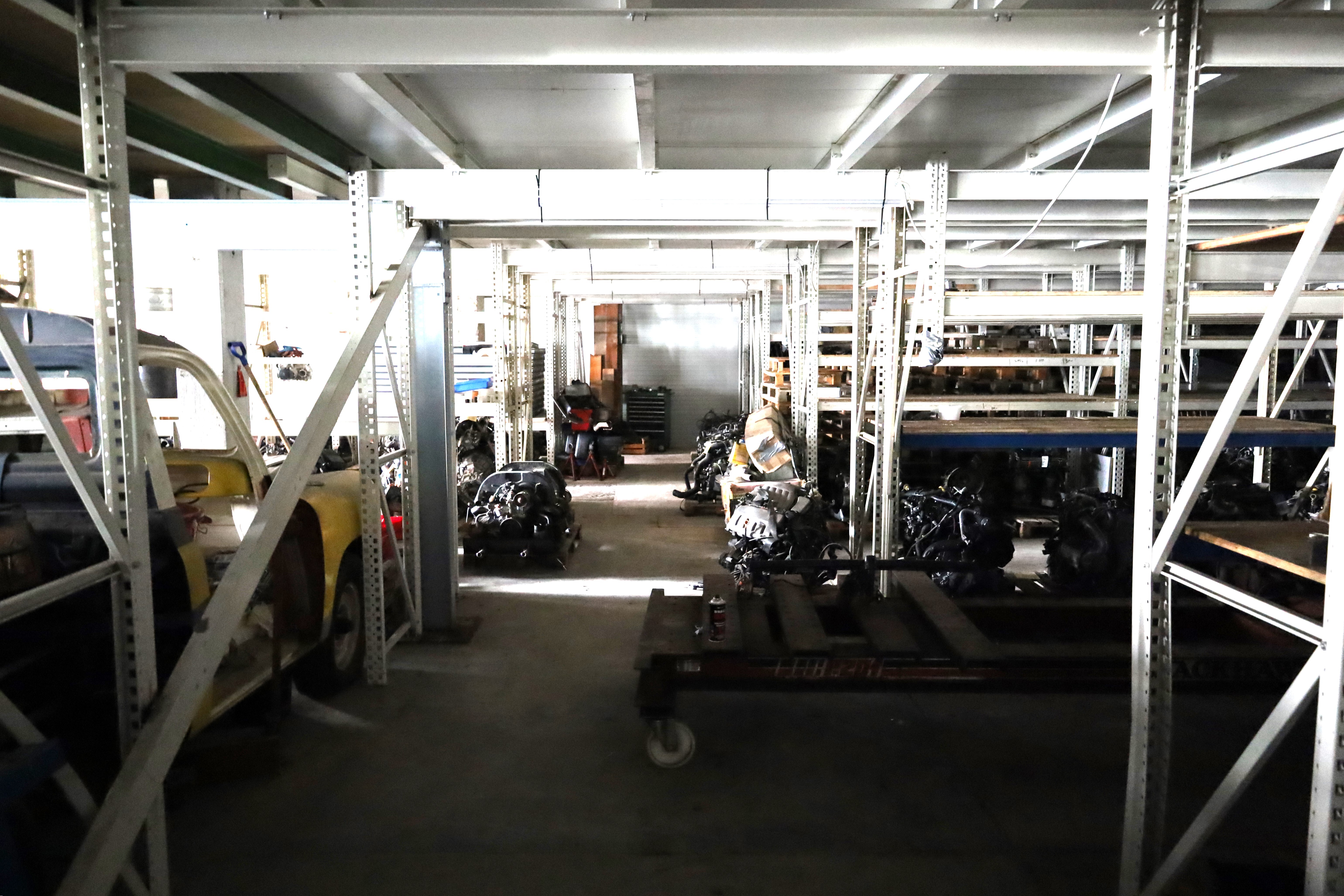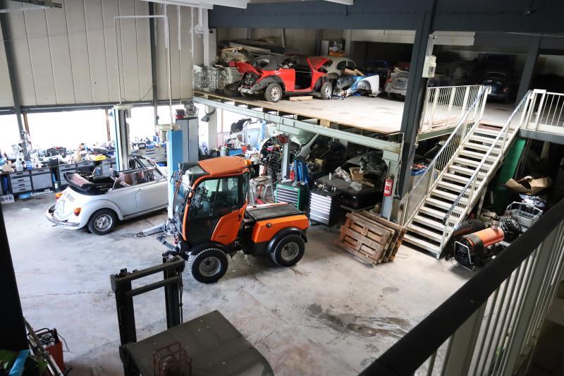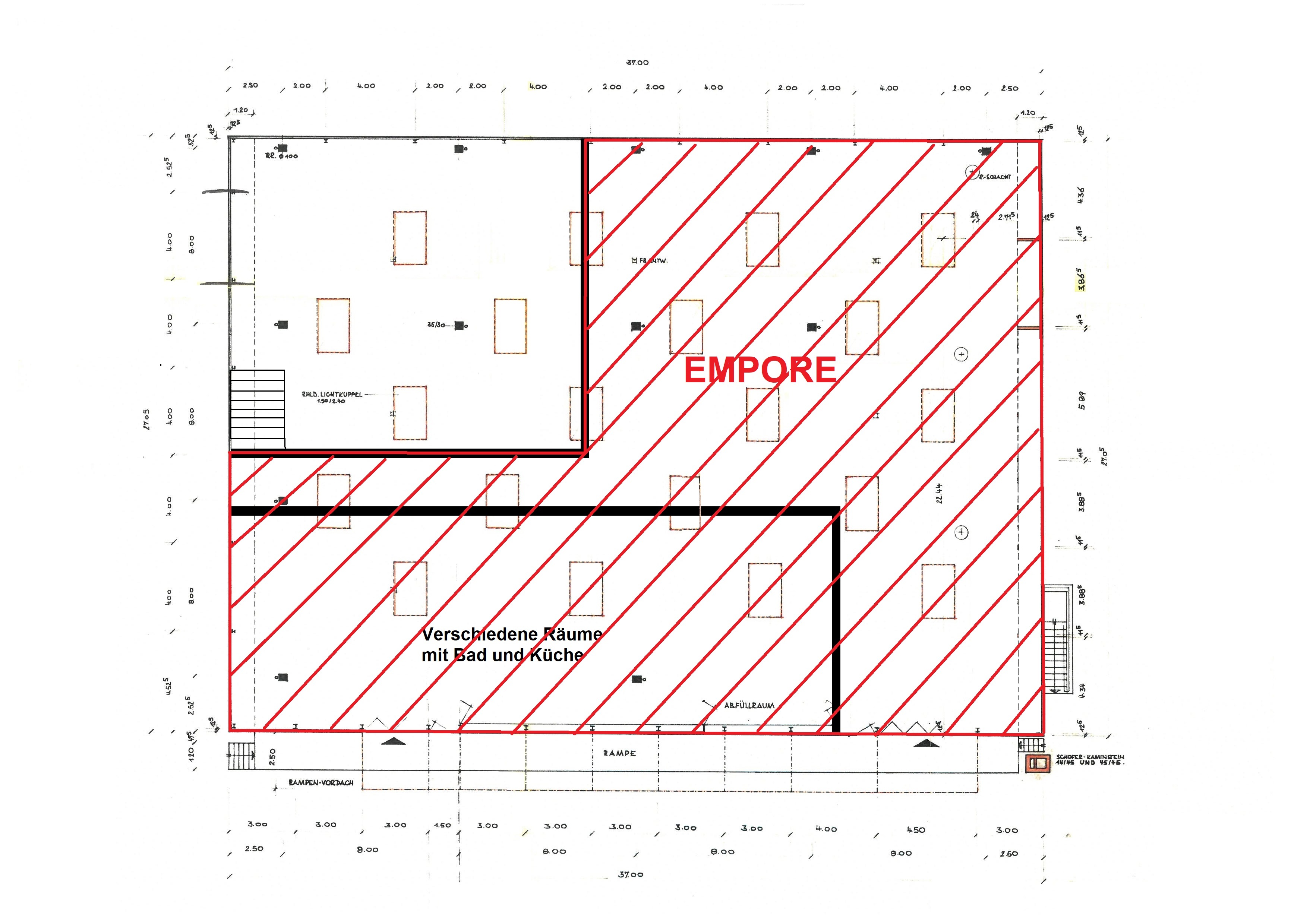 In die Halle wurde auf Schwerlastregalen eine Empore eingebaut, welche über zwei Treppen zugänglich ist. Auf der rechten Seite befinden sich Büroräume mit Duschbad und Einbauküche. Die andere Fläche mit ca. 700 m² wird zum Abstellen genutzt.