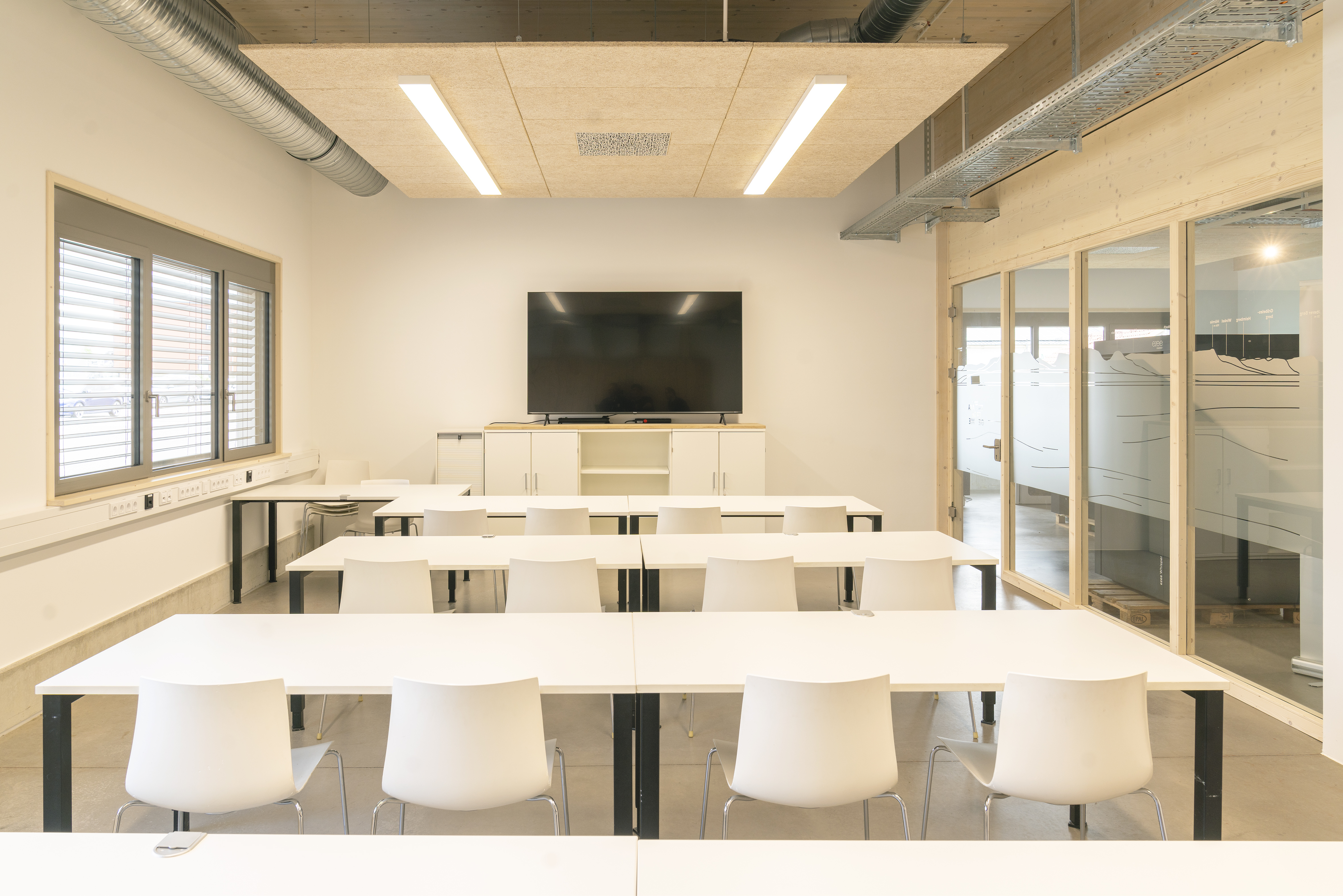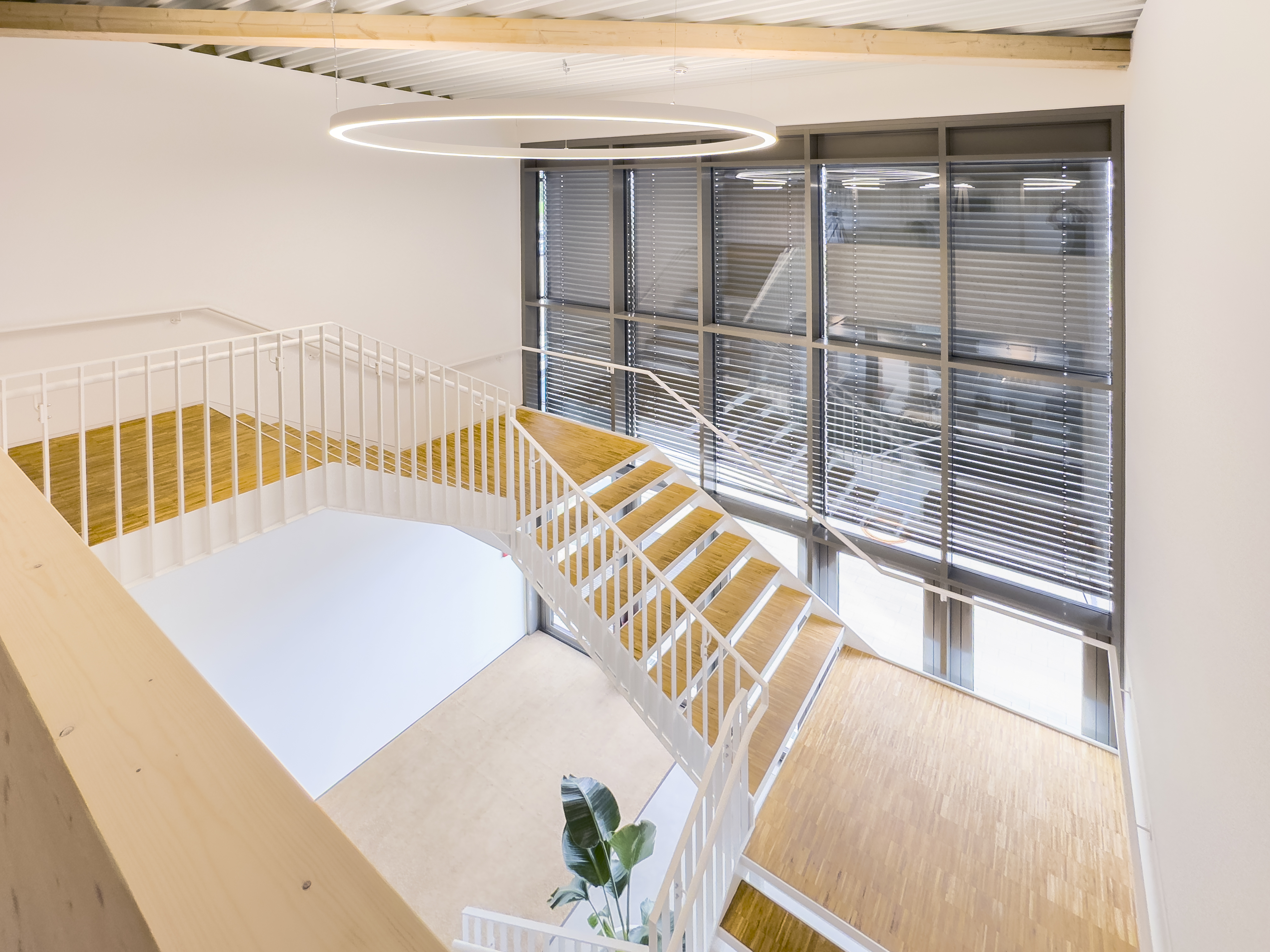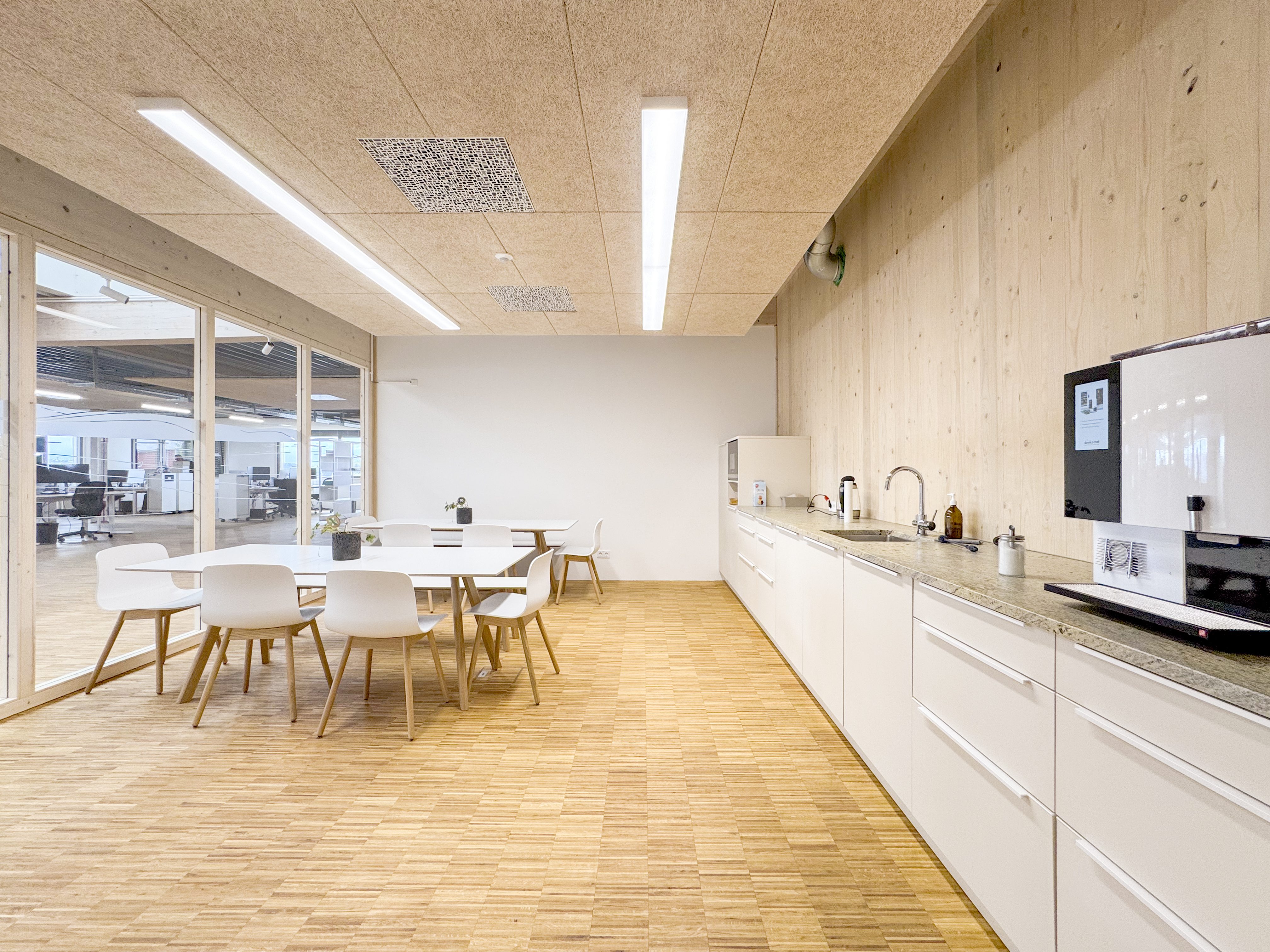 Das Gebäude bietet eine bemerkenswert angenehme Arbeitsatmosphäre und ist ausgelegt auf 70 Büroarbeitsplätze. Die Kombination aus natürlichen Materialien, zurückhaltender Farbgestaltung und einer akustisch optimierten Bauweise schafft ruhige, konzentrierte Arbeitsbedingungen. Die hellen Räume tragen wesentlich zur Aufenthaltsqualität bei und fördern eine produktive, entspannte Nutzung.