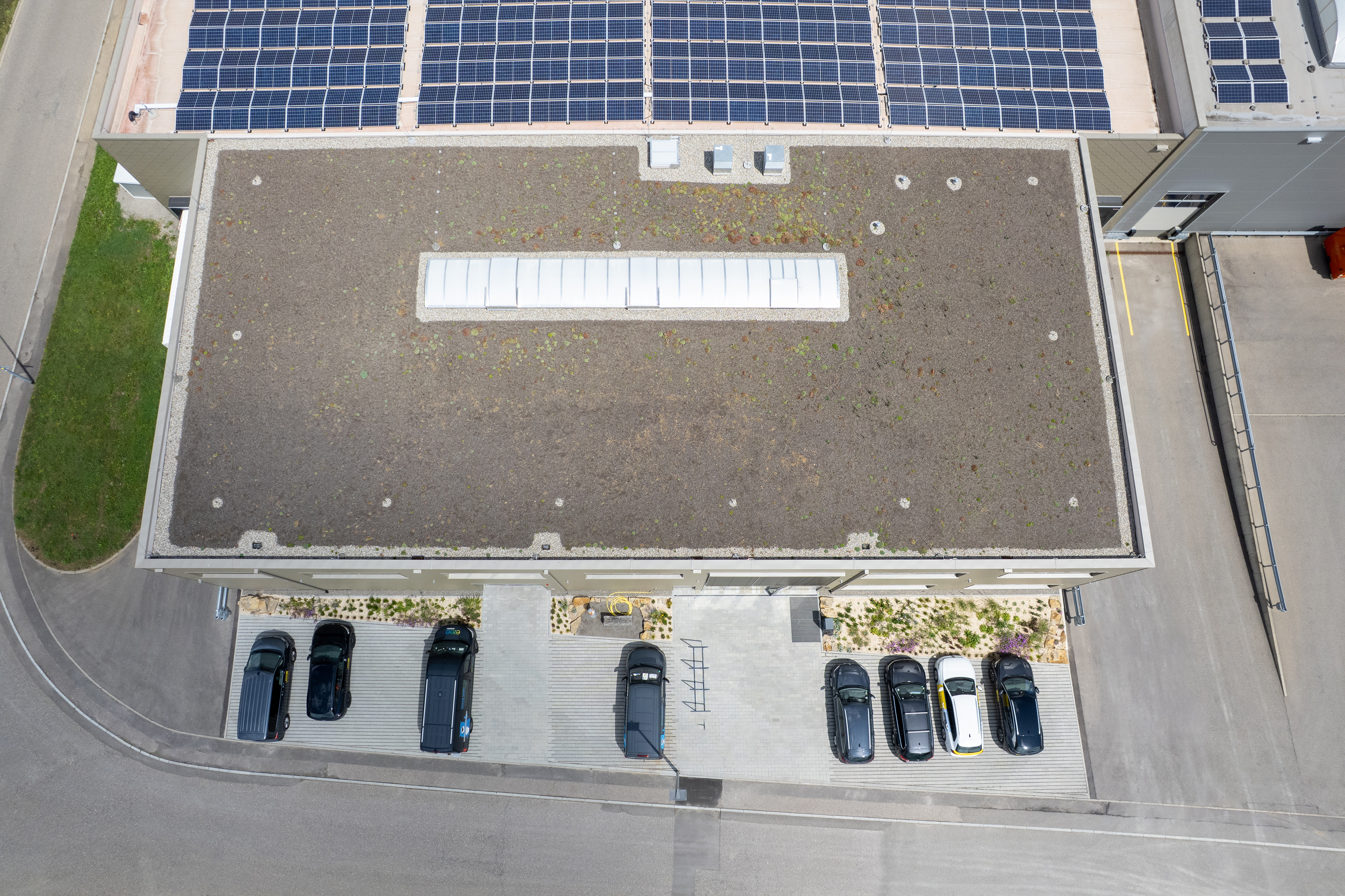 Konstruktion und MaterialienDie Tragstruktur ist in Holzbauweise ausgeführt. Fassadenplatten aus recyceltem Aluminium sorgen für Langlebigkeit, Wartungsarmut und ein hochwertiges Erscheinungsbild. Das Dach ist begrünt. Fußböden: EG = Beton, OG =Holz (Eiche).