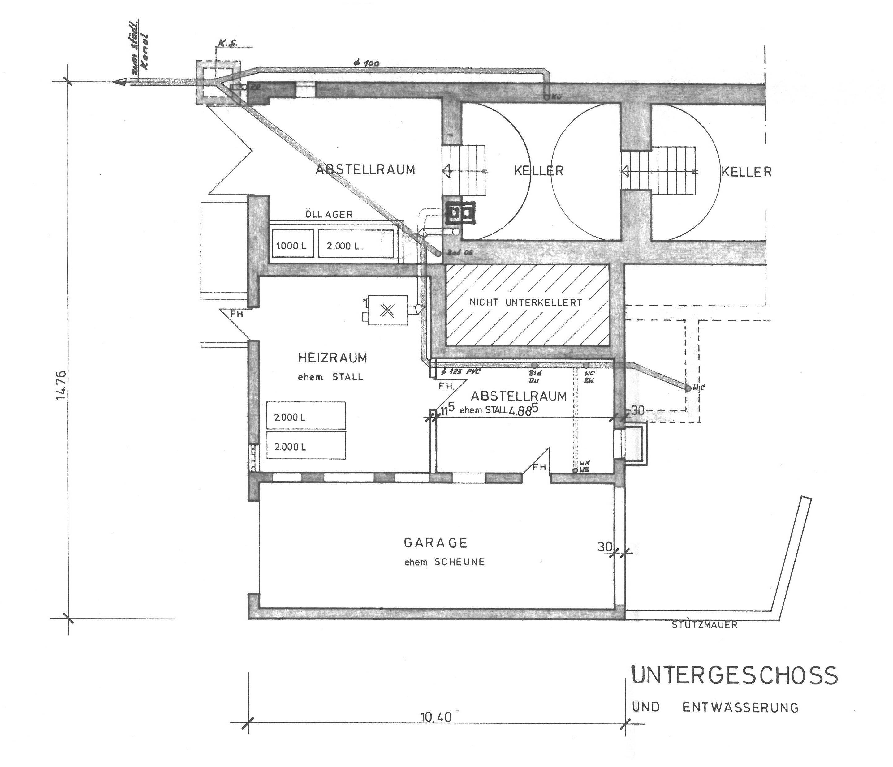 Das Haus ist unterkellert. Im Untergeschoss befindet sich ein Heizraum, Öltankraum, Abstellraum, zwei Garagen mit Platz für drei Fahrzeuge sowie ein Gewölbekeller.