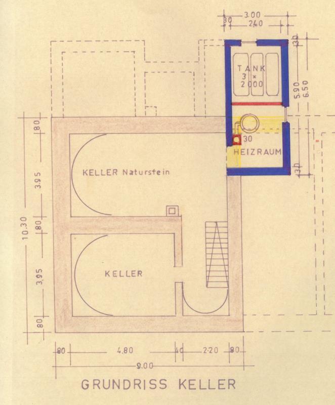 Im Untergeschoss sind 2 große Gewölbekeller und der Heizraum mit der Öl-Zentralheizung und den Öl-Tanks.
