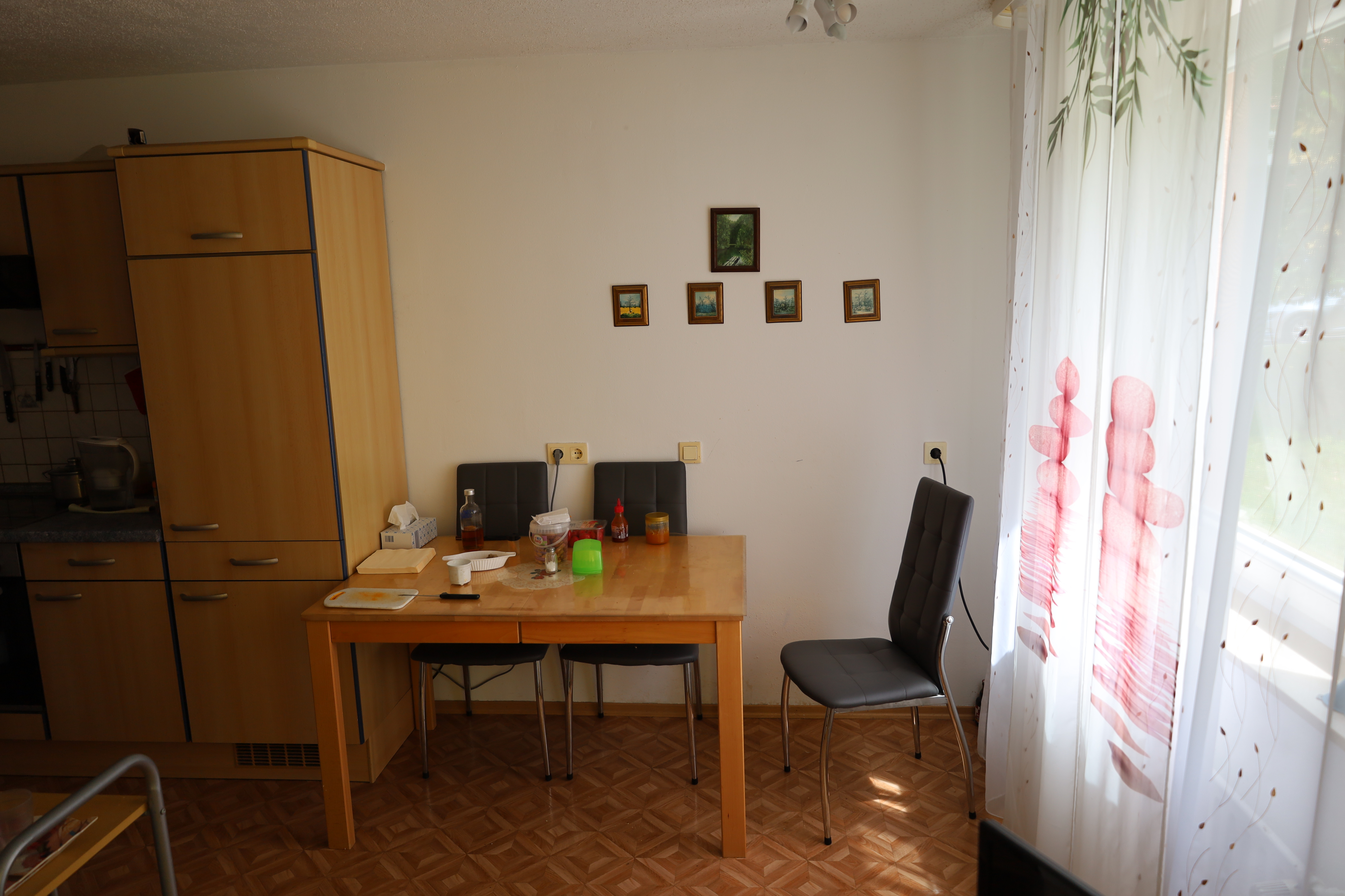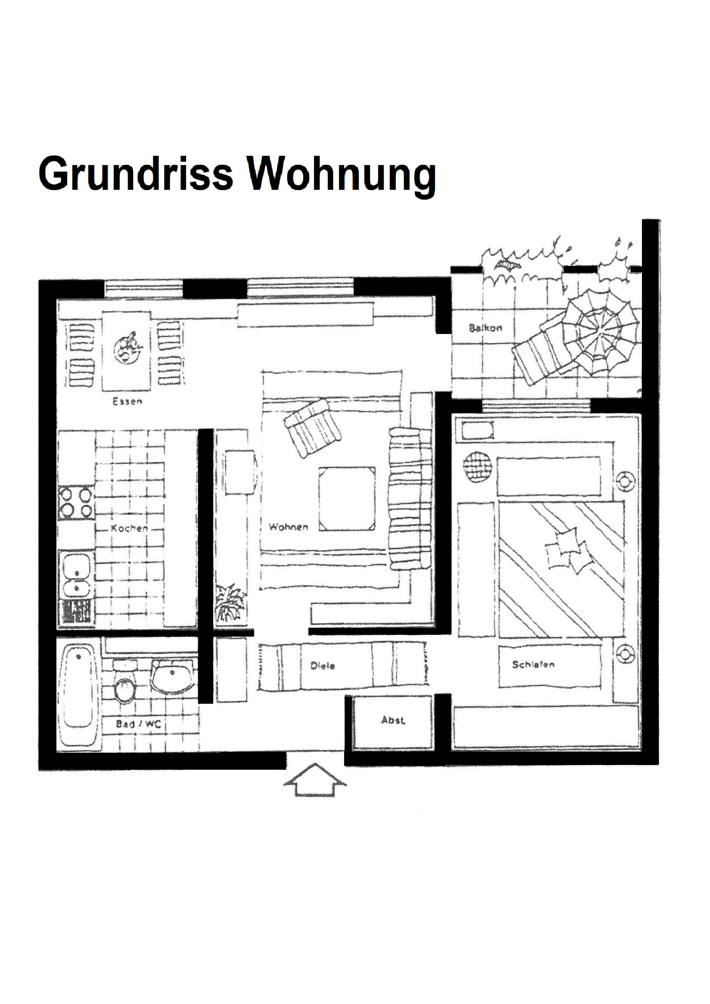 Nach der Wohnungstür im Erdgeschoss erwartet Sie ein kleiner Flur, mit dem alle Räume kompakt miteinander verbunden sind. Geradeaus gelangen Sie in das helle Wohnzimmer mit direktem Zugang auf den verglasten Balkon. Die Wohnküche befindet sich daneben, ein Esstisch und Stühle haben hier wunderbar Platz. Vom Flur aus rechts befindet sich das großzügige Schlafzimmer und links das Bad mit Badewanne, Waschbecken und WC.