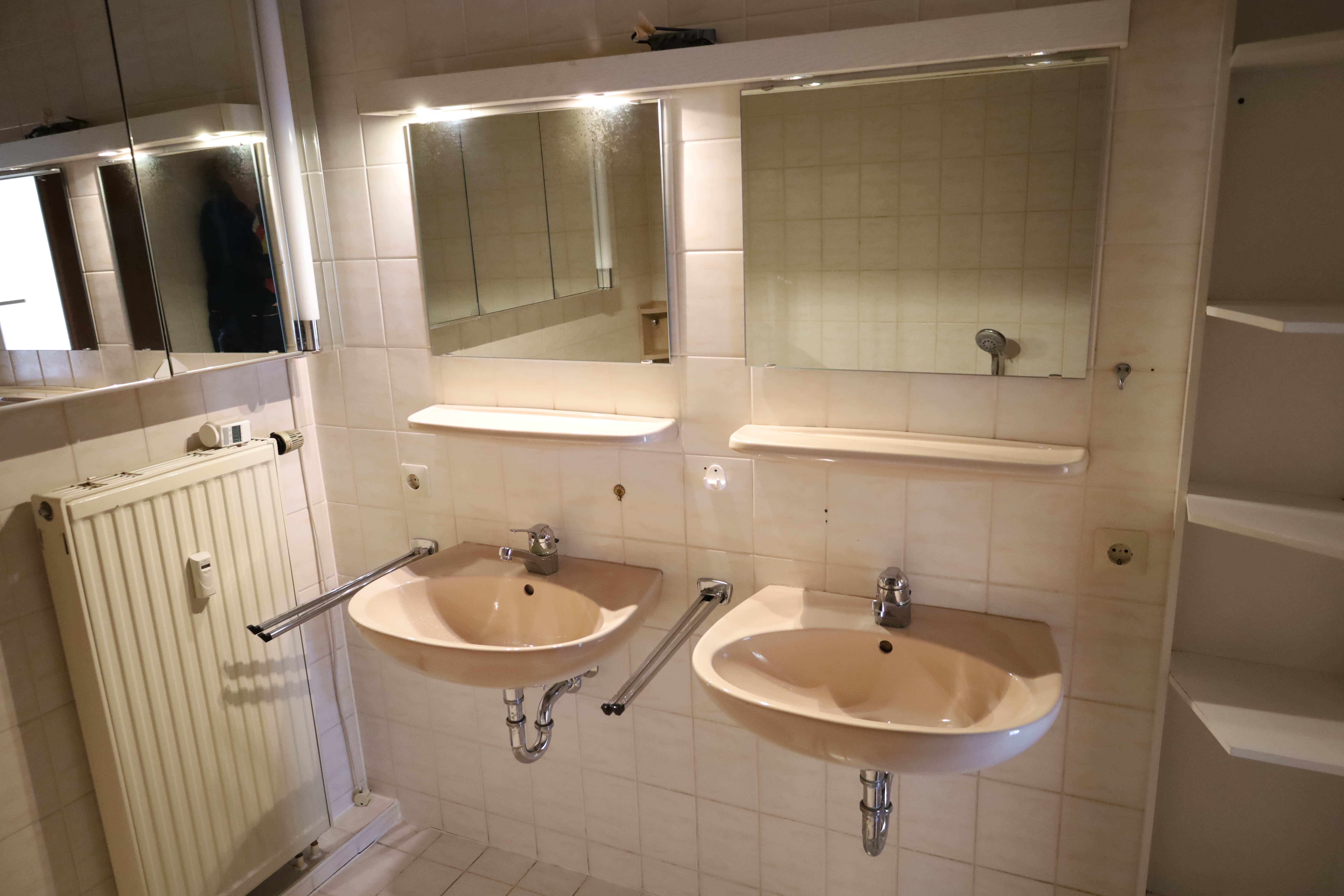 Von hier aus erreicht man die verschiedenen Räume: Das große Wohn-/ Esszimmer und das Schlafzimmer haben beide jeweils einen Zugang auf den Balkon, daneben ist ein Kinderzimmer und die Wohnküche. Im Eingangsbereich eine separates WC und daneben das große Badezimmer mit Badewanne, Dusche und 2 Waschbecken.