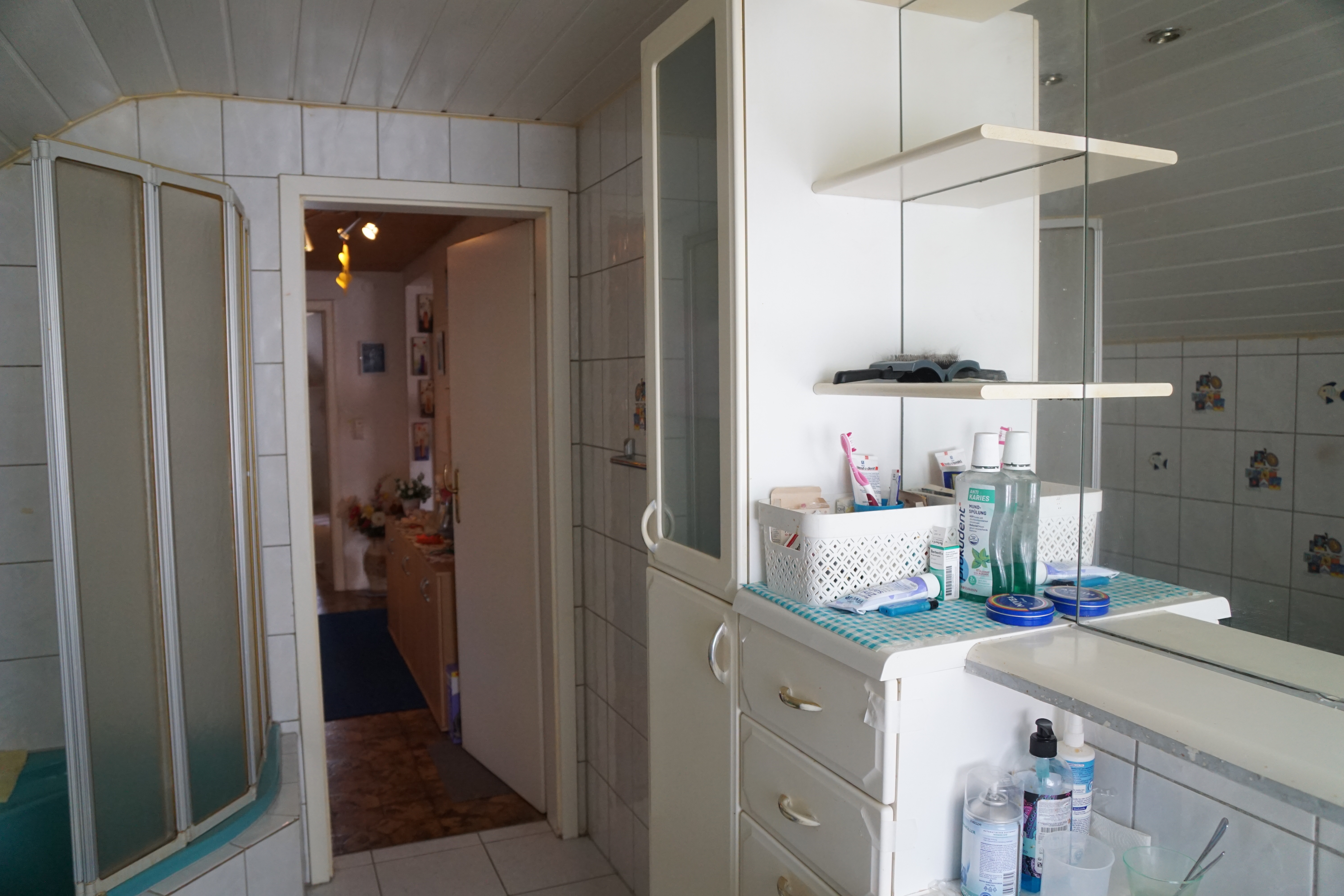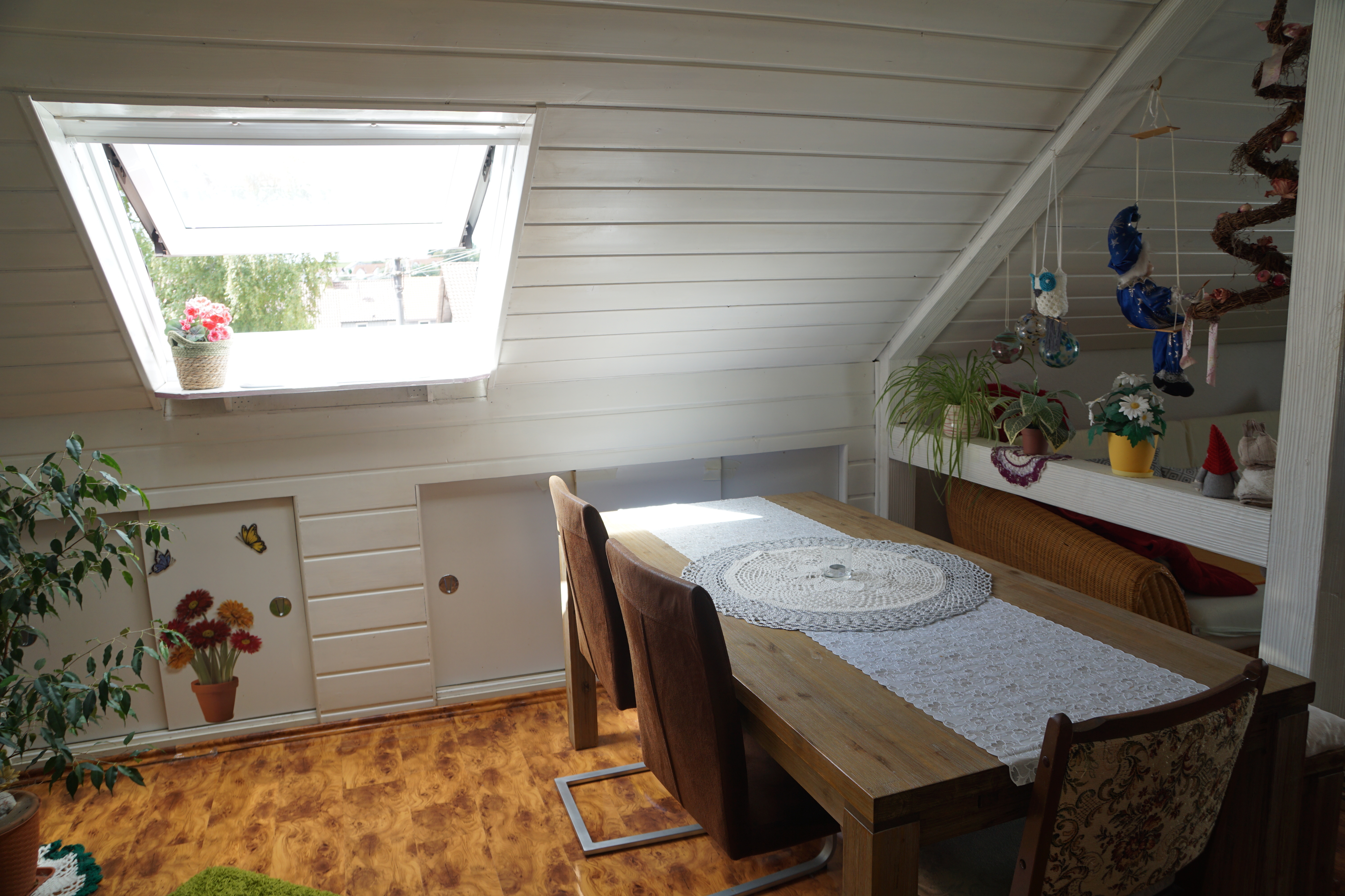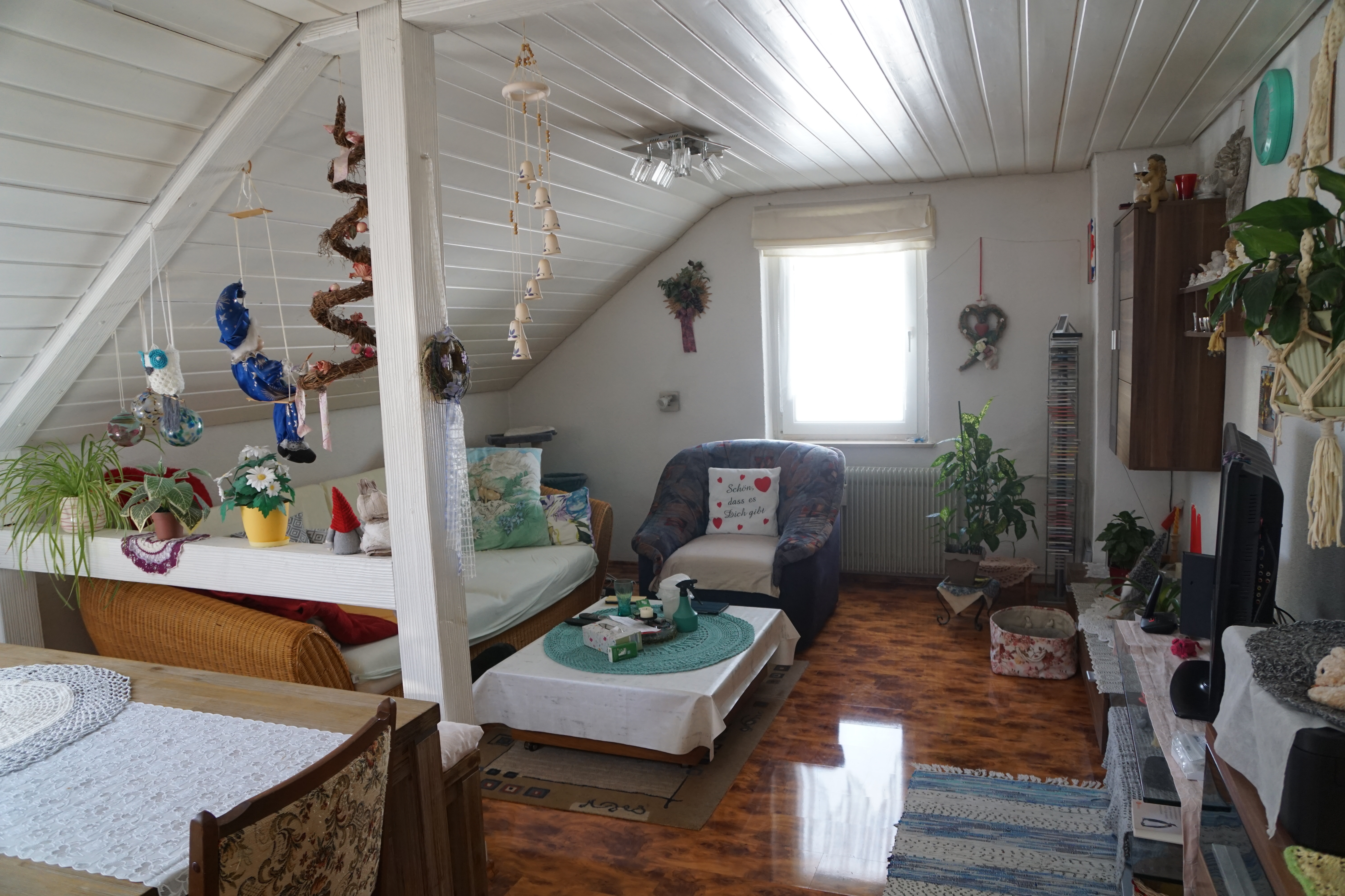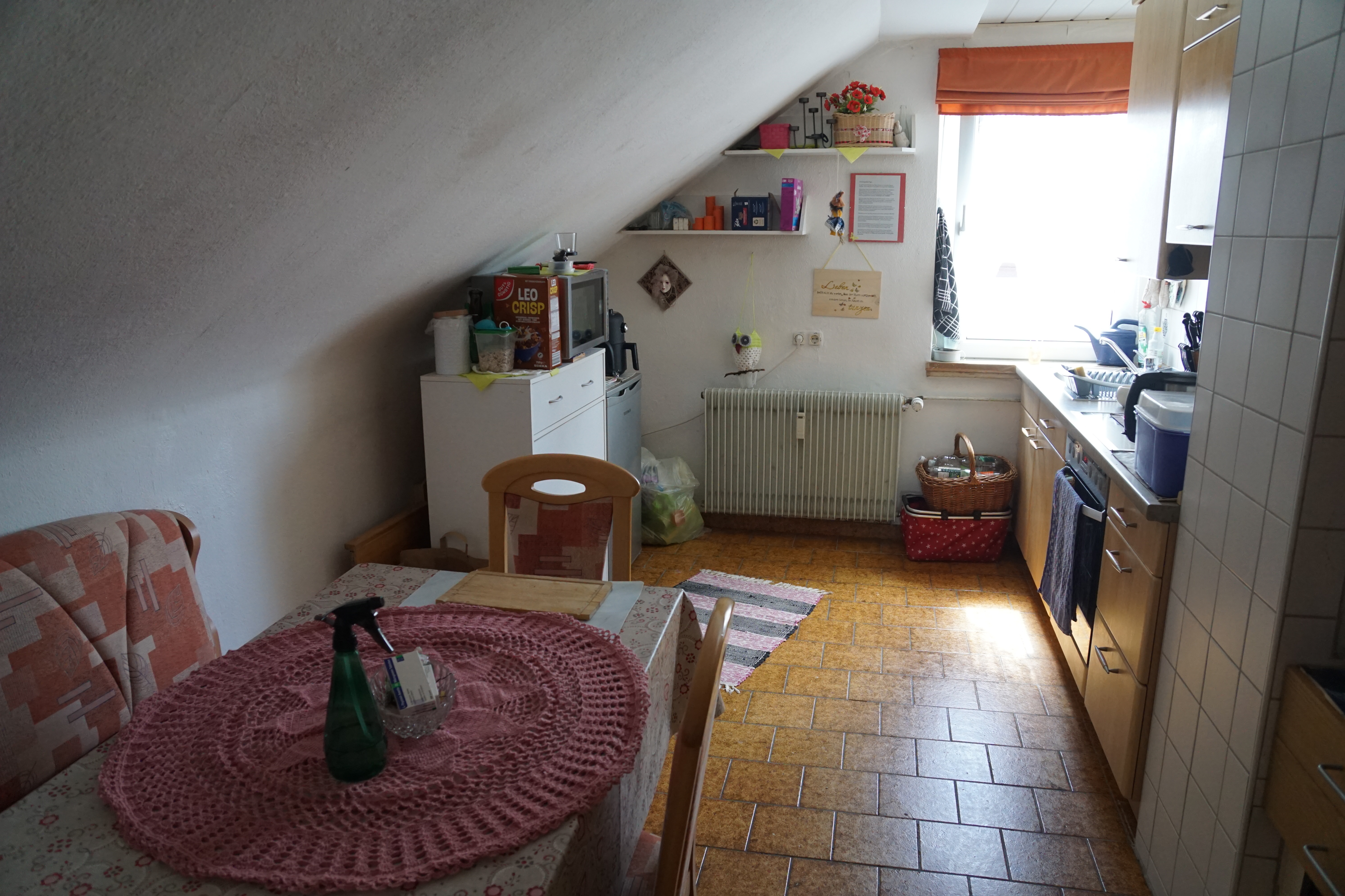 In der Wohnung im DG gibt es neben einem geräumigen Wohn-Essbereich, eine große Küche, ein Schlafzimmer sowie ein Tageslichtbad mit Waschbecken, WC + Dusche.
