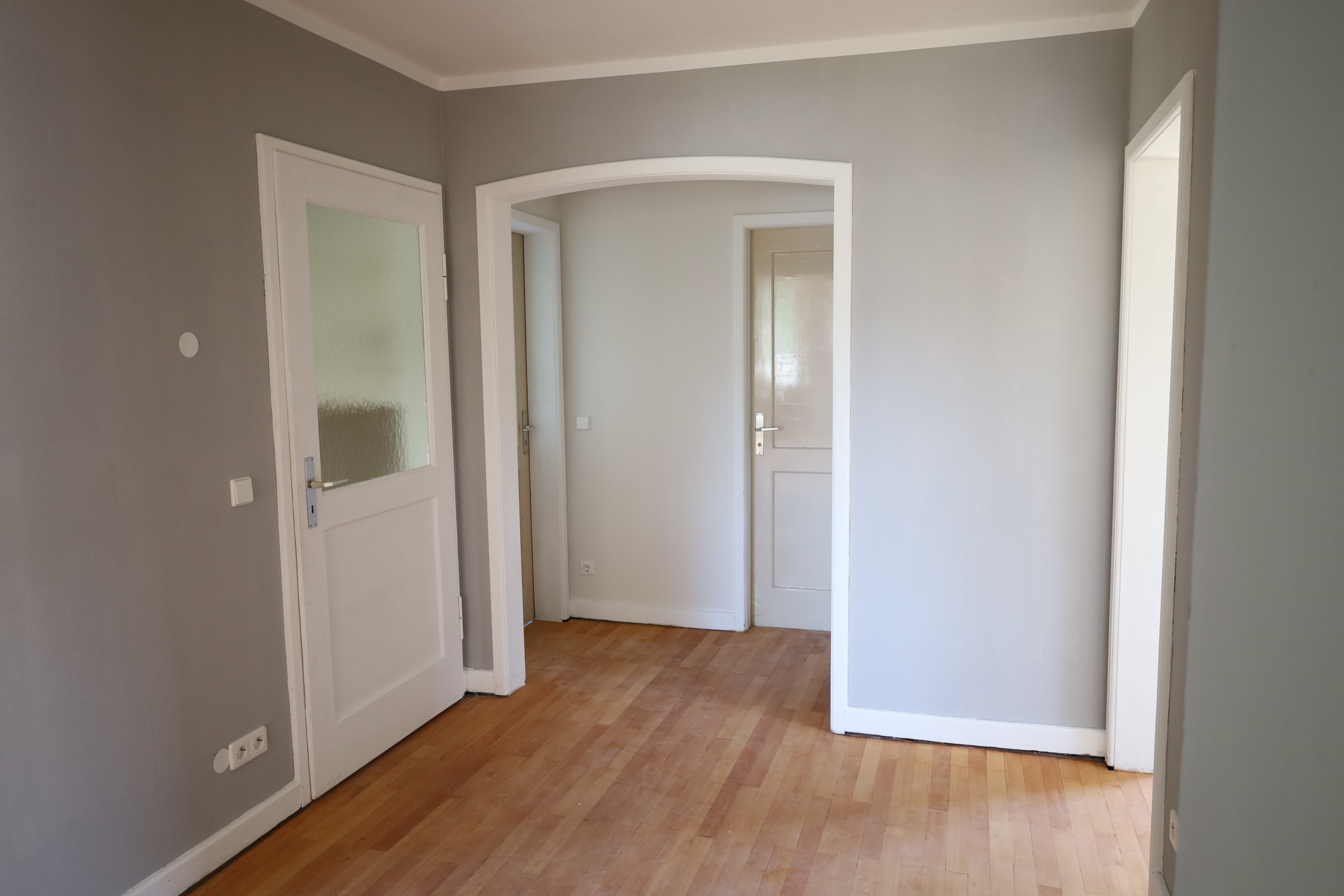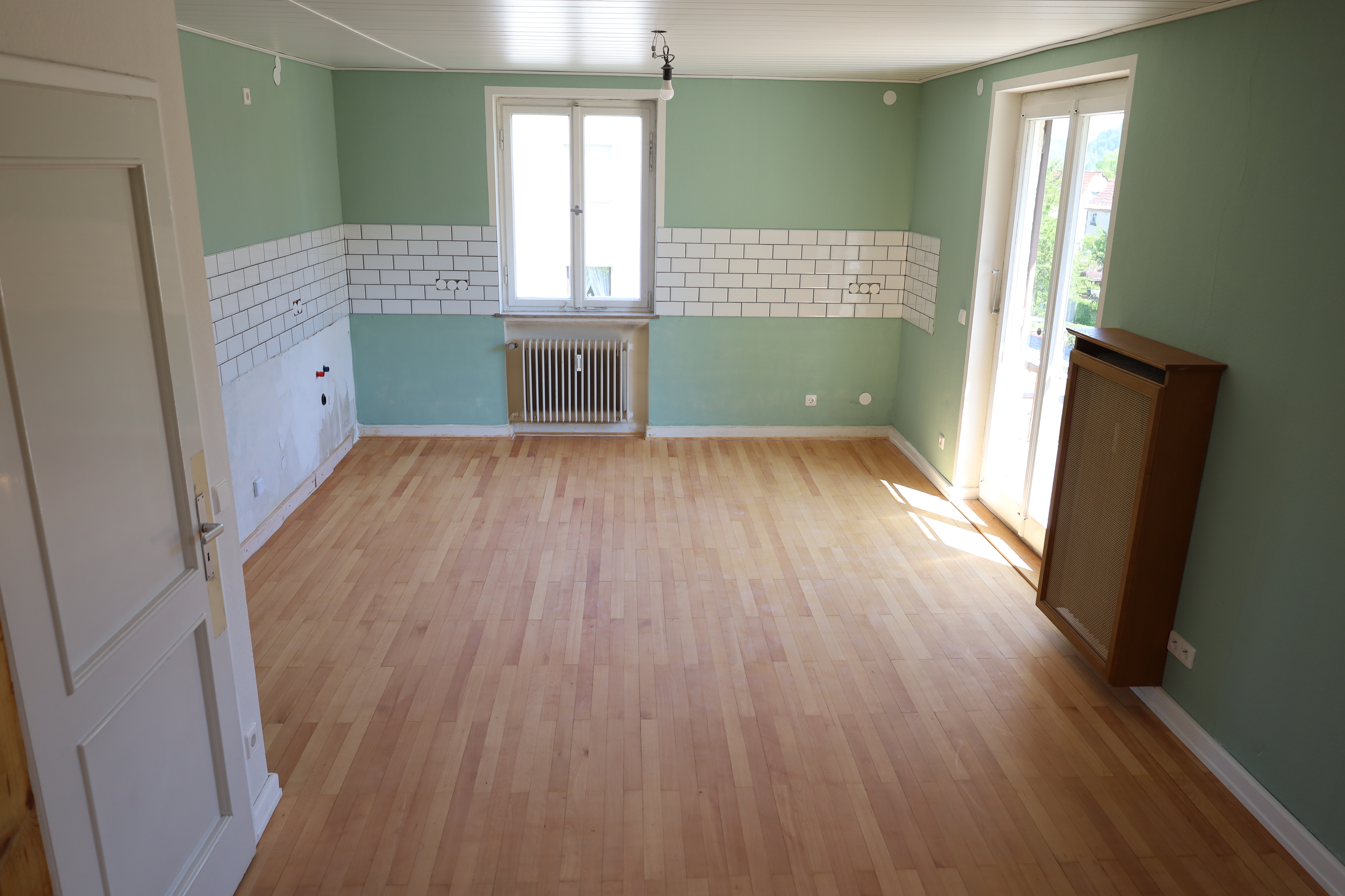 Die Räume im Obergeschoss wurden bereits modernisiert und vergrößert, sodass eine offene, einladende Wohnatmosphäre entstanden ist: Über die schöne Diele erreicht man die offene Küche mit Zugang zum Südbalkon und viel Platz für den Wohn-Essbereich. Daneben befindet sich ein schönes Schlafzimmer. Neben dem vorbereiteten neuen und großen Bad gibt es einen Hauswirtschaftsraum bzw. eine Speisekammer.
