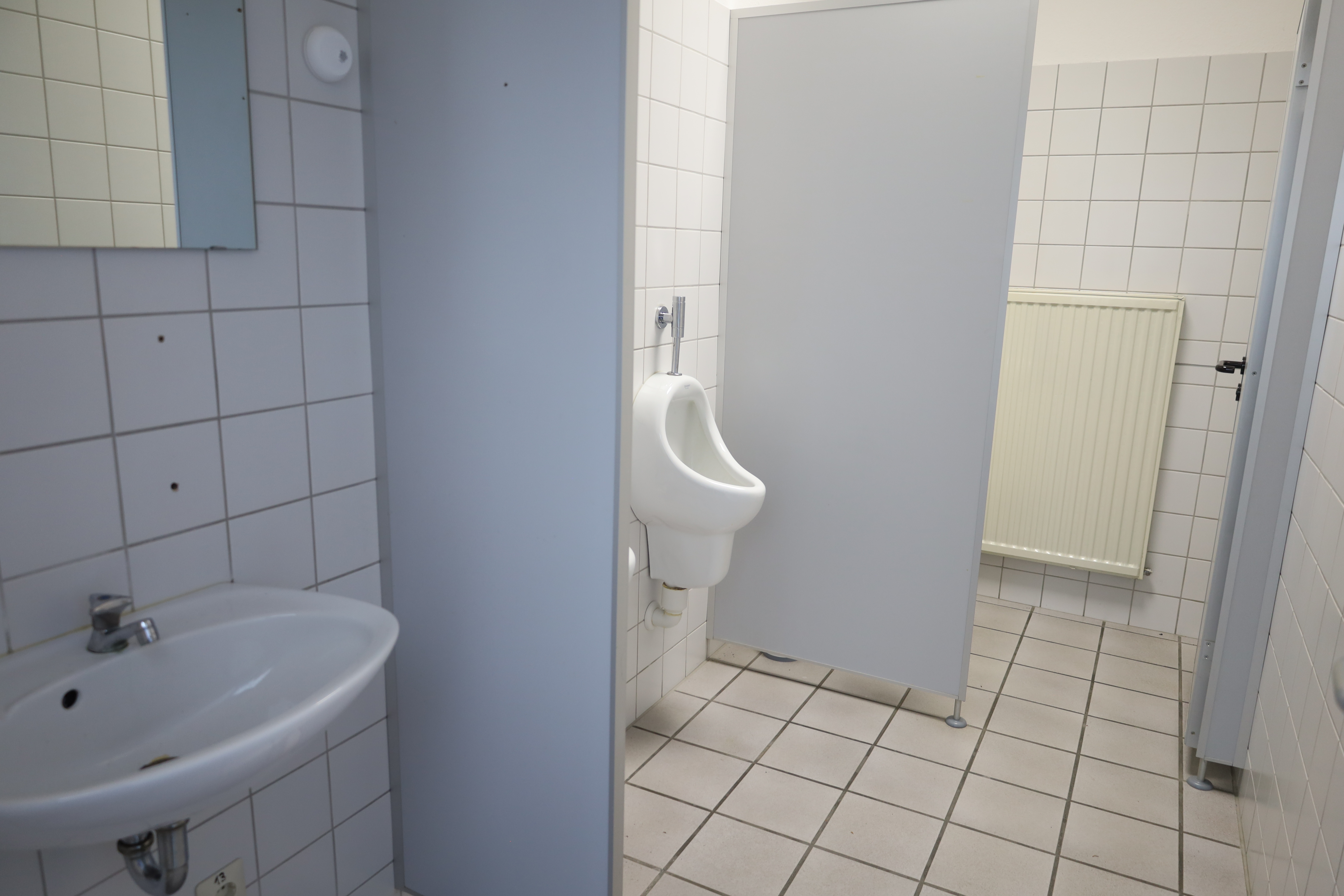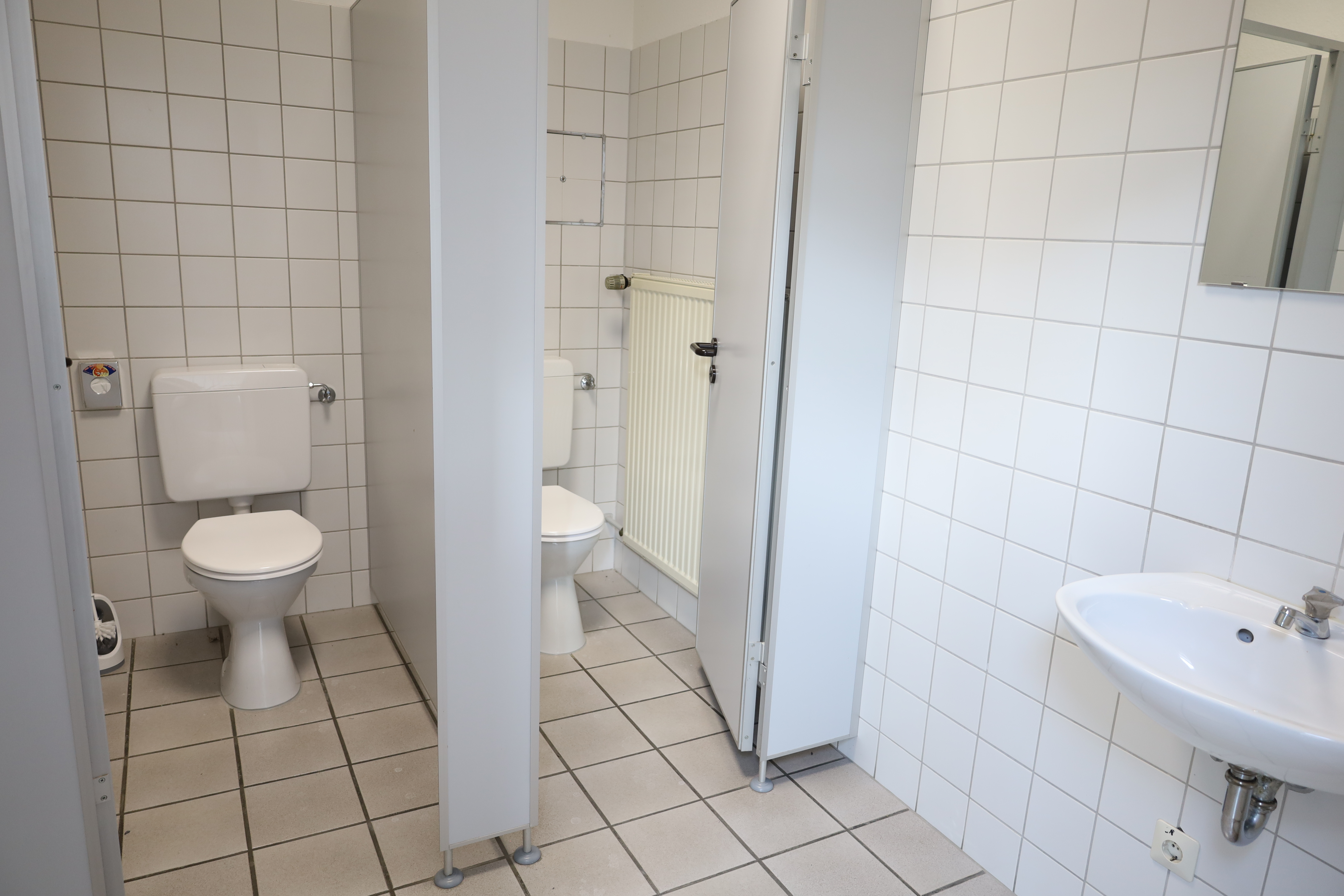 Zur Einheit gehört ein separater Abstellraum, eine kleine Küchenzeile mit Spülbecken sowie ein Damen-WC und ein Herren-WC dazu.