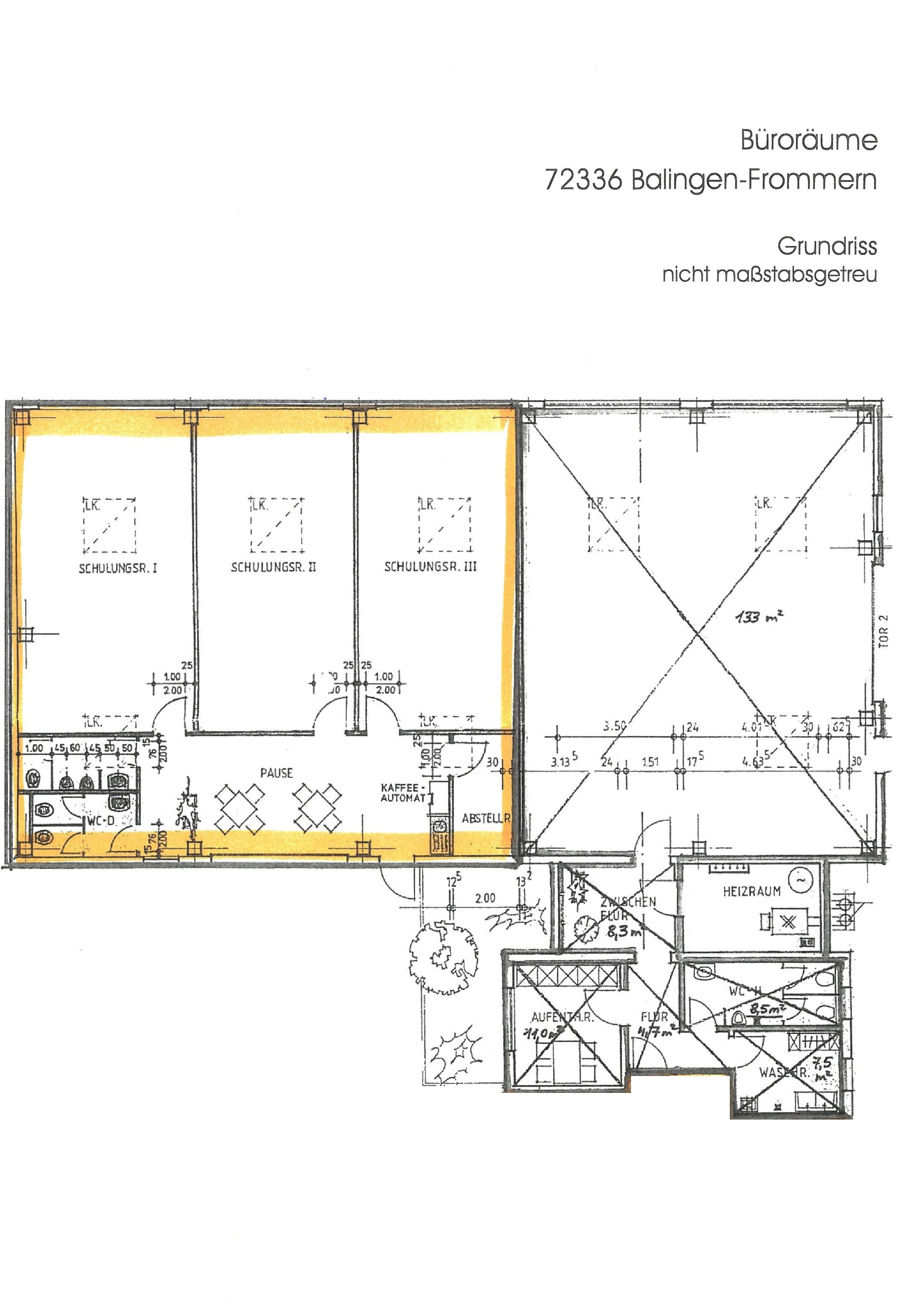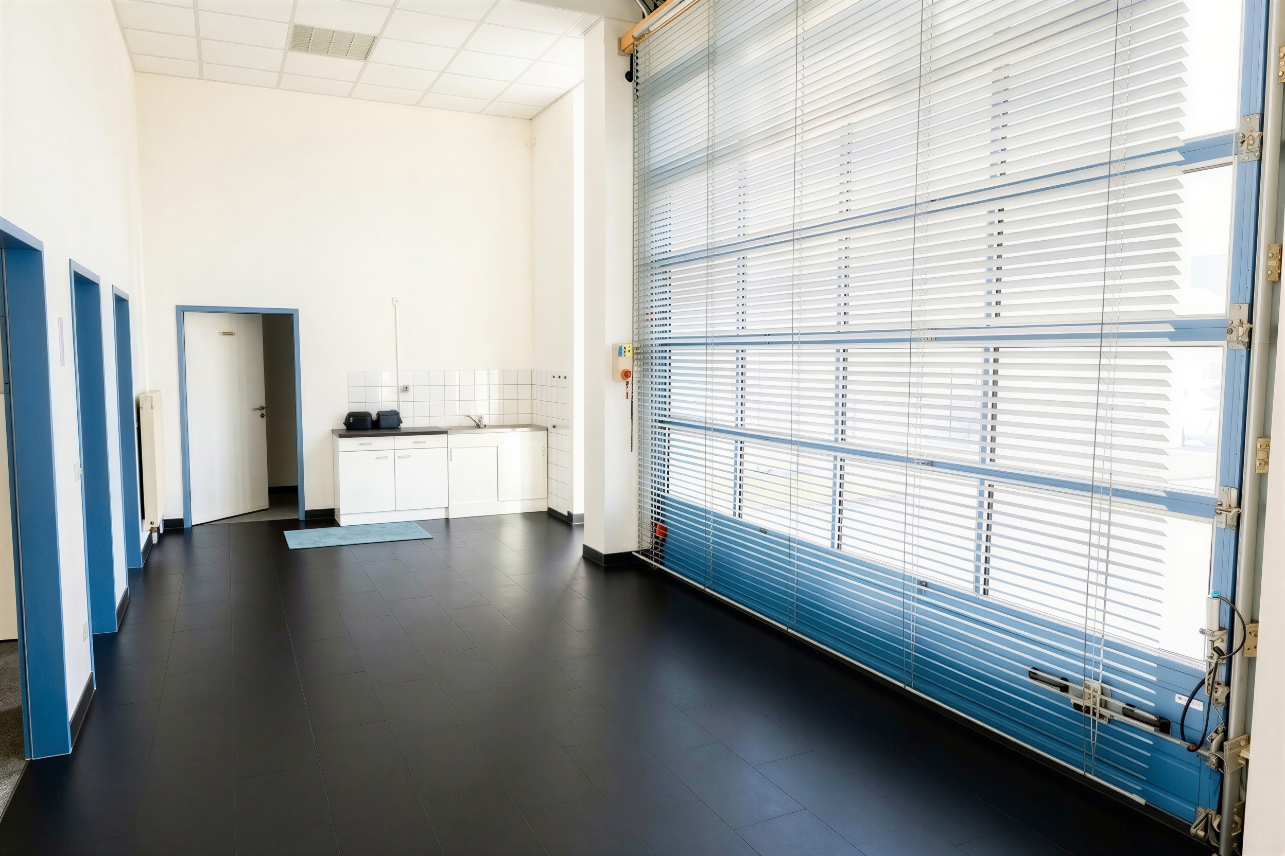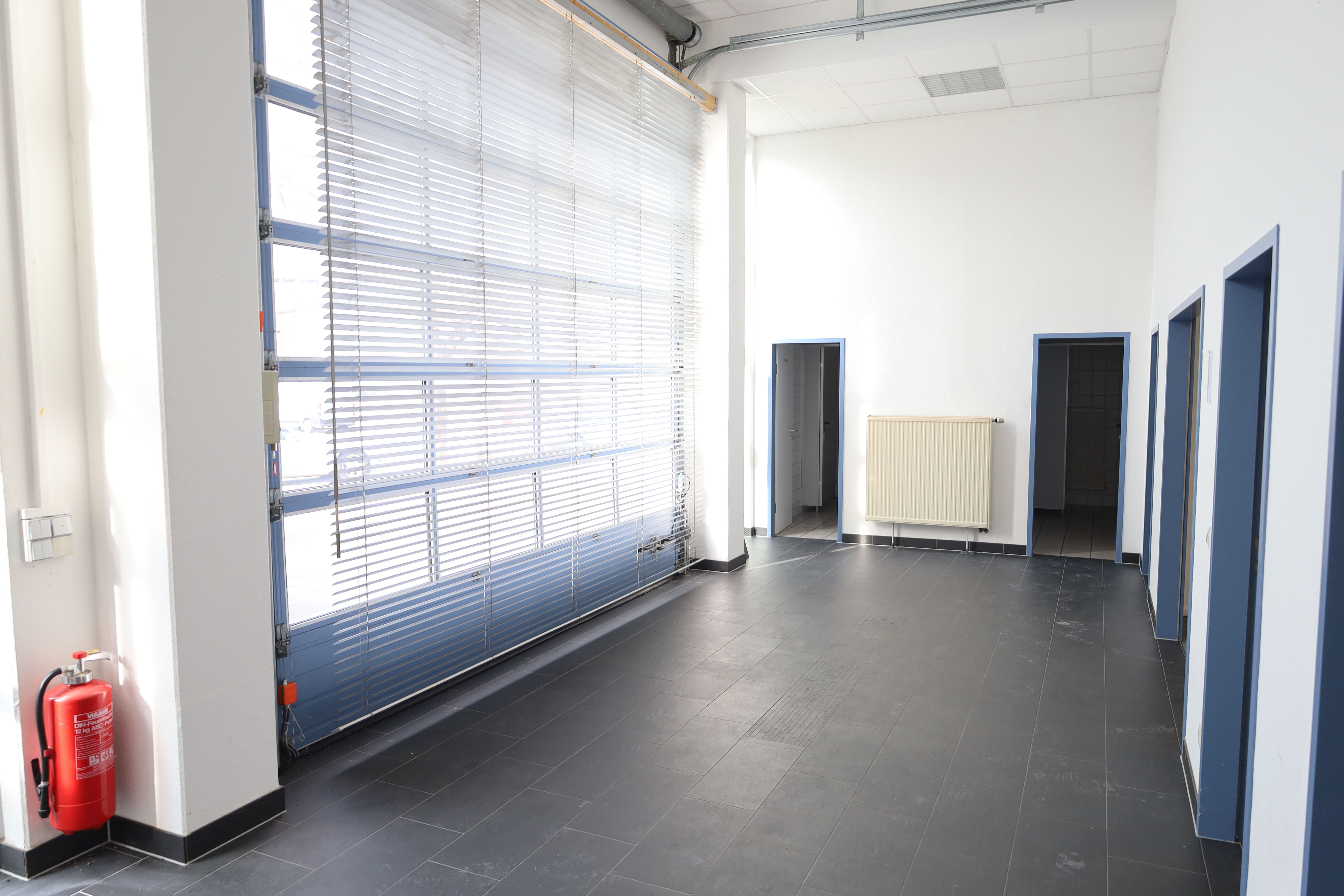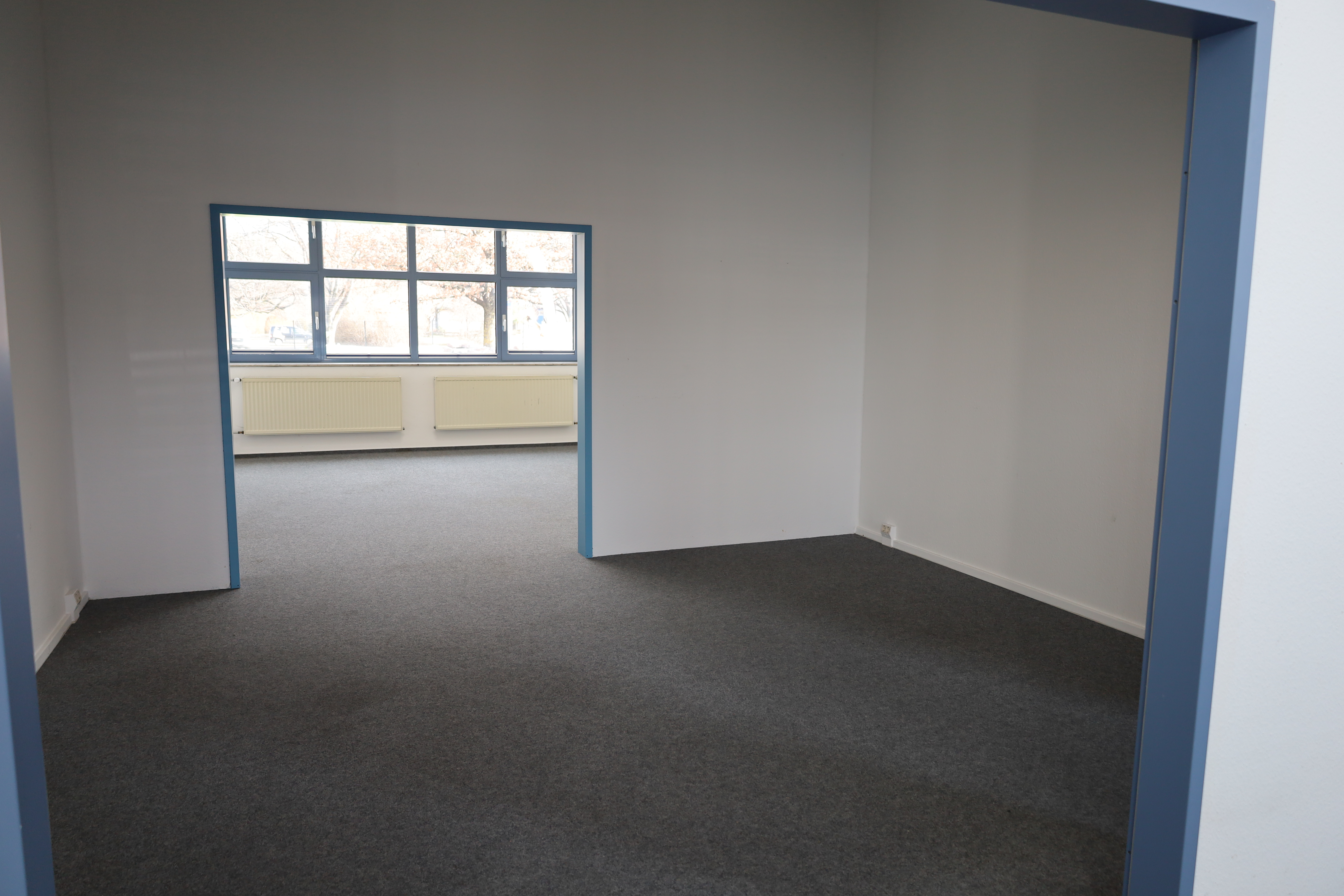 Vom offenen und lichtdurchfluteten Eingangsbereich erreicht man die 3 fast gleich großen Räume, welche bisher als Büroräume genutzt wurden. Alle drei Räume haben eine große Fensterfront und jeweils eine Lichtkuppel, die mittlere Kuppel läßt sich elektrisch öffnen.
