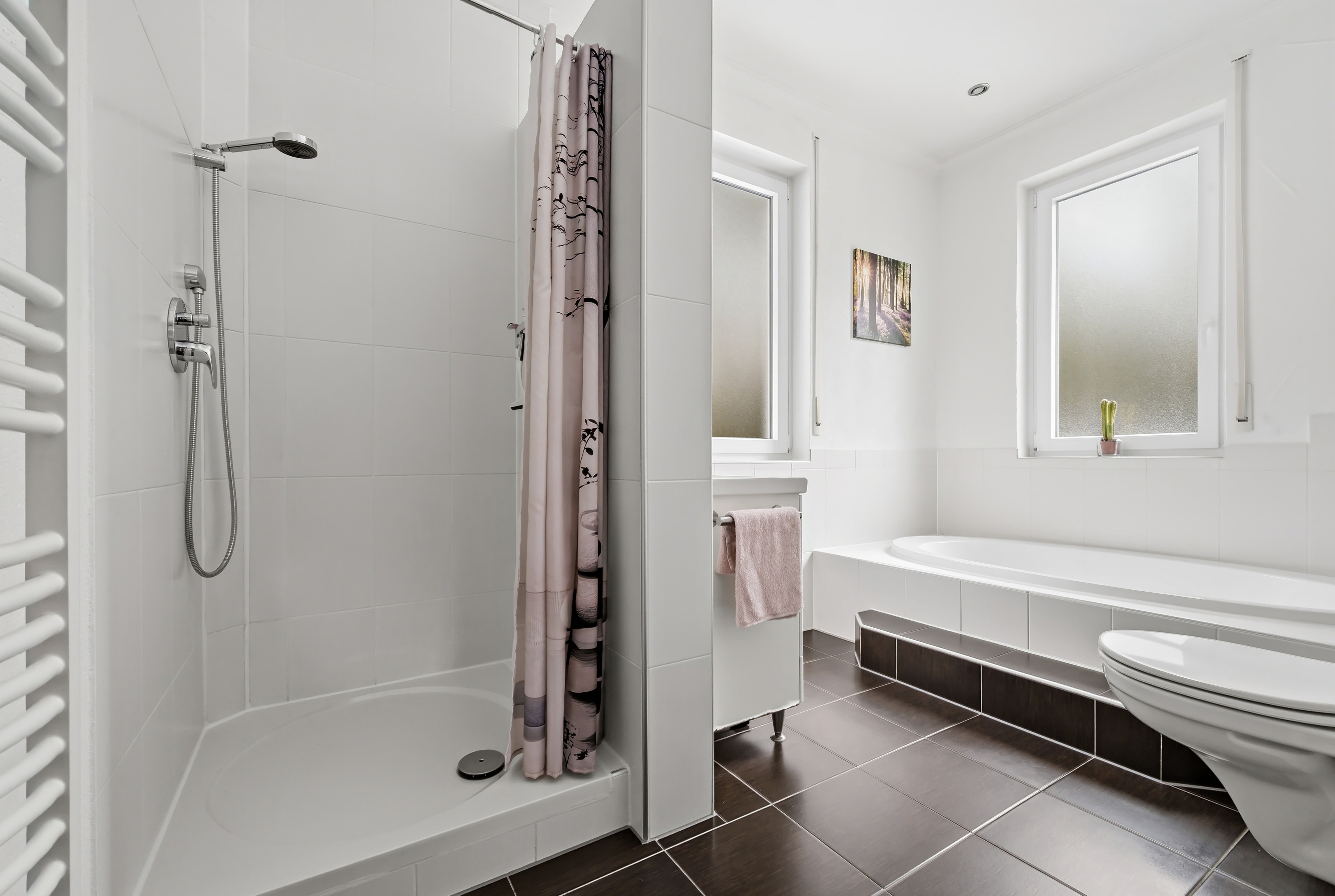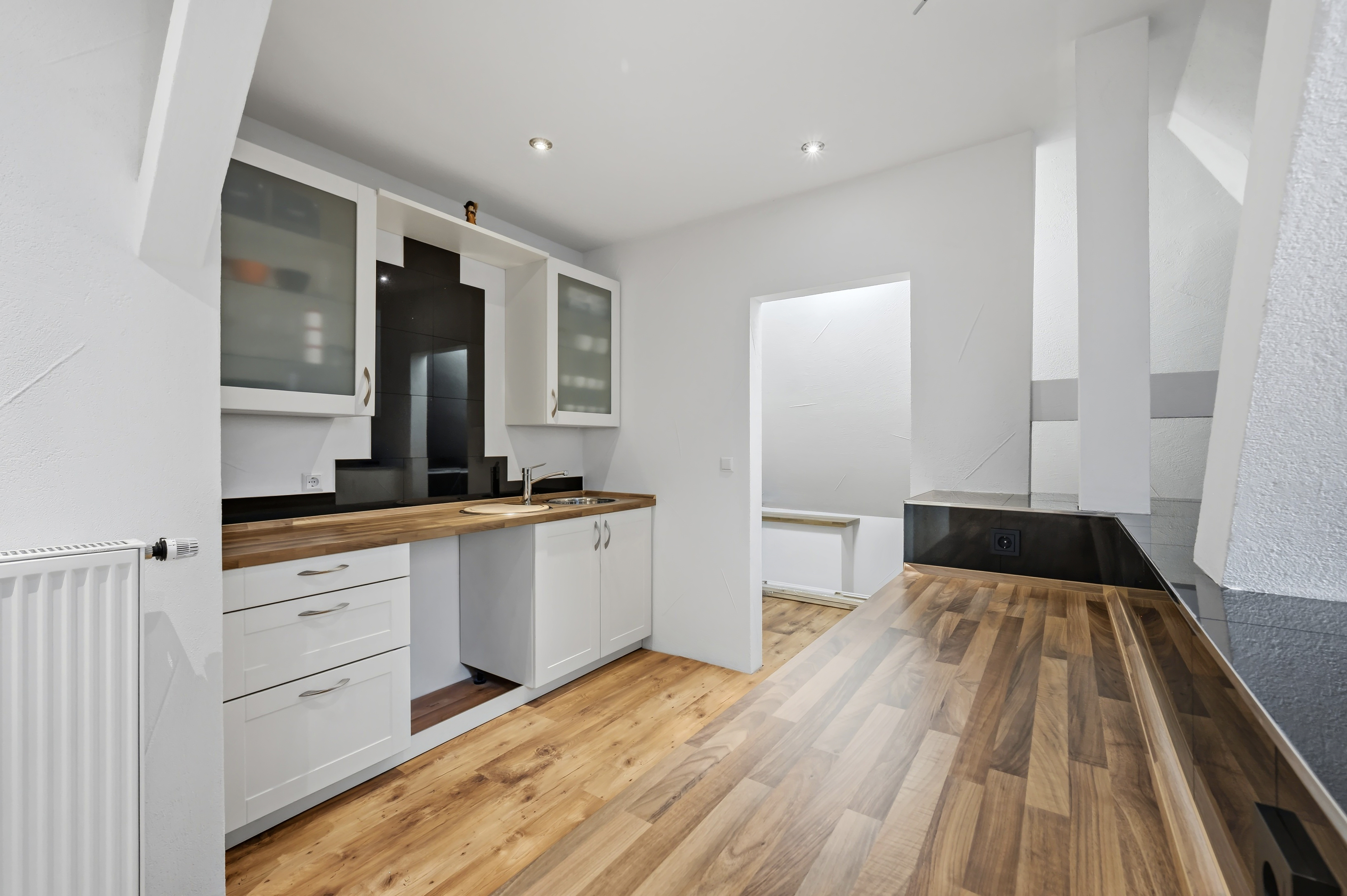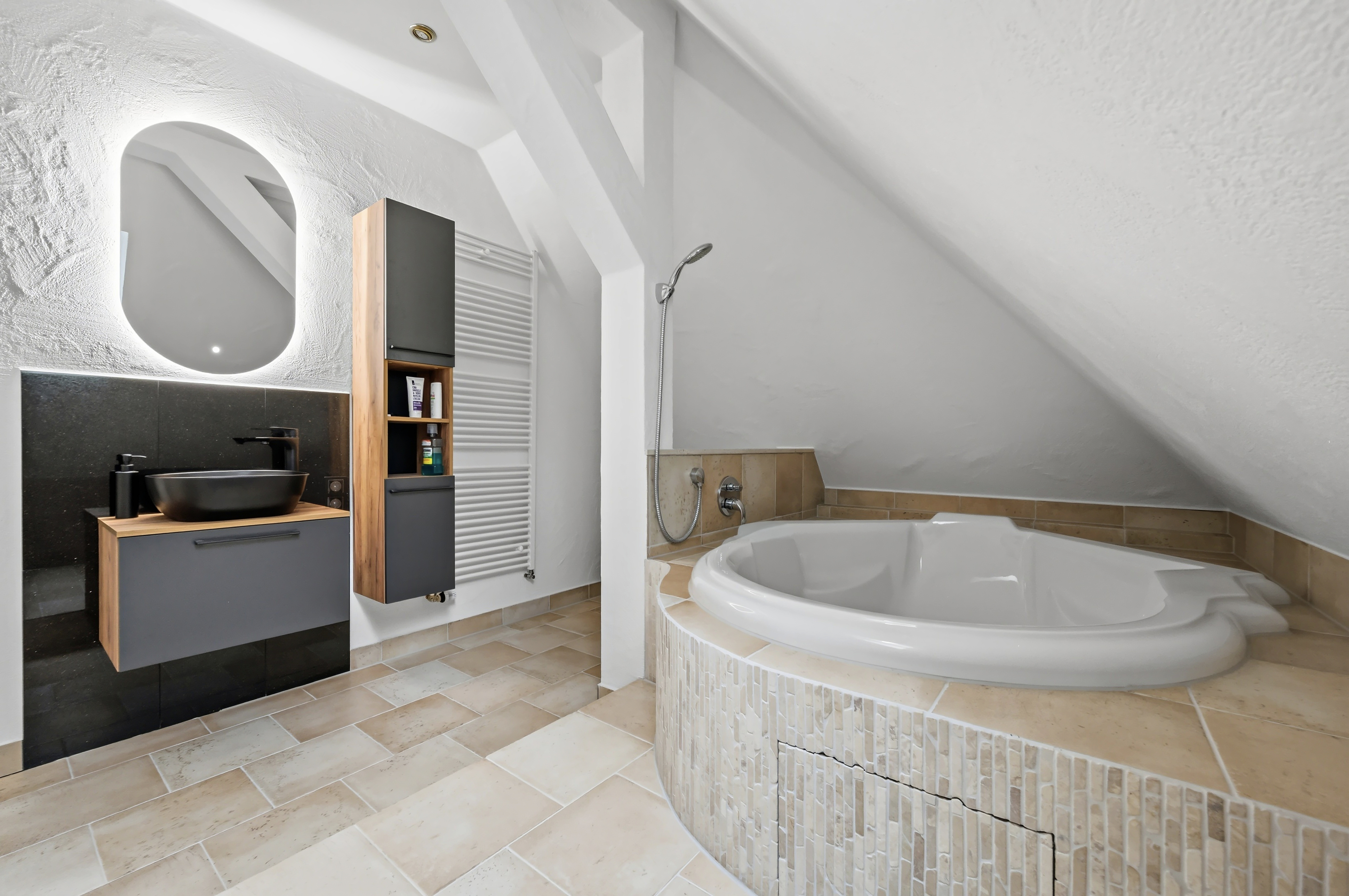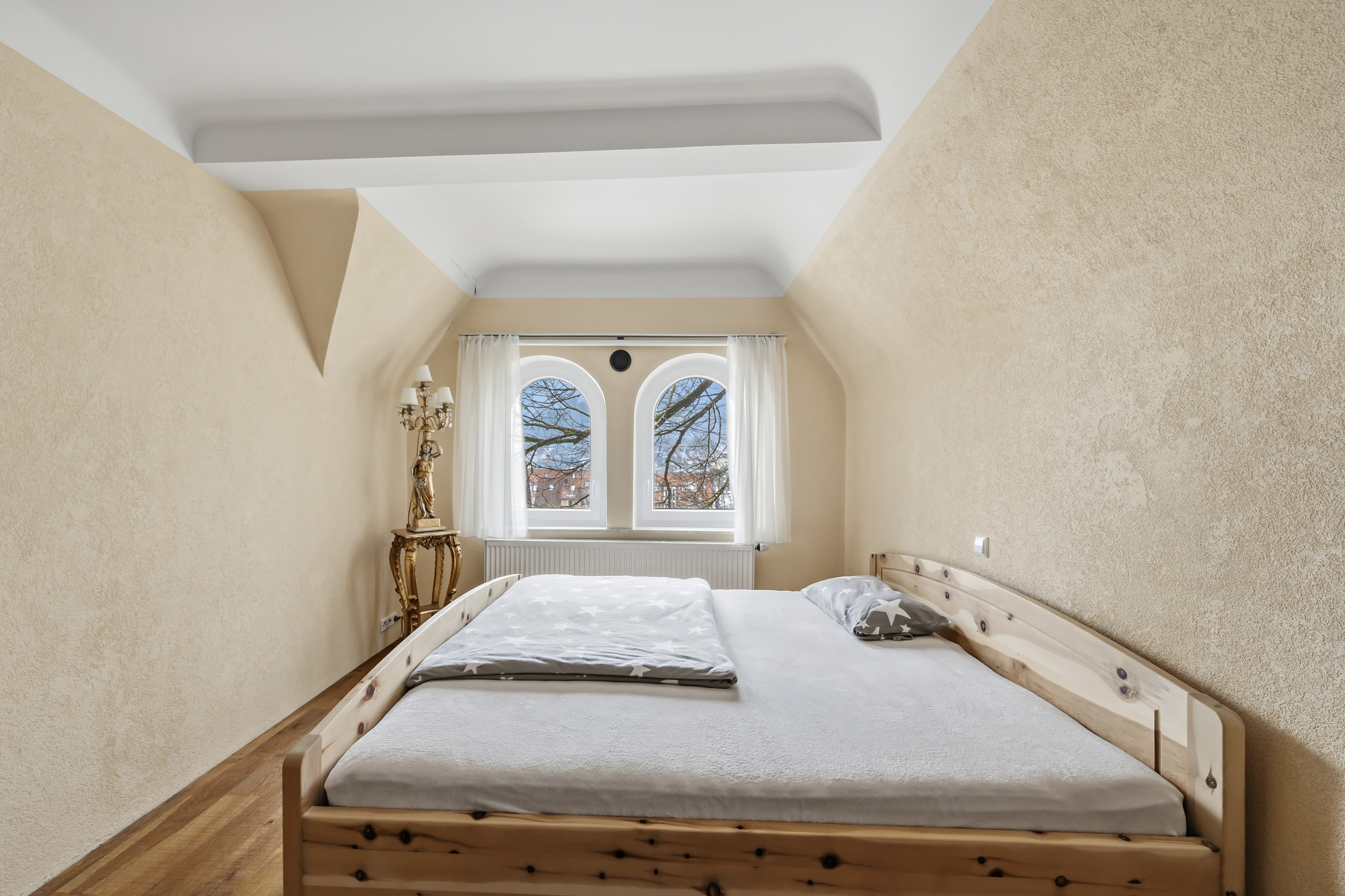 Im 2. Obergeschoss ist die vierte Wohnung mit rund 112 m² Wfl., welche sich über 2 Stockwerke verteilt. Neben dem Gäste-WC ist die moderne Küche mit Speisekammer, das Badezimmer verfügt über eine begehbare Dusche, eine eingelassene Badewanne, eine Toilette, ein Waschtisch und Tageslichtfenster. Des weiteren sind ein Schlafzimmer und der offene Wohn- und Essbereich vorhanden mit Treppe in den Spitz, wo zwei weitere Studiozimmer sind.