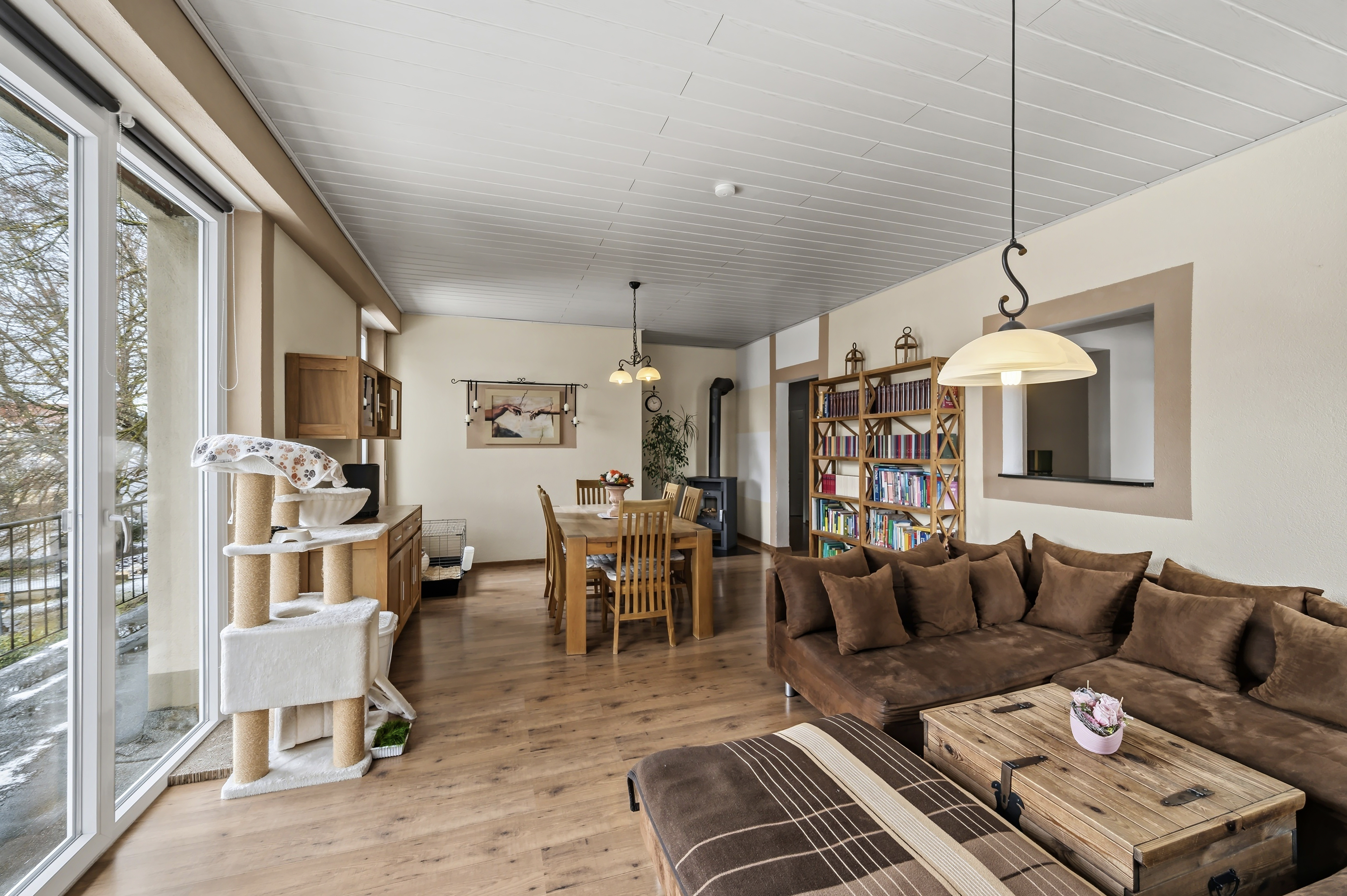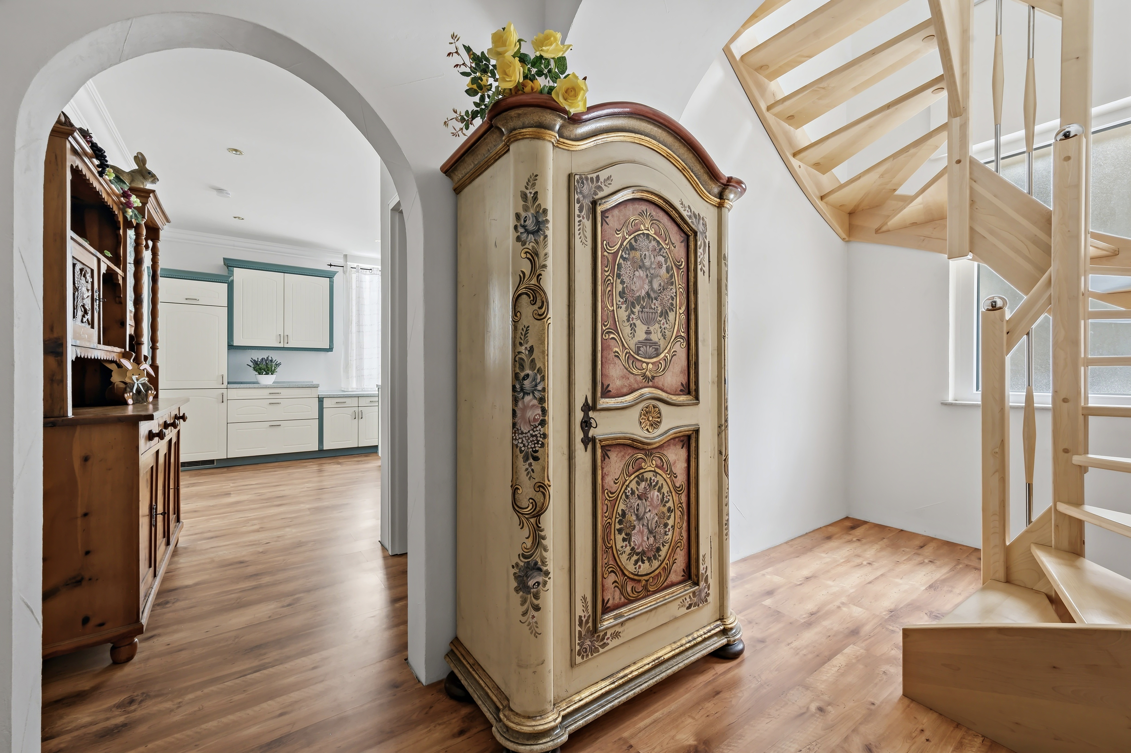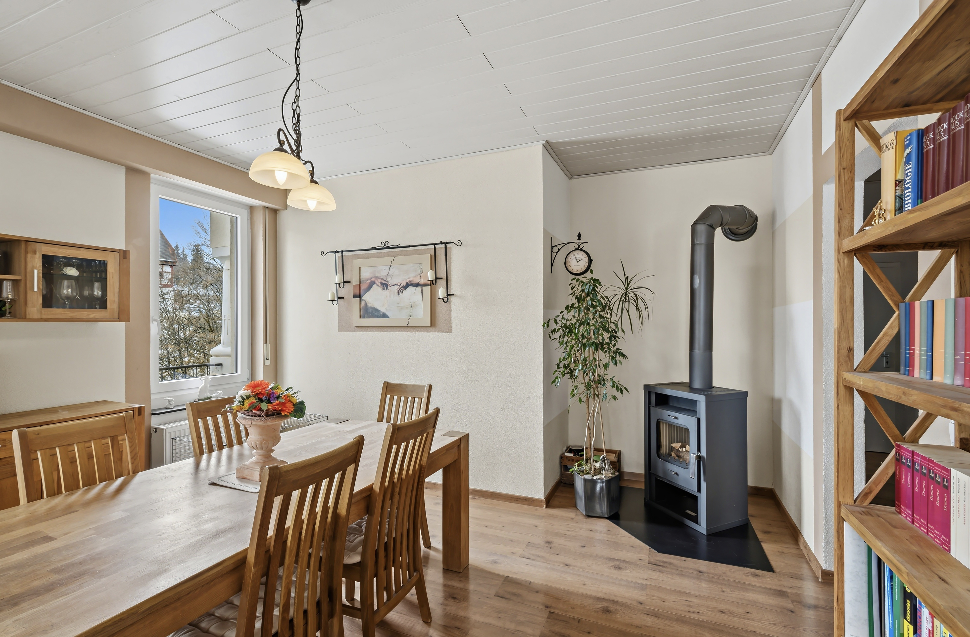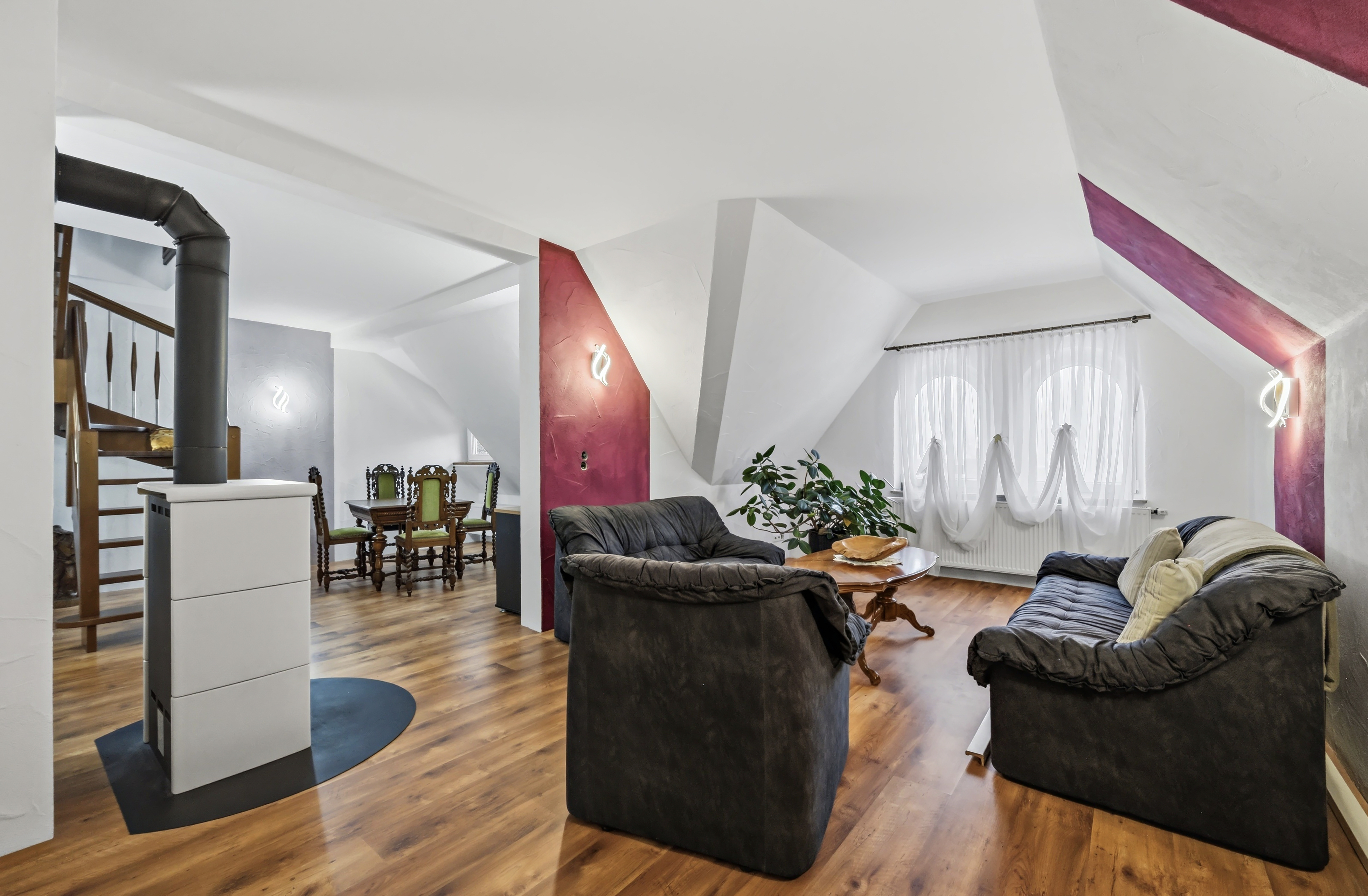 Die dritte Wohnung ist eine Maisonette-Wohnung über 3 Stockwerke mit ca. 136 m² Wfl. Im 1. OG ist ein Gäste-WC, eine moderne Einbauküche mit Speisekammer, vom Essbereich über 2 Stufen ist man im Wohnbereich mit Fußbodenheizung und einem Holz-Ofen. Über die Treppe im Flur ist das Schlafzimmer, ein Büro und das Bad ausgestattet mit einer Badewanne, einer Dusche, einer Toilette, einem Bidet, einem Waschtisch und einem Fenster. Eine weitere Treppe führt in den Dachspitz in ein Studiozimmer.