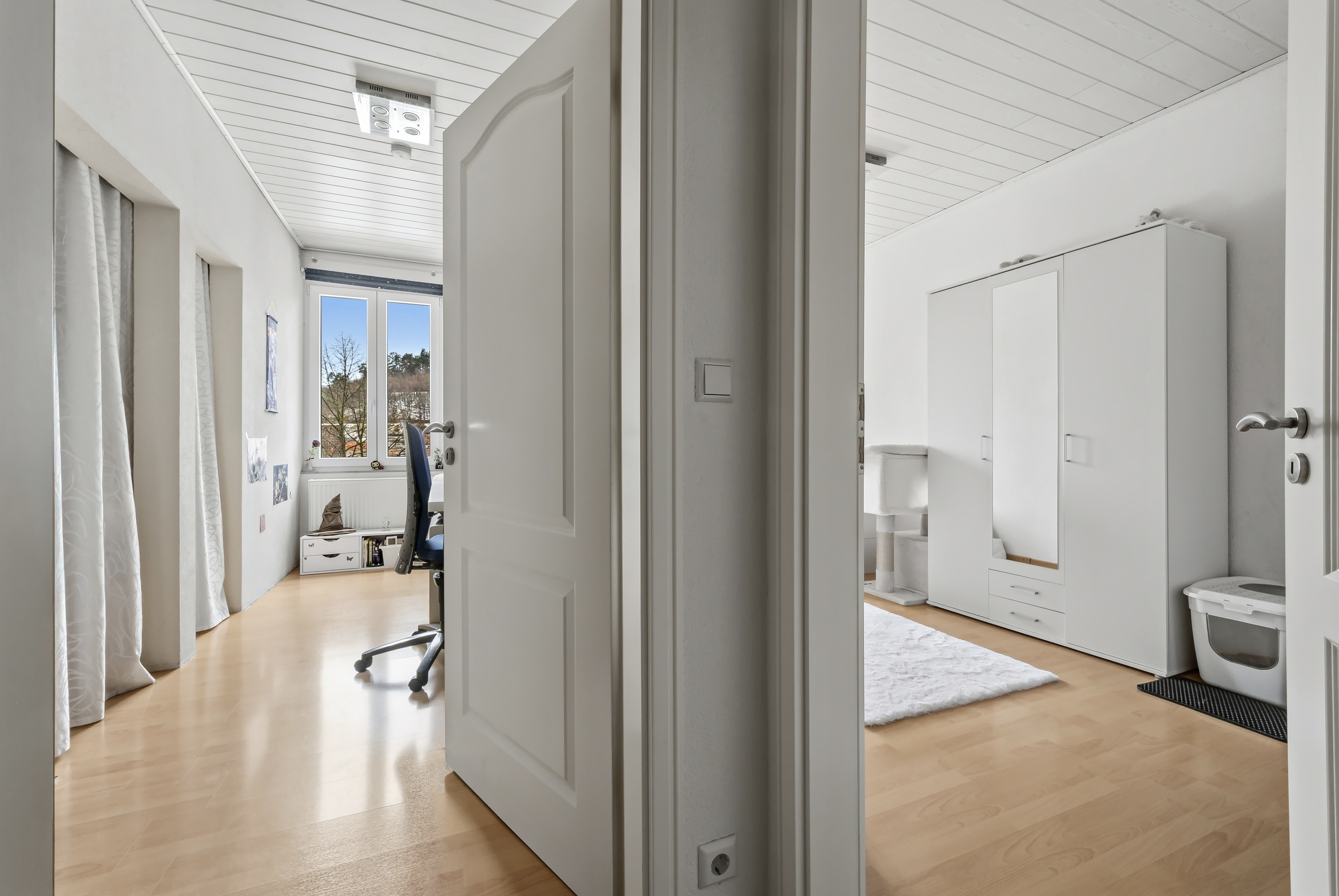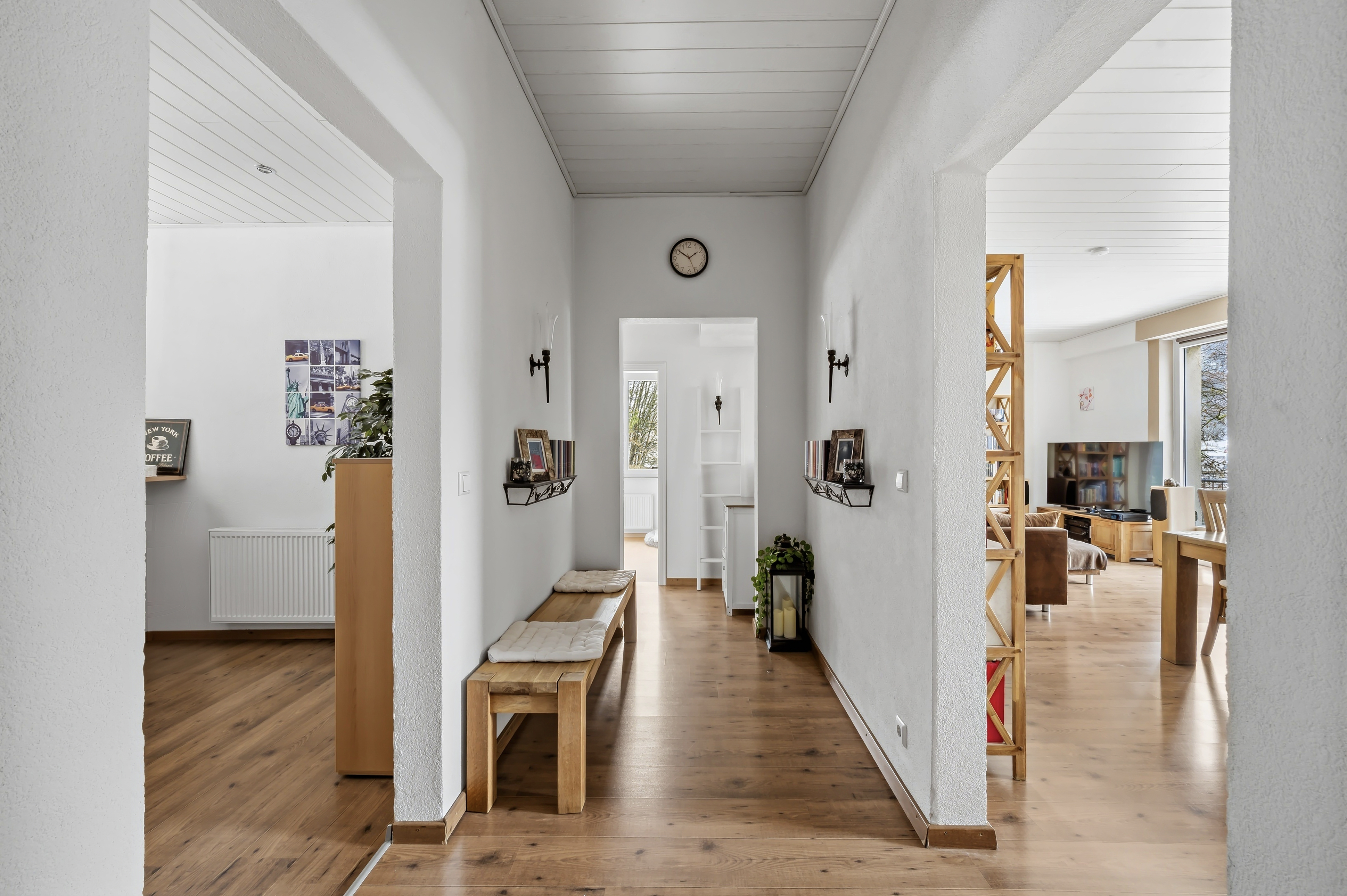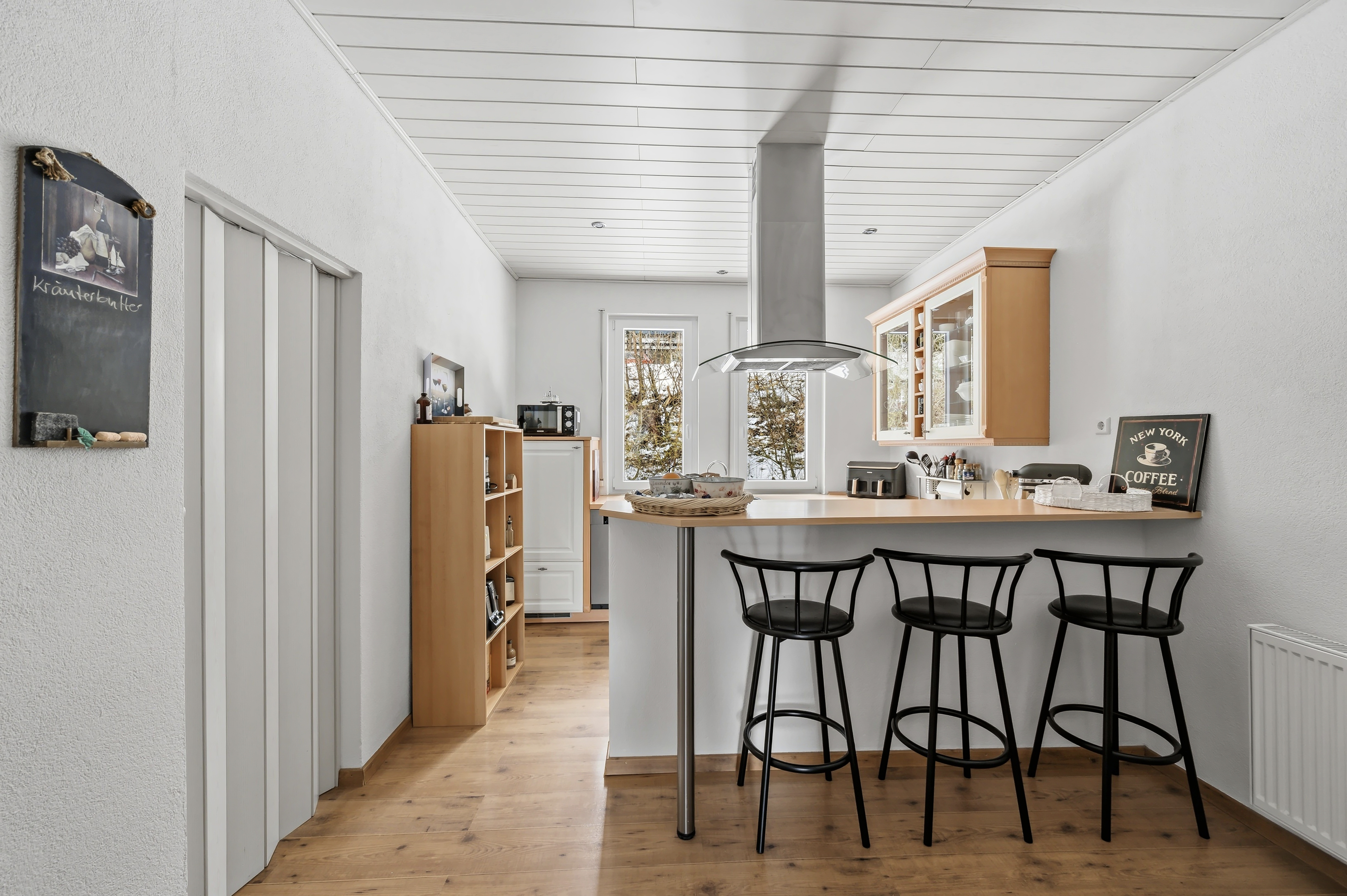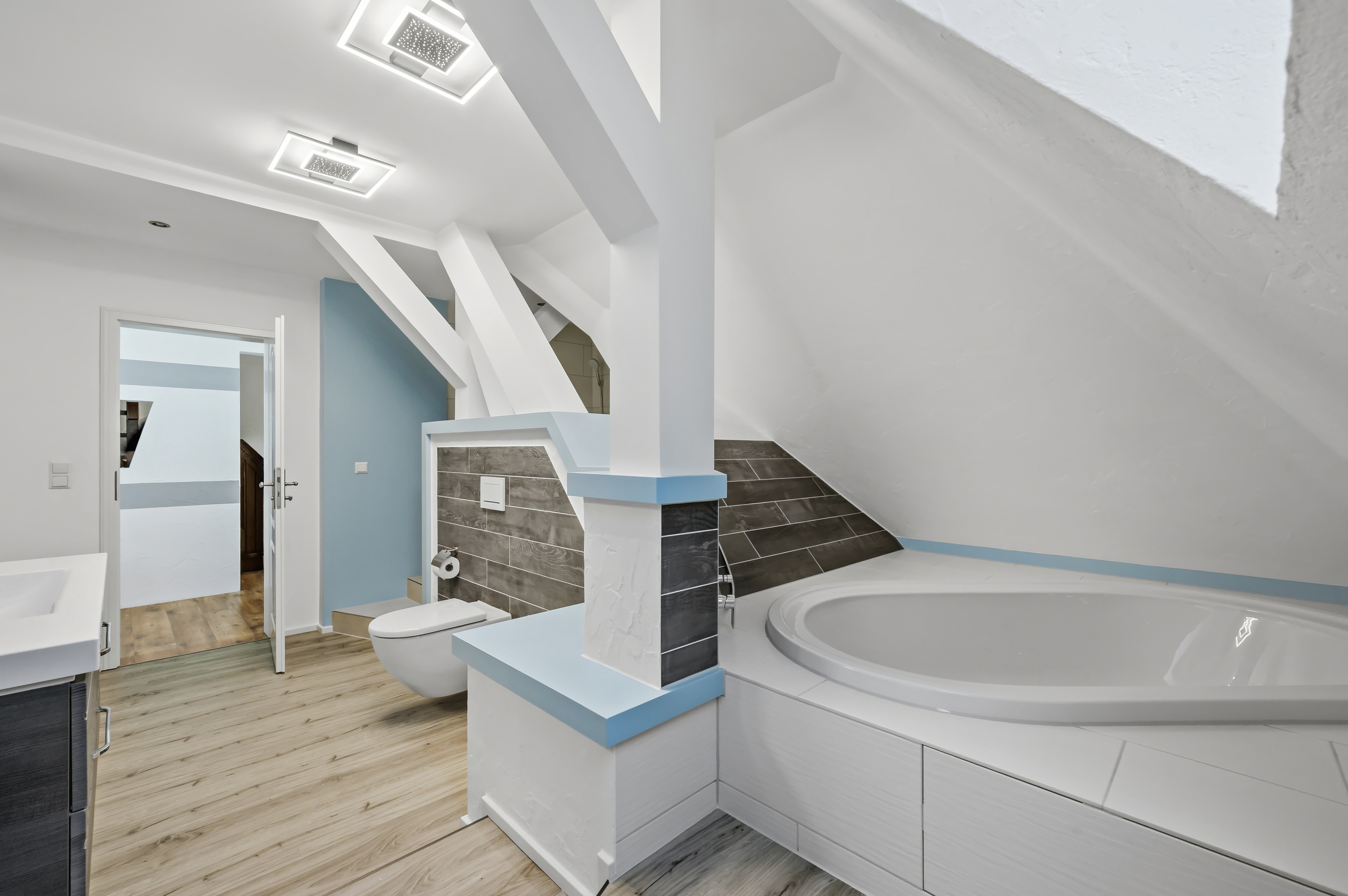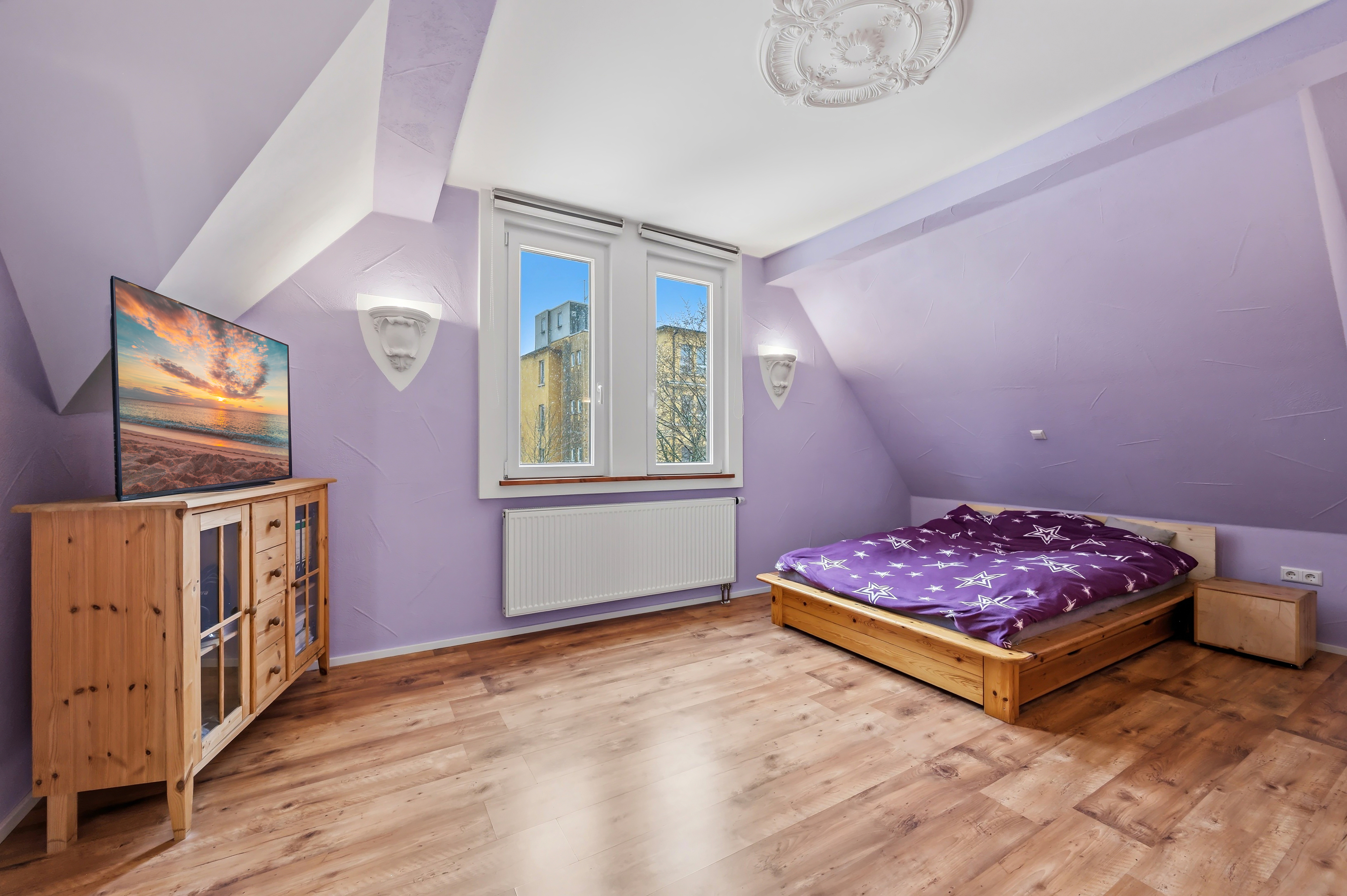 Die dritte Wohnung ist eine Maisonette-Wohnung über 3 Stockwerke mit ca. 136 m² Wfl. Im 1. OG ist ein Gäste-WC, eine moderne Einbauküche mit Speisekammer, vom Essbereich über 2 Stufen ist man im Wohnbereich mit Fußbodenheizung und einem Holz-Ofen. Über die Treppe im Flur ist das Schlafzimmer, ein Büro und das Bad ausgestattet mit einer Badewanne, einer Dusche, einer Toilette, einem Bidet, einem Waschtisch und einem Fenster. Eine weitere Treppe führt in den Dachspitz in ein Studiozimmer.