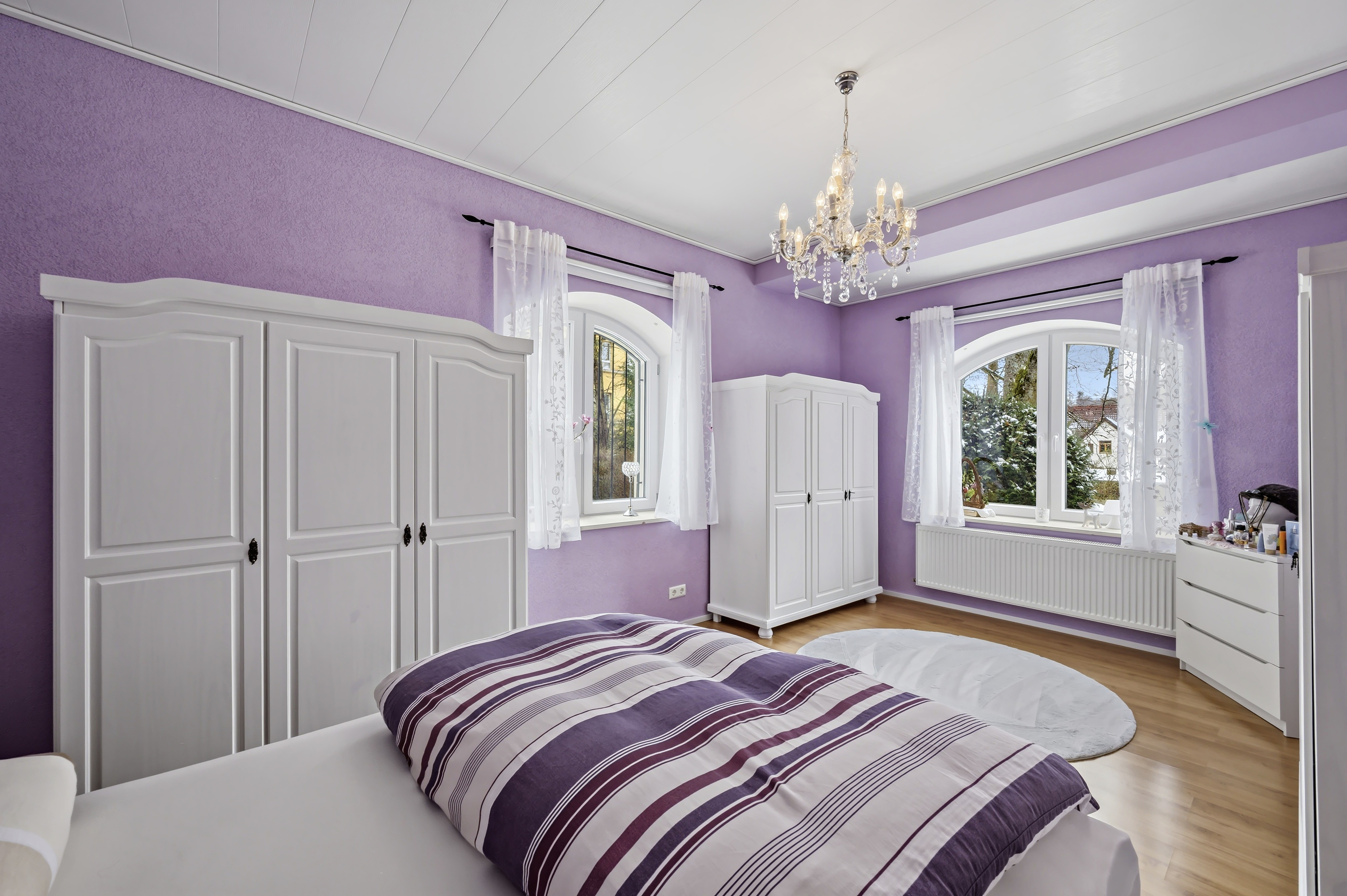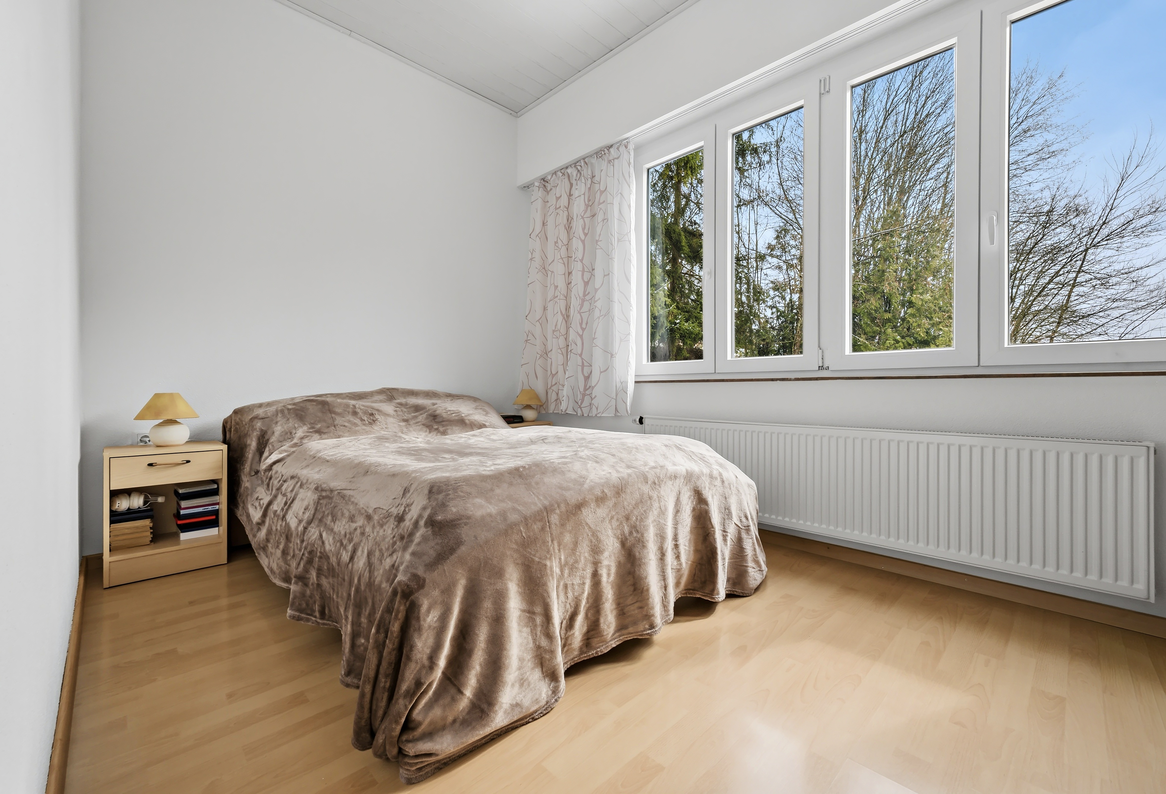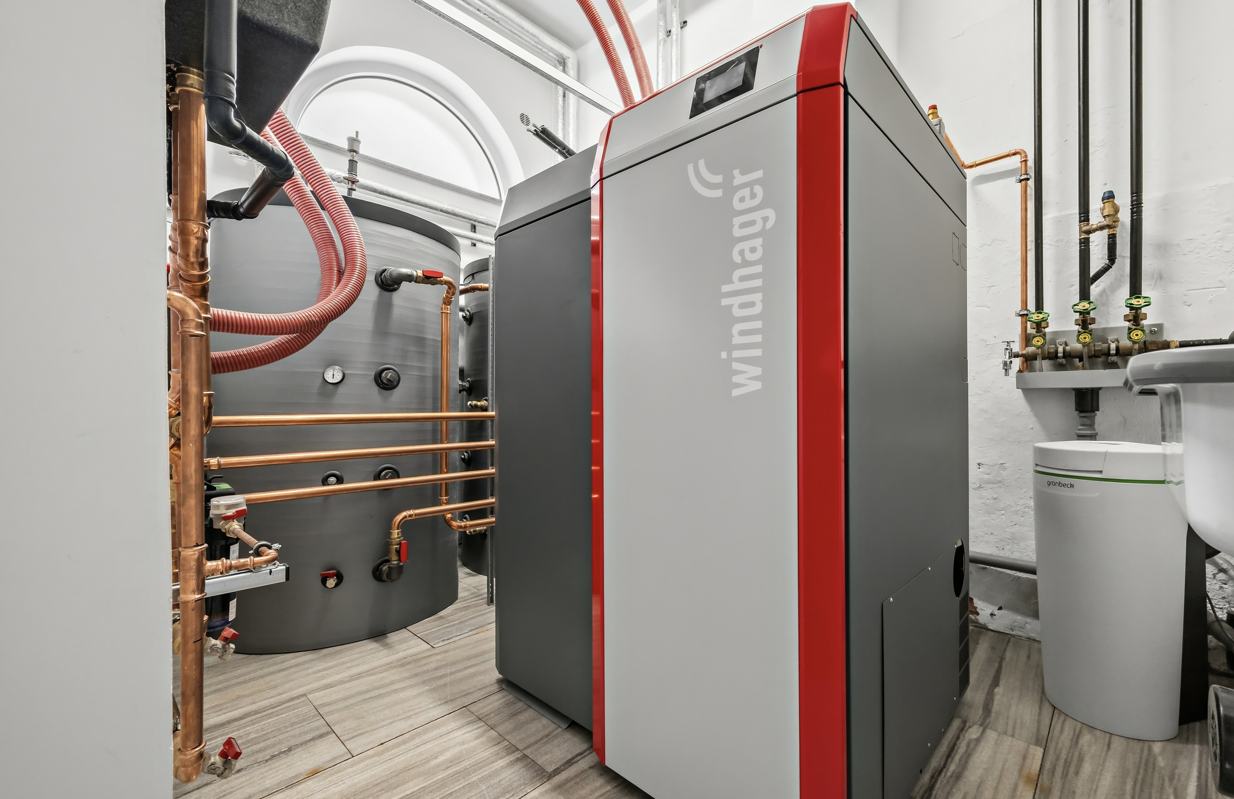 Im Erdgeschoss ist ein großes Zimmer, mit Echtholzparkett und Zierelementen um die Fenster. Hier sind auch der Heizraum und das Pelletlager.