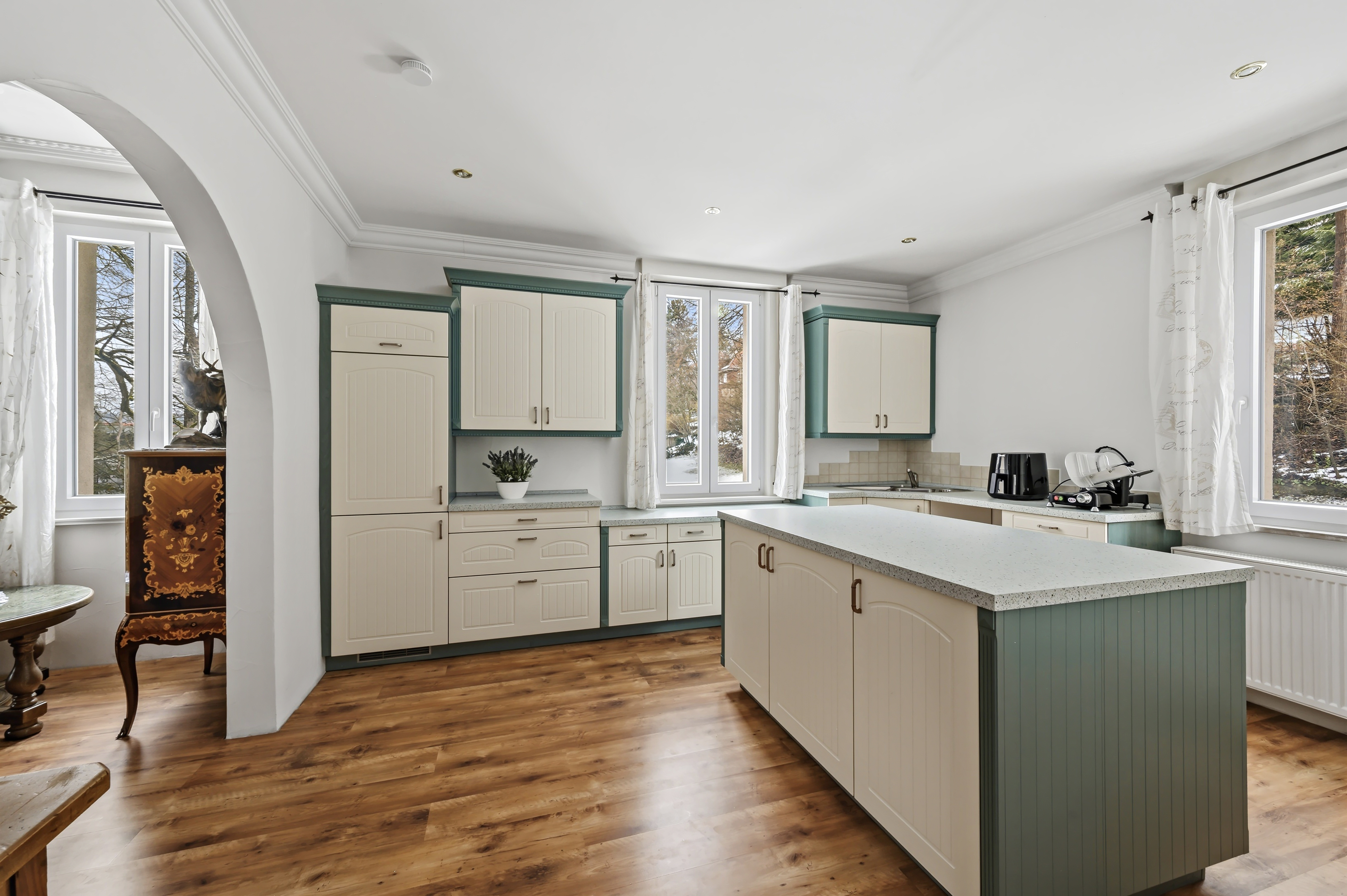 Im 1. Obergeschoss ist die zweite Wohnung mit rund 125 m² Wohnfläche. Hier sind 2 Kinderzimmer, ein Elternschlafzimmer, eine große Einbauküche mit Speisekammer, das Badezimmer mit Dusche, Wanne, Toilette, Waschtisch, Tageslichtfenster. Das Gäste-WC ist separat. Der offene Wohn- und Essbereich mit Holz-Ofen hat Zugang zum Balkon, wo man seinen eigenen Park bewundern kann.