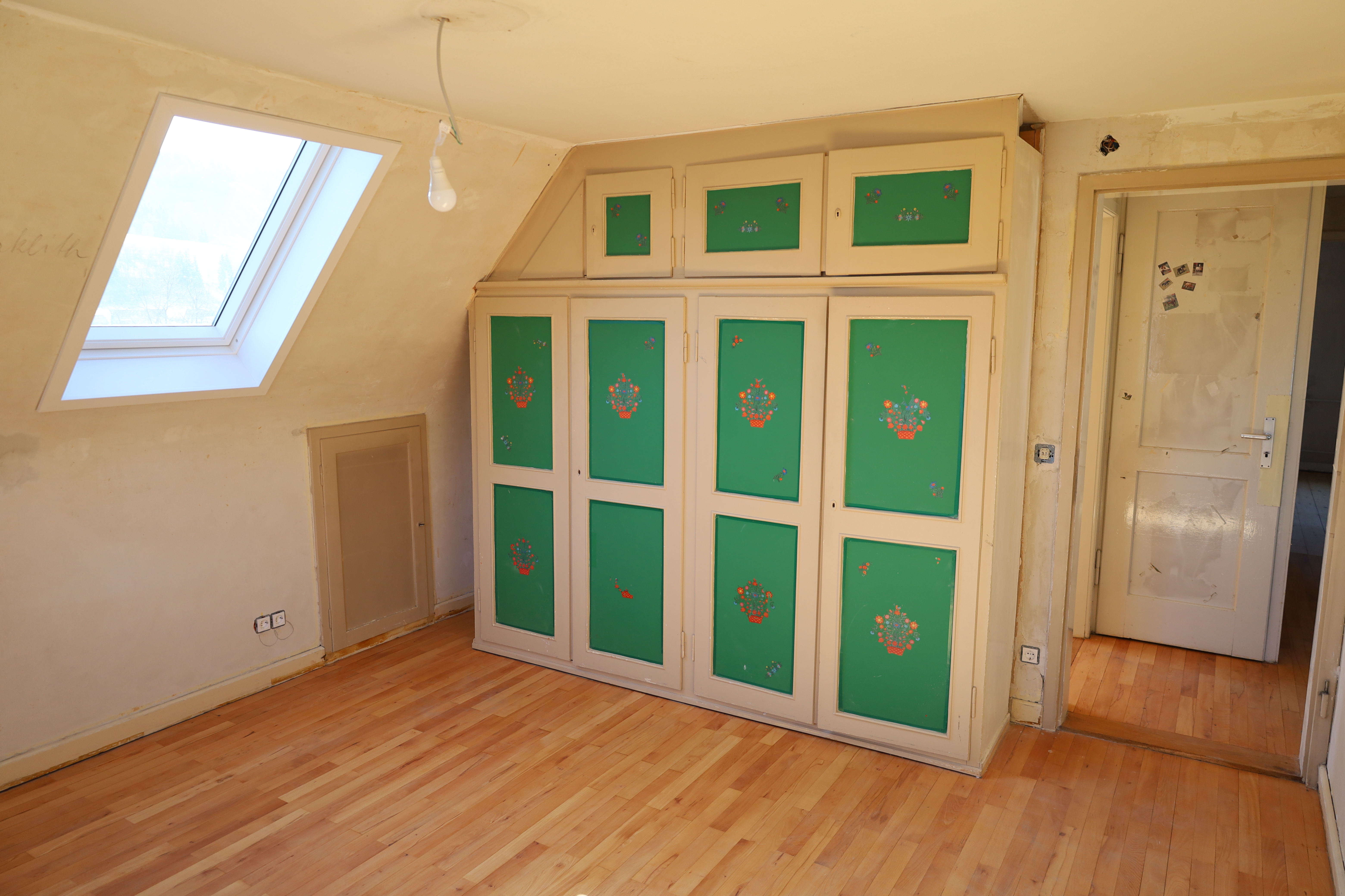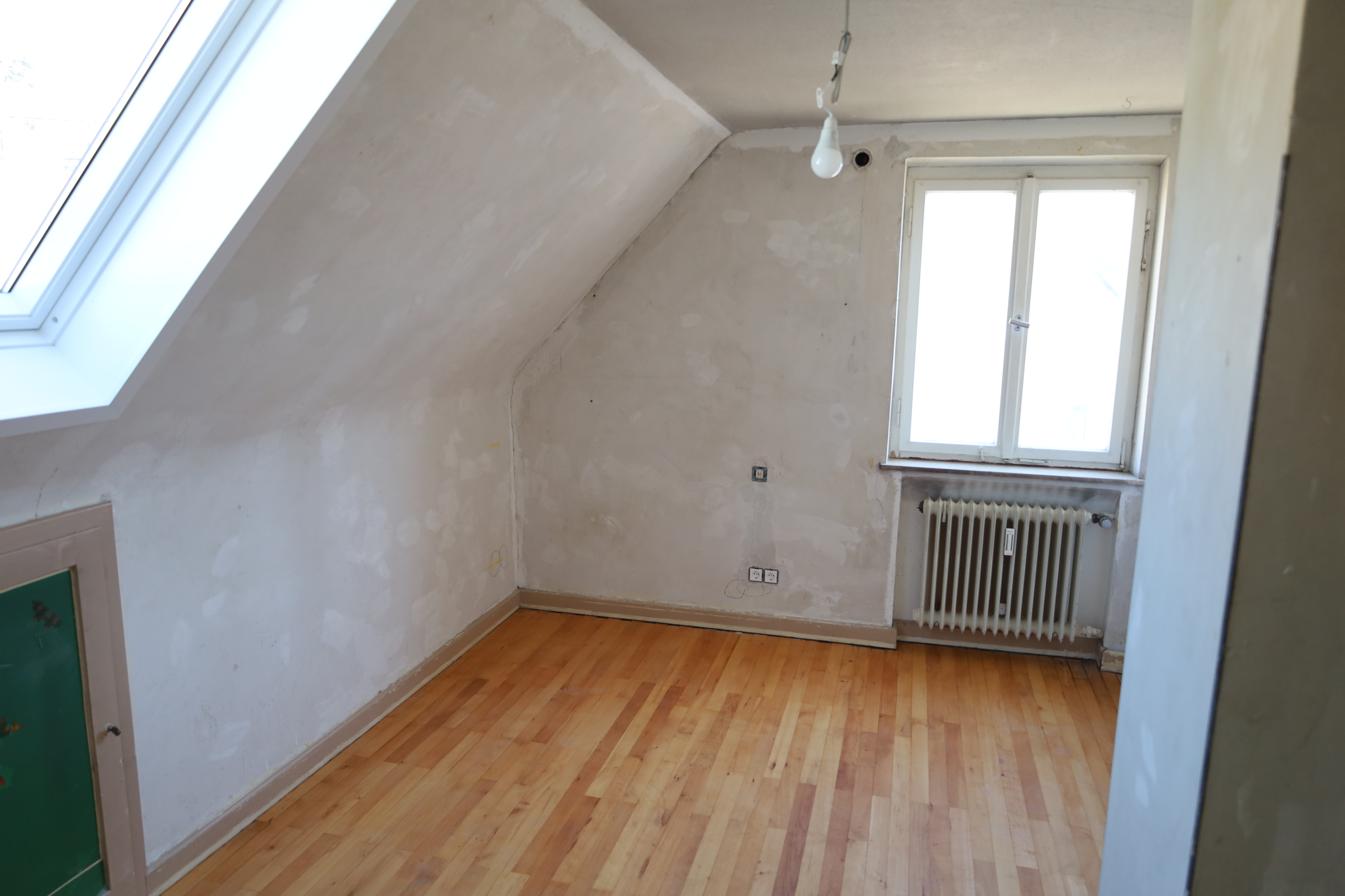 Das Dach ist komplett ausgebaut: 4 Zimmer, Küche (oder Badezimmer) und separates WC. Eine Holztreppe führt ins 2. Dachgeschoss, das aktuell als Abstellfläche genutzt wird.