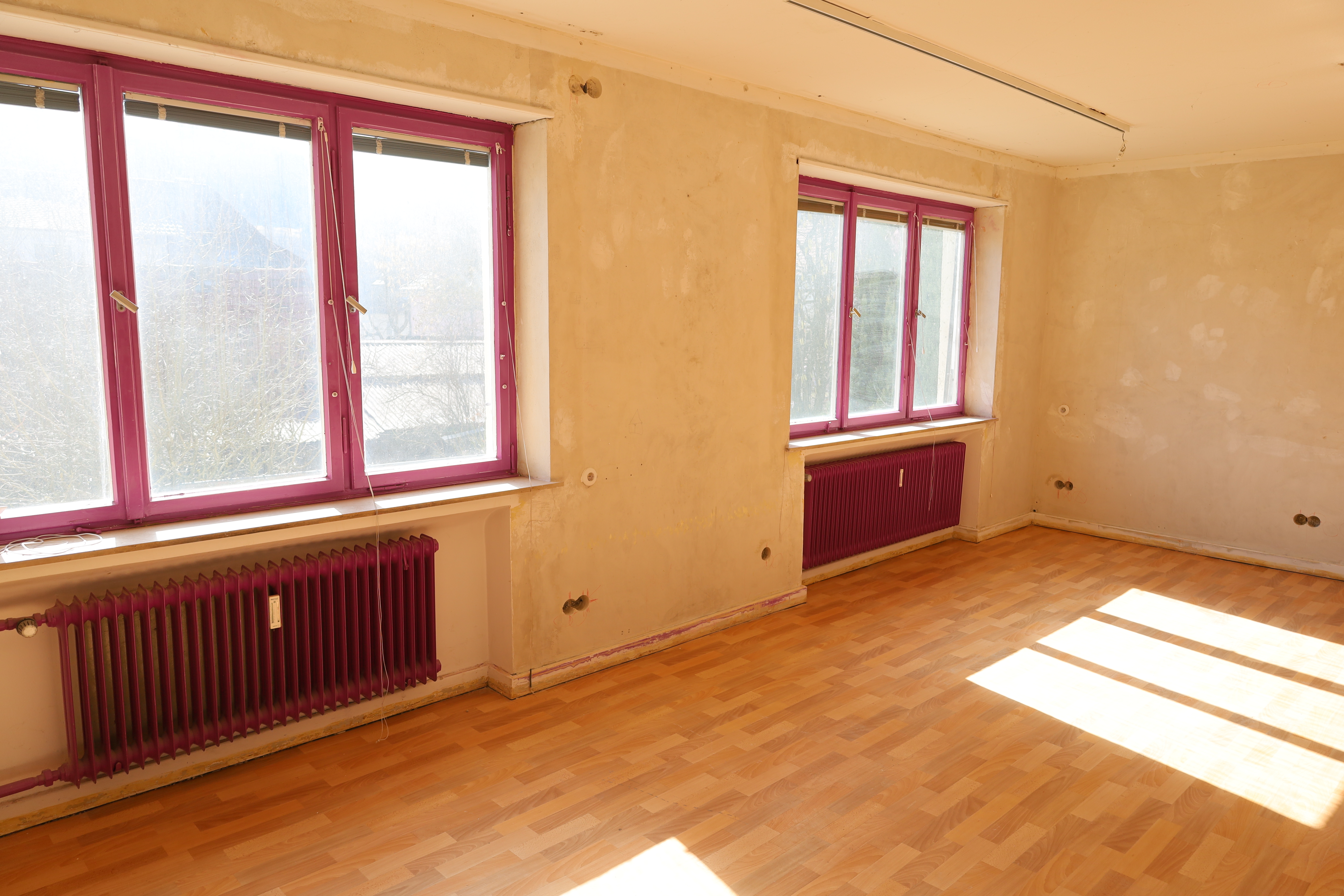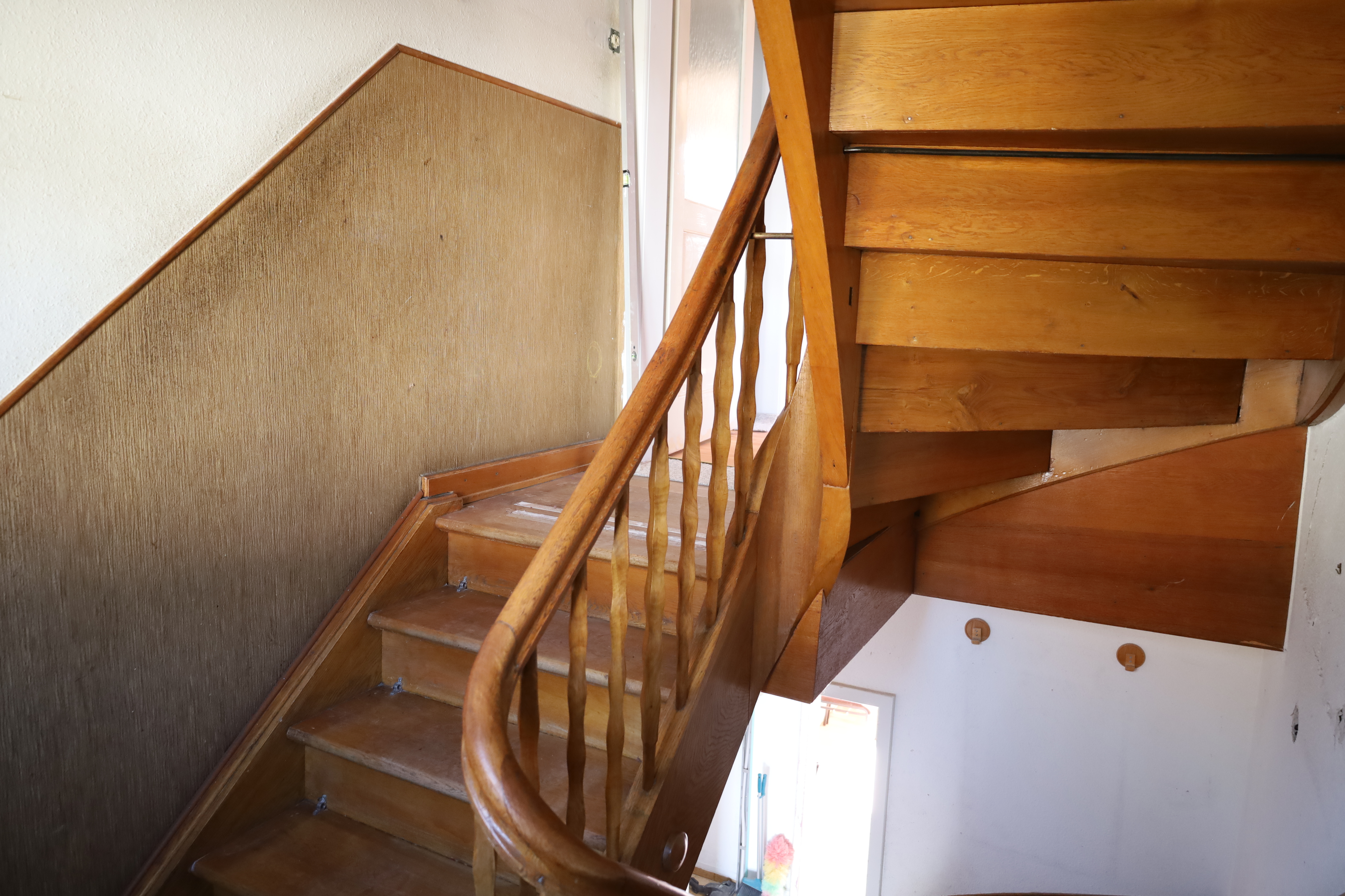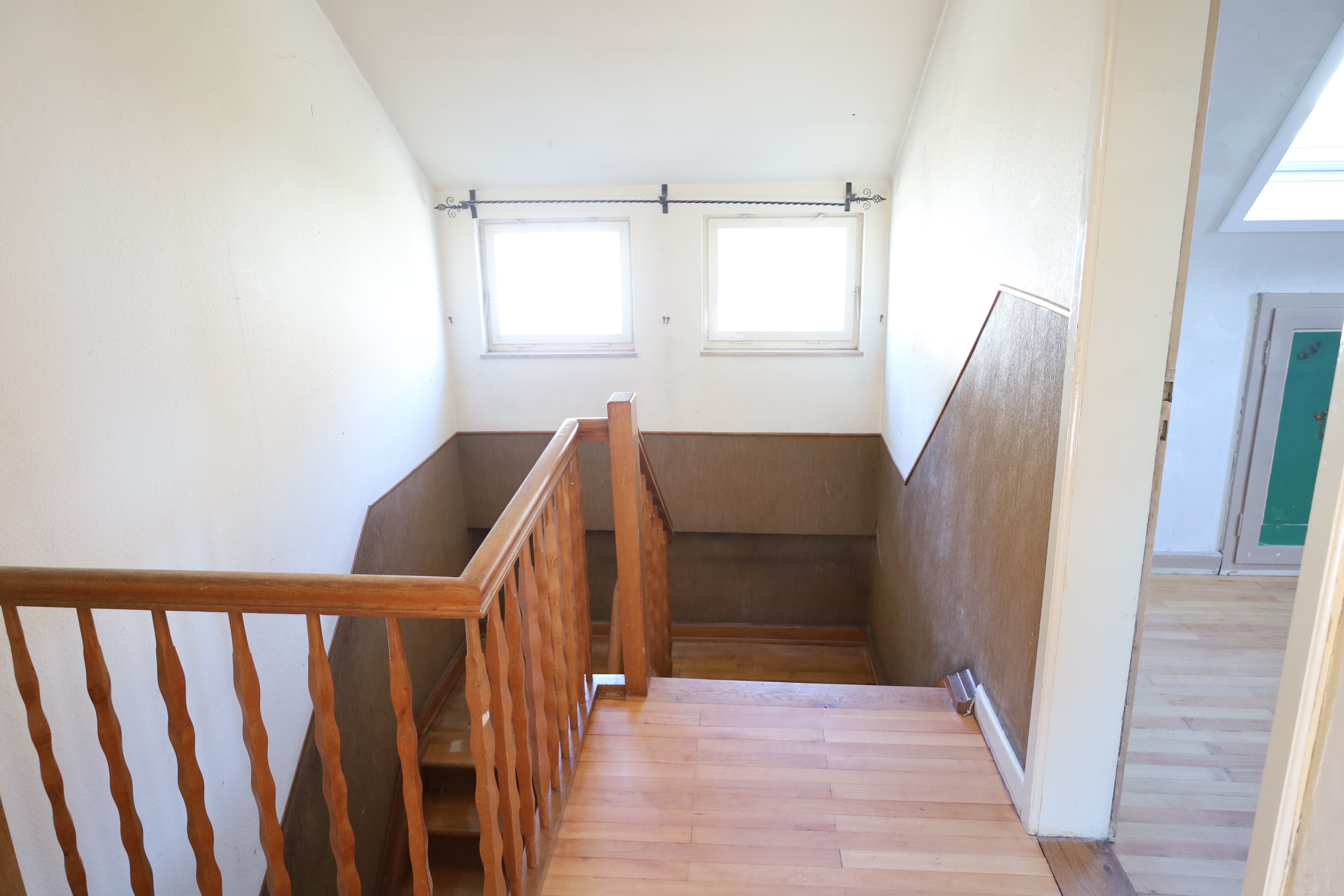 Die Räume im Obergeschoss wurden bereits modernisiert und vergrößert, sodass eine offene, einladende Wohnatmosphäre entstanden ist: Über die schöne Diele erreicht man die offene Küche mit Zugang zum Südbalkon und viel Platz für ein Esszimmer und ein offenes Wohnzimmer. Daneben befindet sich ein schönes Schlafzimmer. Neben dem vorbereiteten neuen und großen Badezimmer gibt es einen Hauswirtschaftsraum bzw. eine Speisekammer.