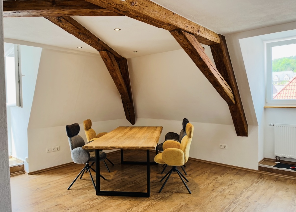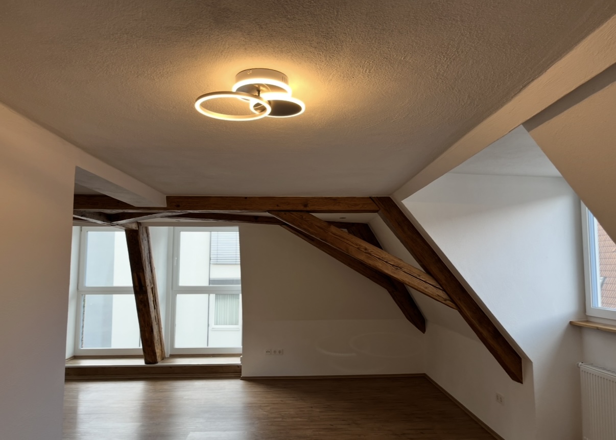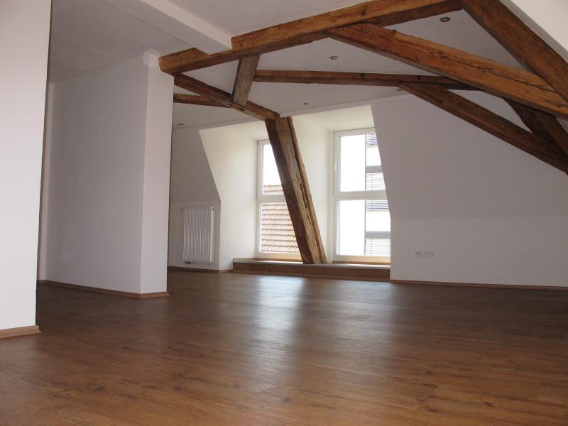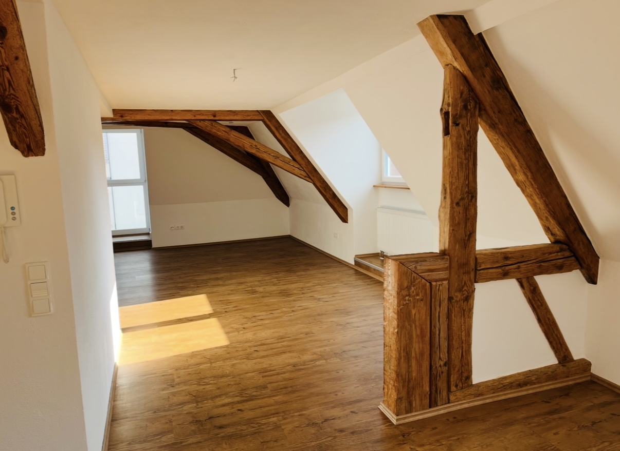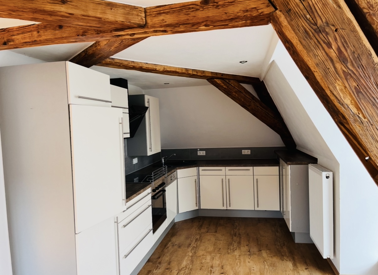 Die alten Holzbalken und die Dachgauben geben den Räumen ihren besonderen Charakter. Die Wohnung ist sehr großzügig und lichtdurchflutet. Es wurden 3 Dachgauben eingebaut und 4 Dachfenster. Das große Fensterelement ist nach Süden ausgerichtet, hier befindet sich die offene Küche, das Esszimmer und das Wohnzimmer. Die Wohnung hat ein Badezimmer mit Wanne und Dusche, einen Abstellraum und ein Schlafzimmer. Ein weiteres Zimmer kann problemlos abgetrennt werden.
