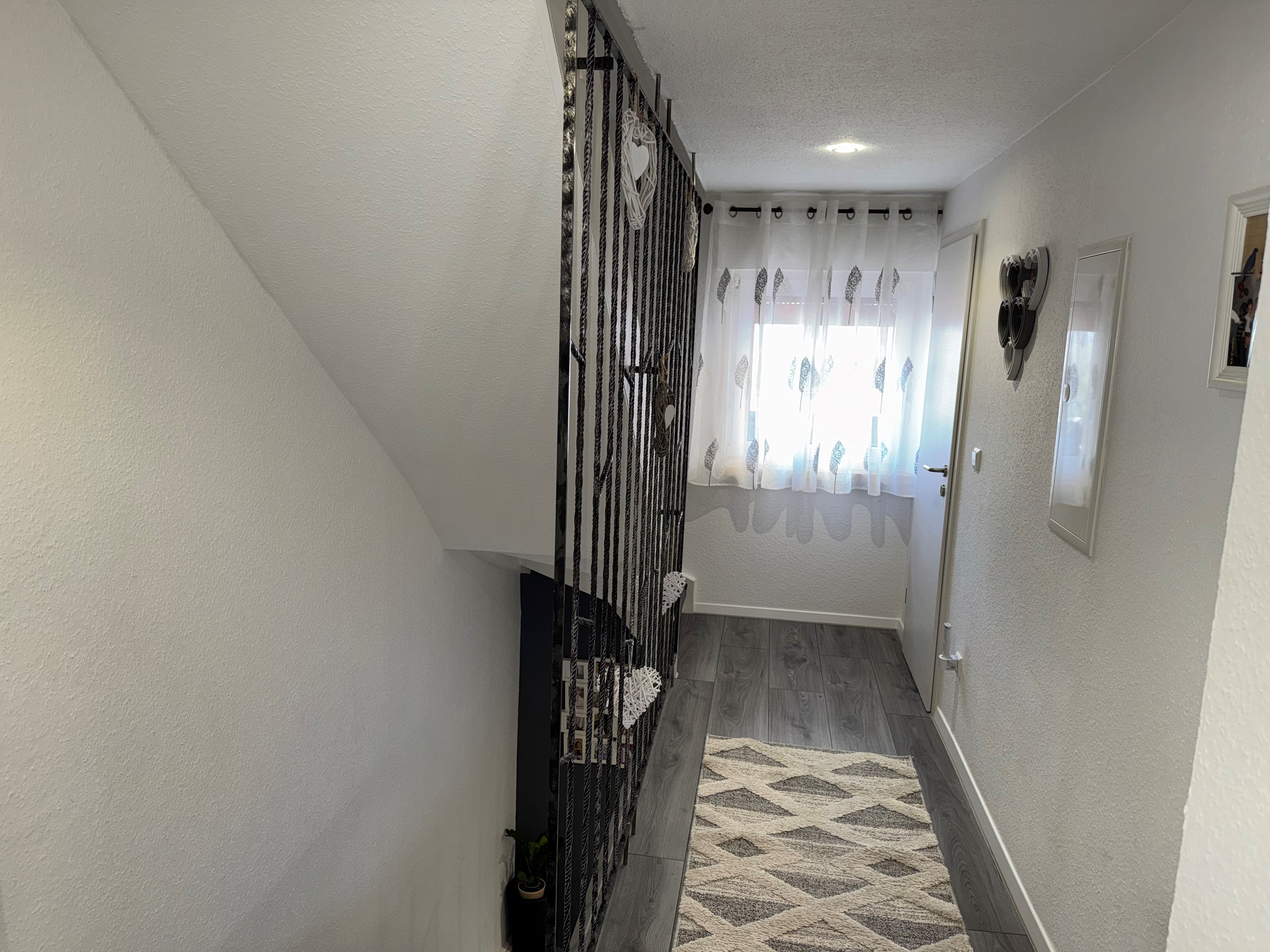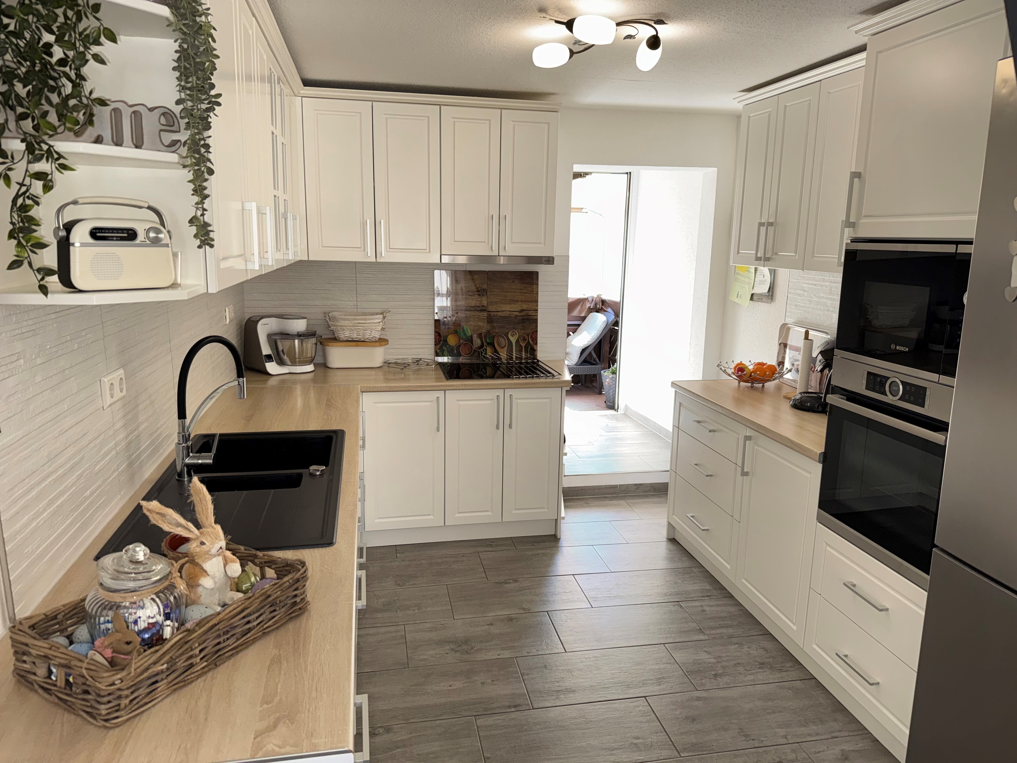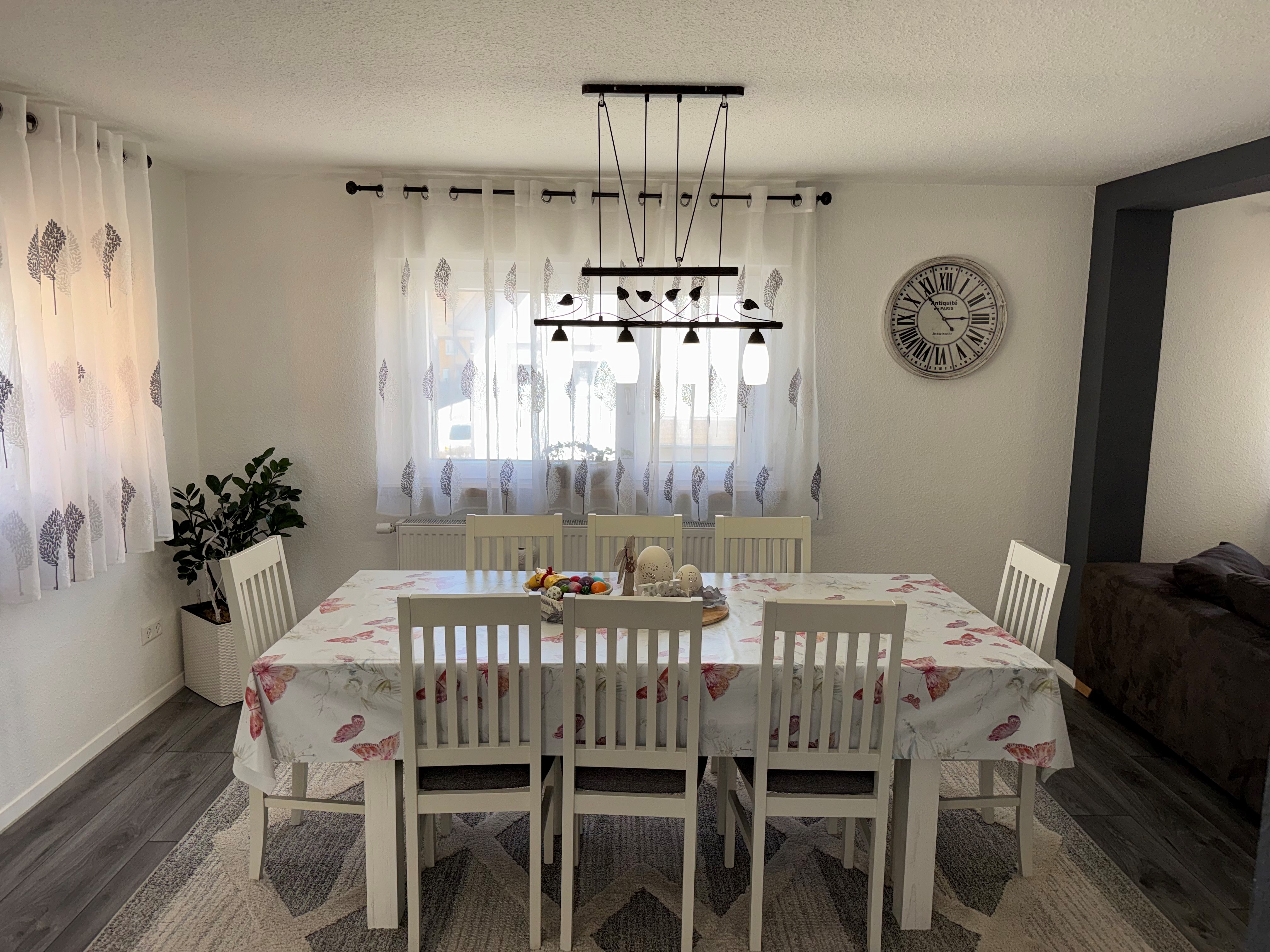 Im Obergeschoss befindet sich das Wohnzimmer. Angrenzend ist das Esszimmer mit Zugang zur Küche. Die neuwertig und moderne Einbauküche ist mit allen elektronischen Geräten ausgestattet.
