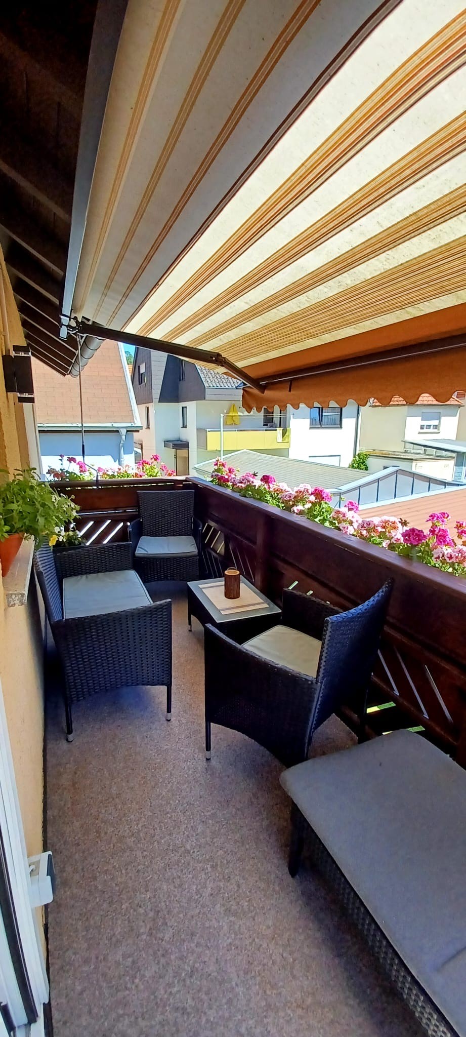 Der Balkon mit Ausblick über die Stadt lädt zum entspannen ein. Eine Markise schützt Sie vor der starken Sonne.