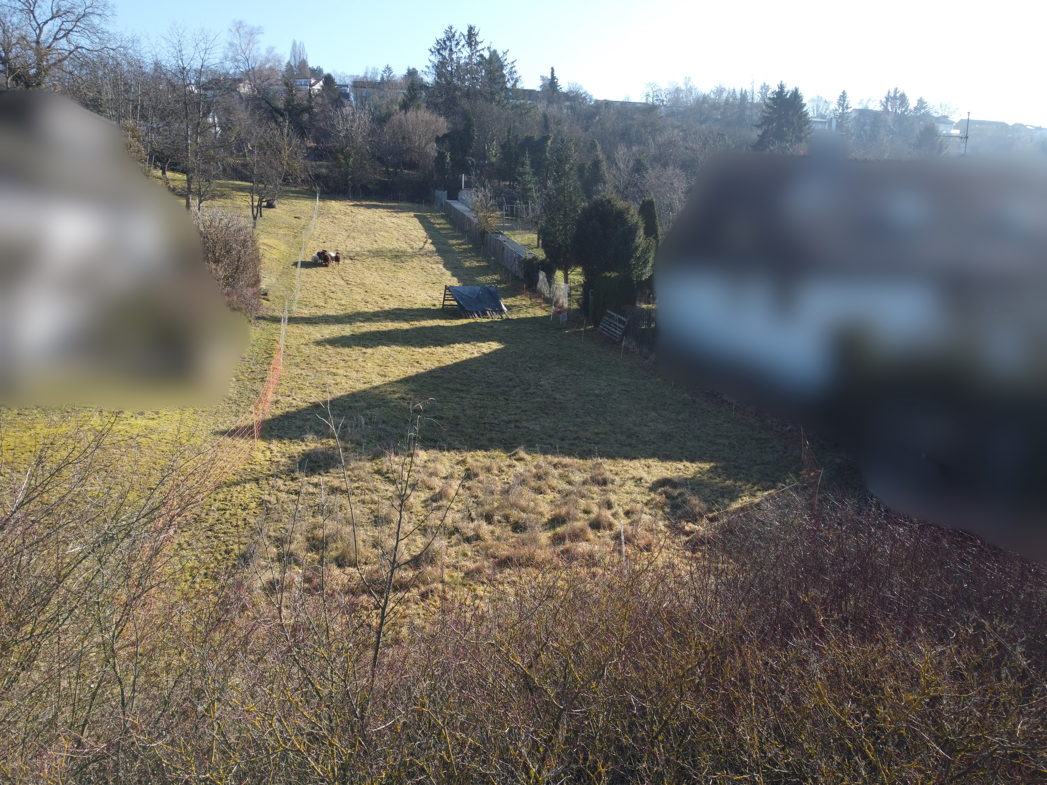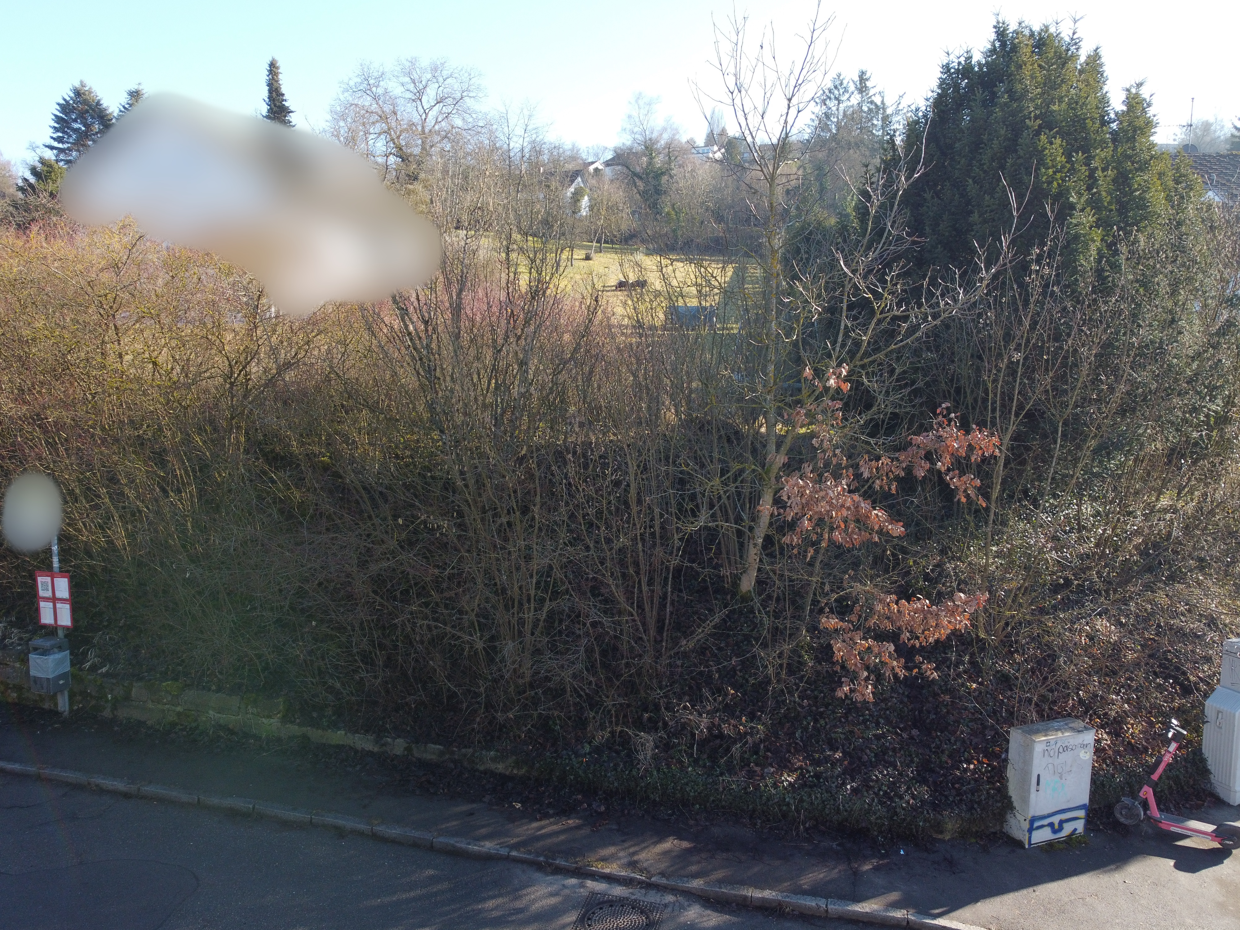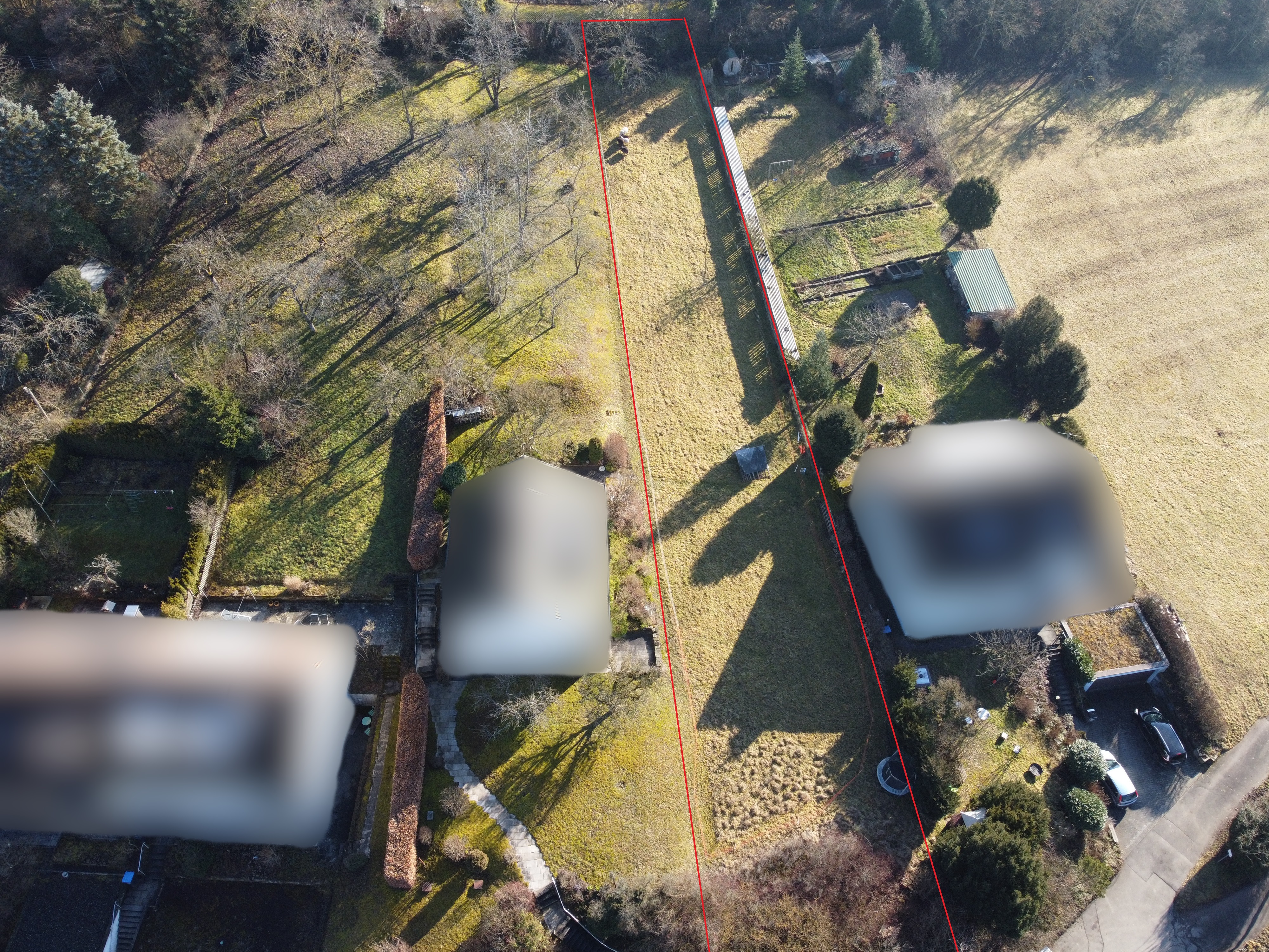 Die Breite des Platzes ist ca. 16 m. Er liegt höher als die Strasse, Garagen und Hauszugang kann optimal in das Grundstück integriert werden.