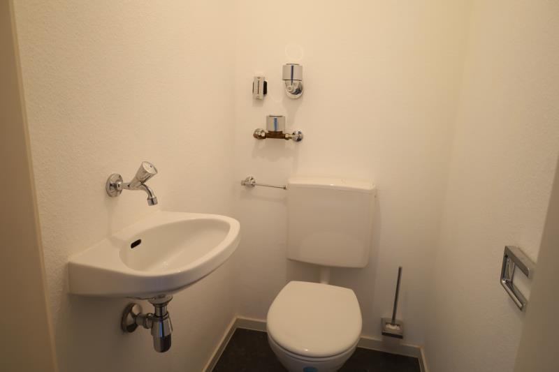 Auf der linken Seite geht es in die moderne und neuwertige Einbauküche, hier genießt man beim Kaffee die ersten Sonnenstrahlen. Das gut ausgestattete Badezimmer mit Tageslicht bietet neben einem großen Waschtisch eine Dusche sowie eine Badewanne.