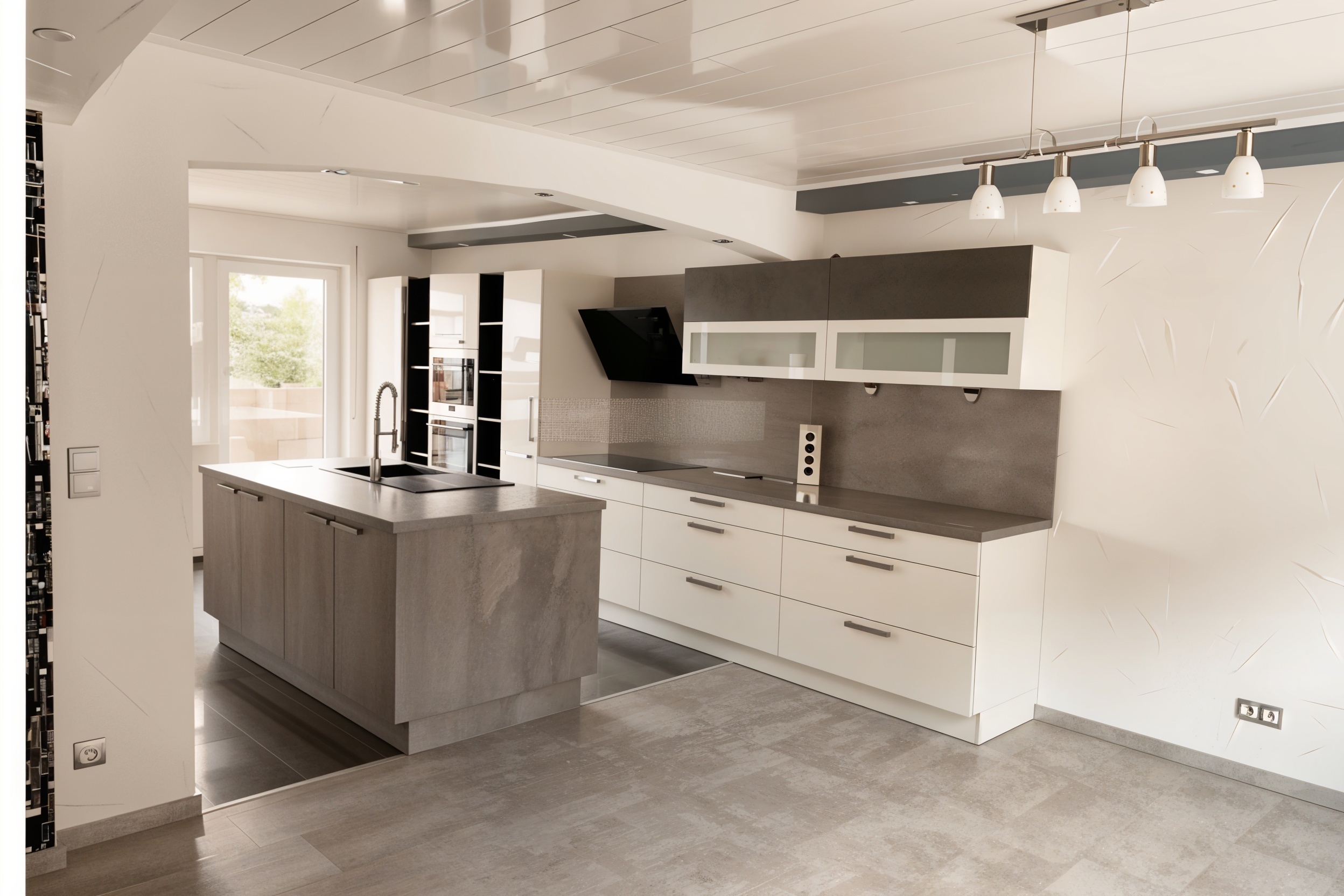 Die modern gestaltete weiß-anthrazitfarbene Einbauküche mit hochwertigen Siemens-Geräten ist eingelagert und kann nach Bodenverlegung direkt aufgebaut werden.