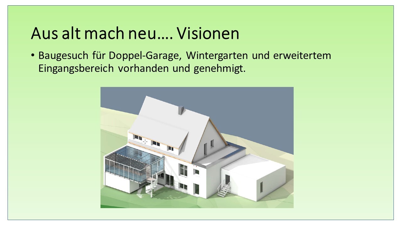 Das geräumige Einfamilienhaus wurde vor rund 2 Jahren von den aktuellen Eigentümern entkernt. In diesem Zug wurden bereits viele Vorarbeiten wie der Rückbau und die Entsorgung von Altlasten oder die Sanierung von Mängeln geleistet. Zudem wurde ein neues Baugesuch erstellt, in welchem der Anbau eines Wintergartens, einer Doppelgarage und ein erweiterter Eingangsbereich genehmigt wurden.
