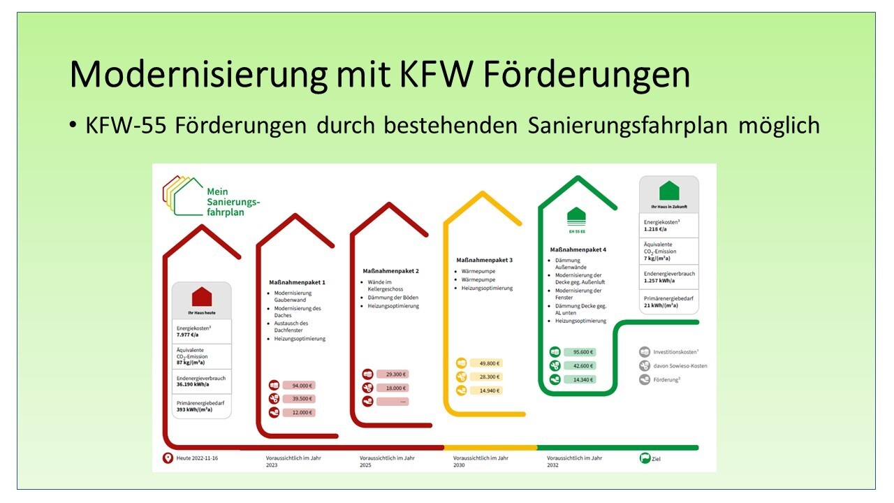 Aufgrund des Bedarfsausweises des Hauses (der Energiebedarf beträgt 341,9 kWh, Effizienzklasse H) ist mit höheren Zuschüssen zu rechnen. Die Eigentümer haben bereits genehmigte Forderungen vorliegen und einen Sanierungsfahrplan, um den KFW-Standard 55 zu erreichen, aufstellen lassen.