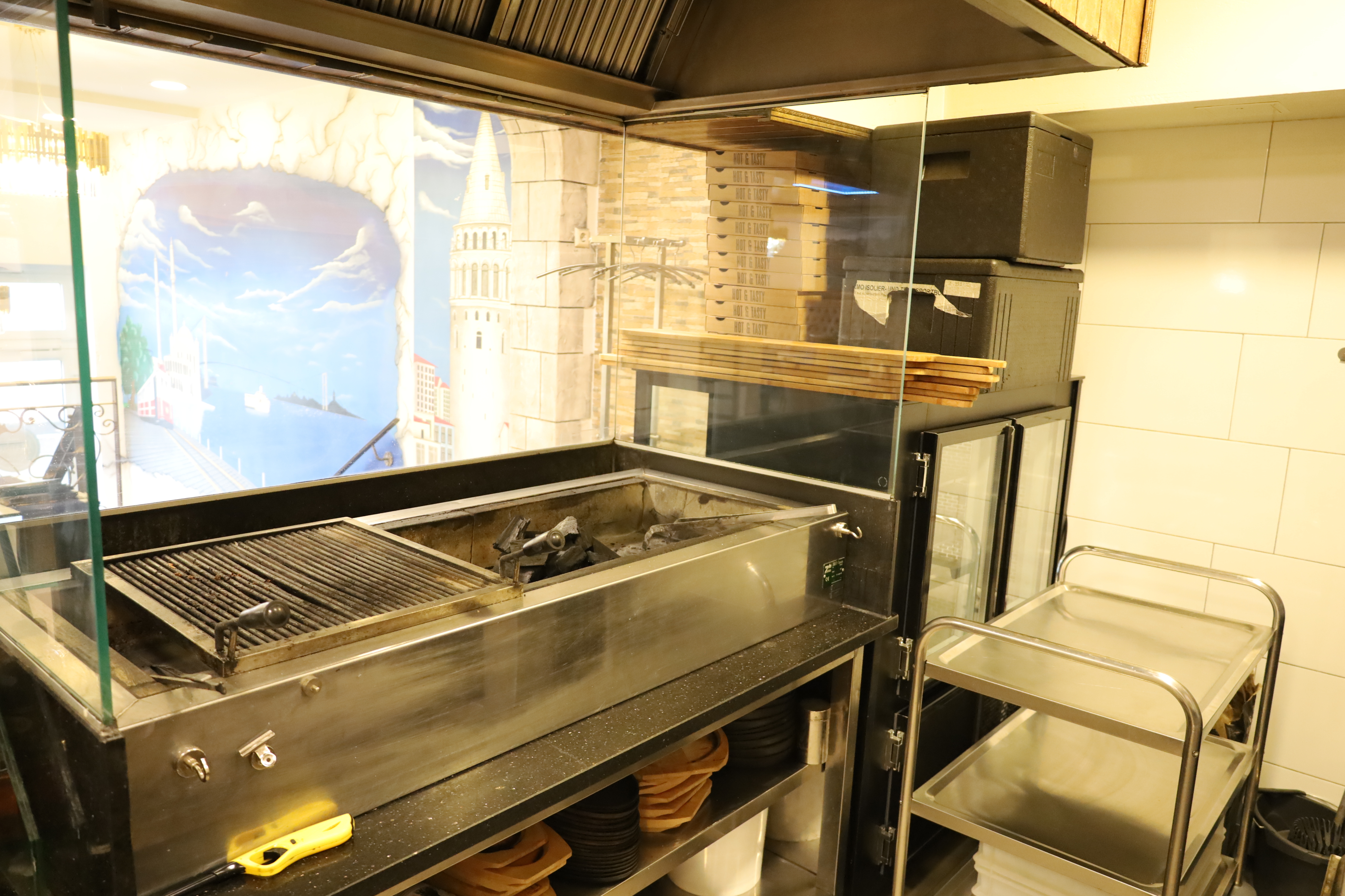 – Gastroküche mit Gasherd, Spülmaschine, Kühltheke, Pizzaofen, Holzkohle-Grill