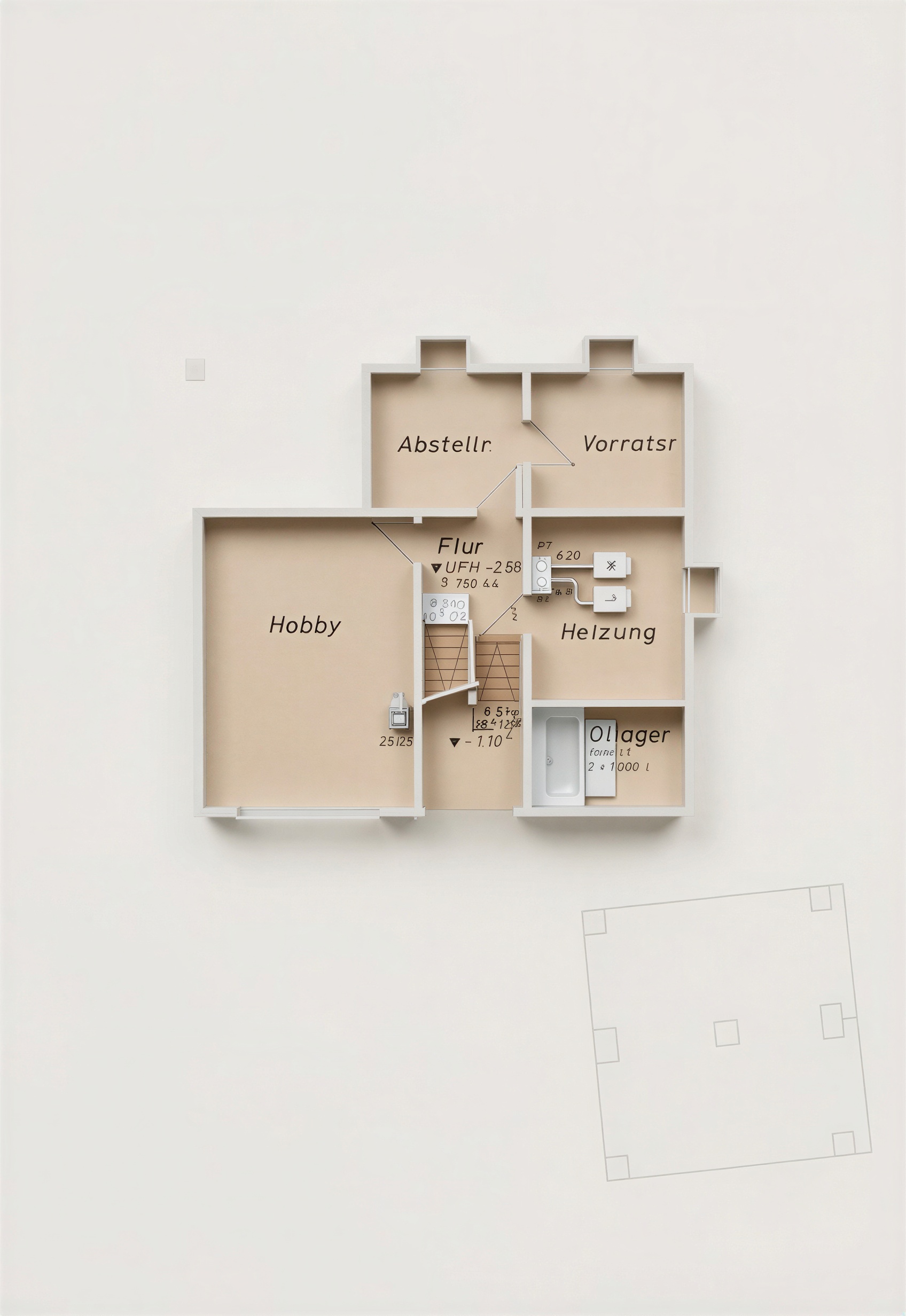 Das Untergeschoss hat ein großes Zimmer, dahinter ist die Waschküche mit einem weiteren Badezimmer. Zwei Kellerräume zum Abstellen, die Heizung und der Öllagerraum sind im hinteren Bereich des Kellers.
