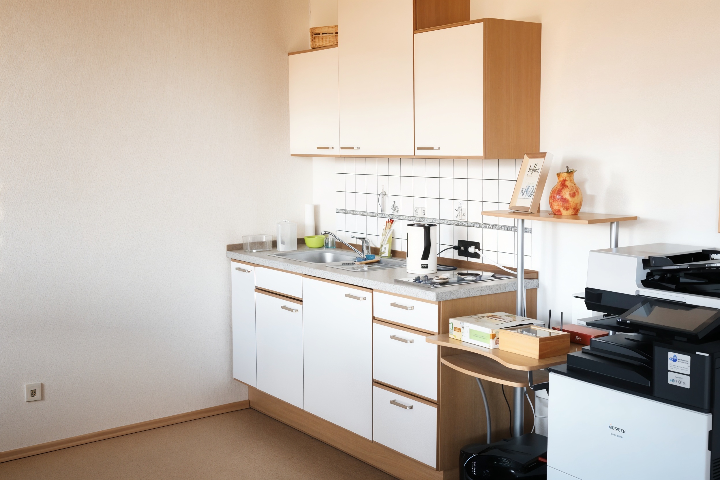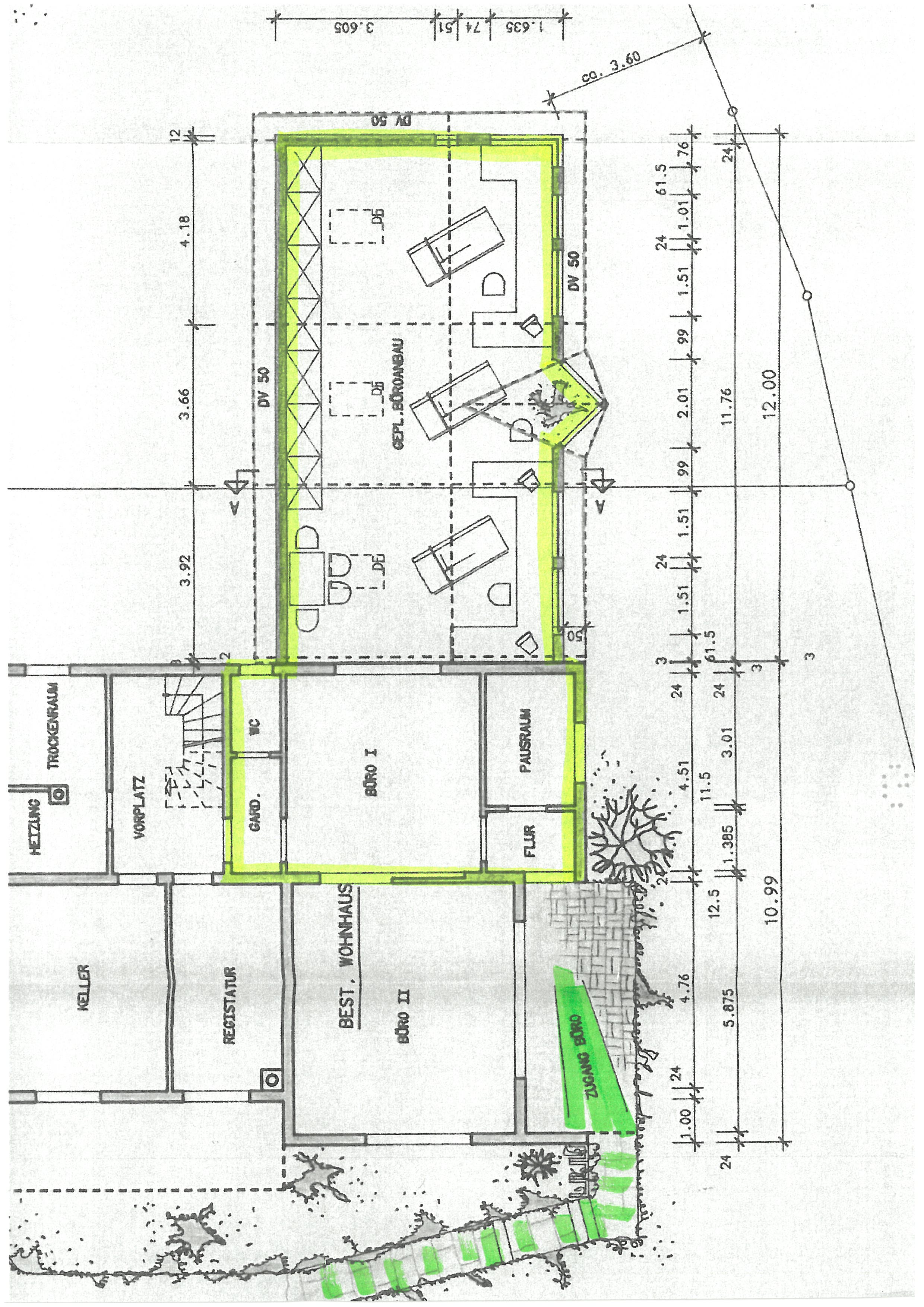 Der Anbau hat eine Fläche von ca. 70 m², dazu gehört noch ein weiteres separate Büro mit ca. 20 m² , ein kleiner Abstellraum, WC und Garderobenbereich. Bei Bedarf wäre noch ein Archiv mit ca. 10 m² verfügbar.