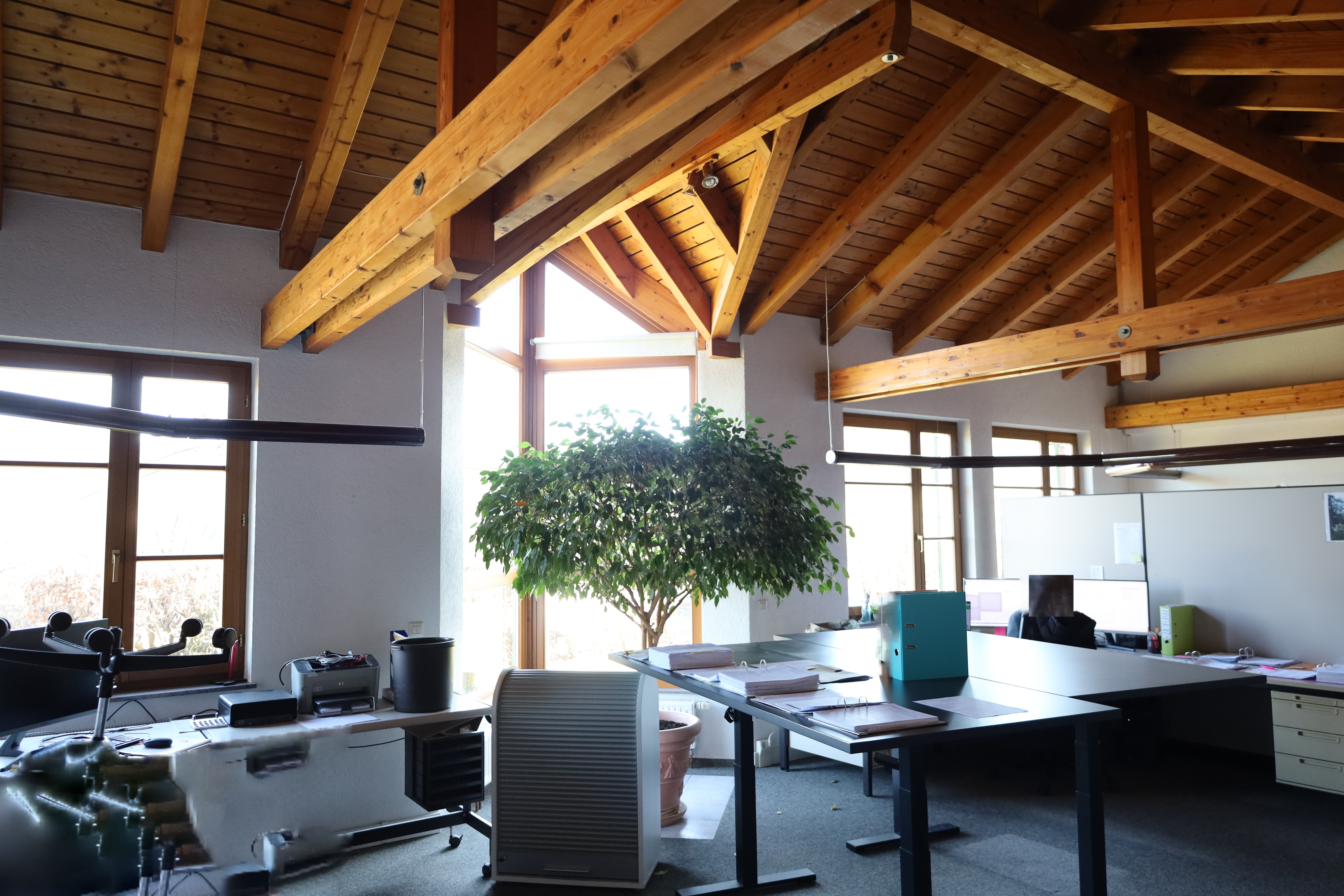 Gut ausgestattete Räume mit besonderer Architektur. Die offene Holzkonstruktion erzeugt Raum und Fläche, bodentiefe Fenster und die Aussicht ins Grüne machen das Angebot sehr attraktiv. Aktuelle ist der Boden mit Teppich ausgelegt.