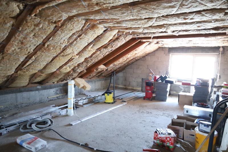 Das Dachgeschoss mit einem Balkon ist isoliert und zum Ausbau vorbereitet.