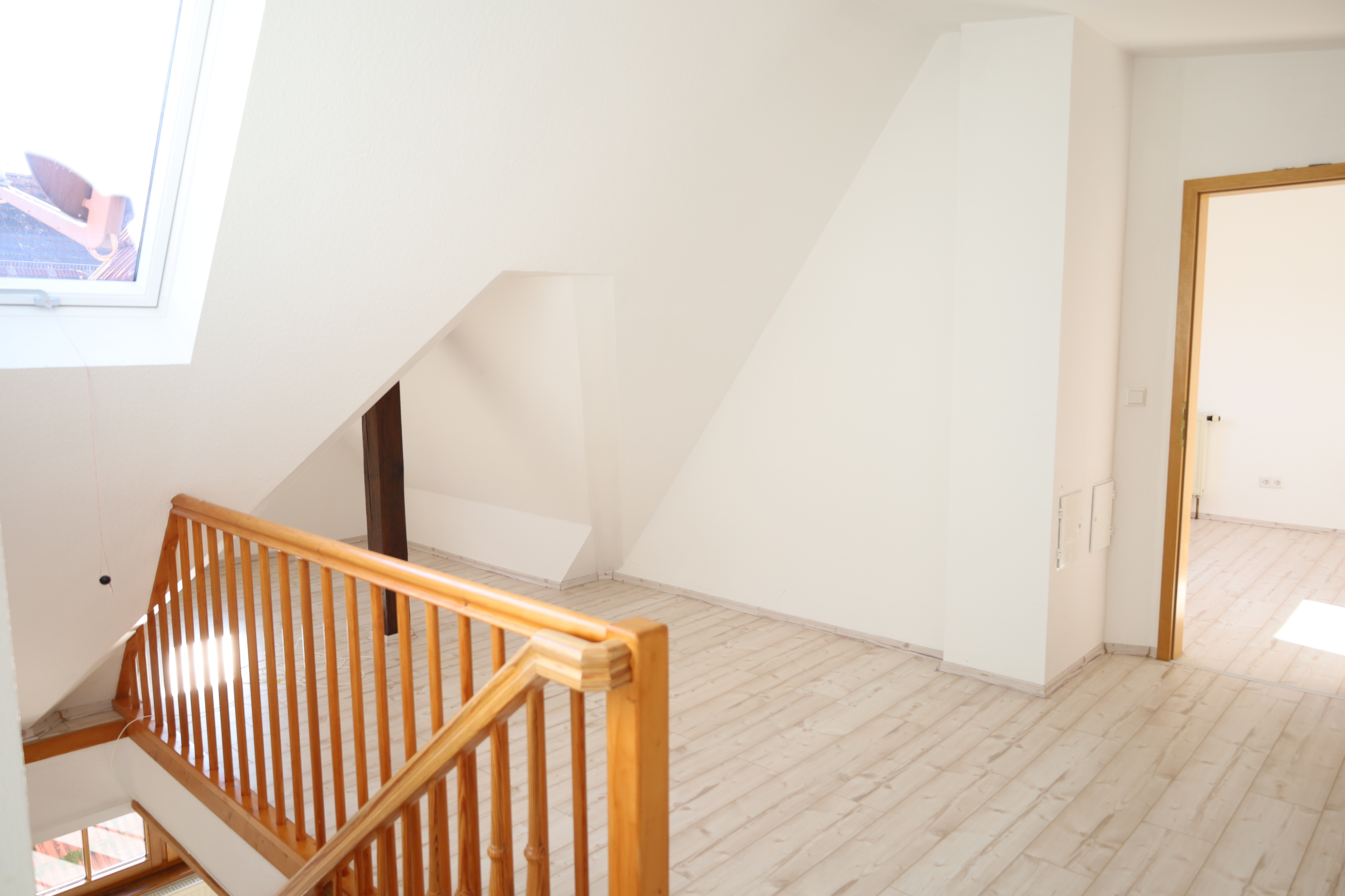 Über eine stilvolle Holztreppe gelangen Sie vom Wohnbereich ins zweite Dachgeschoss. Dort erwarten Sie zwei weitere Zimmer – eines davon ist ein Durchgangszimmer, das flexibel genutzt werden kann, beispielsweise als Ankleidezimmer, Gästezimmer oder Büro. Auch hier erwartet Sie ein weiteres Badezimmer mit Badewanne und großem Dachfenster das für Tageslicht sorgt.